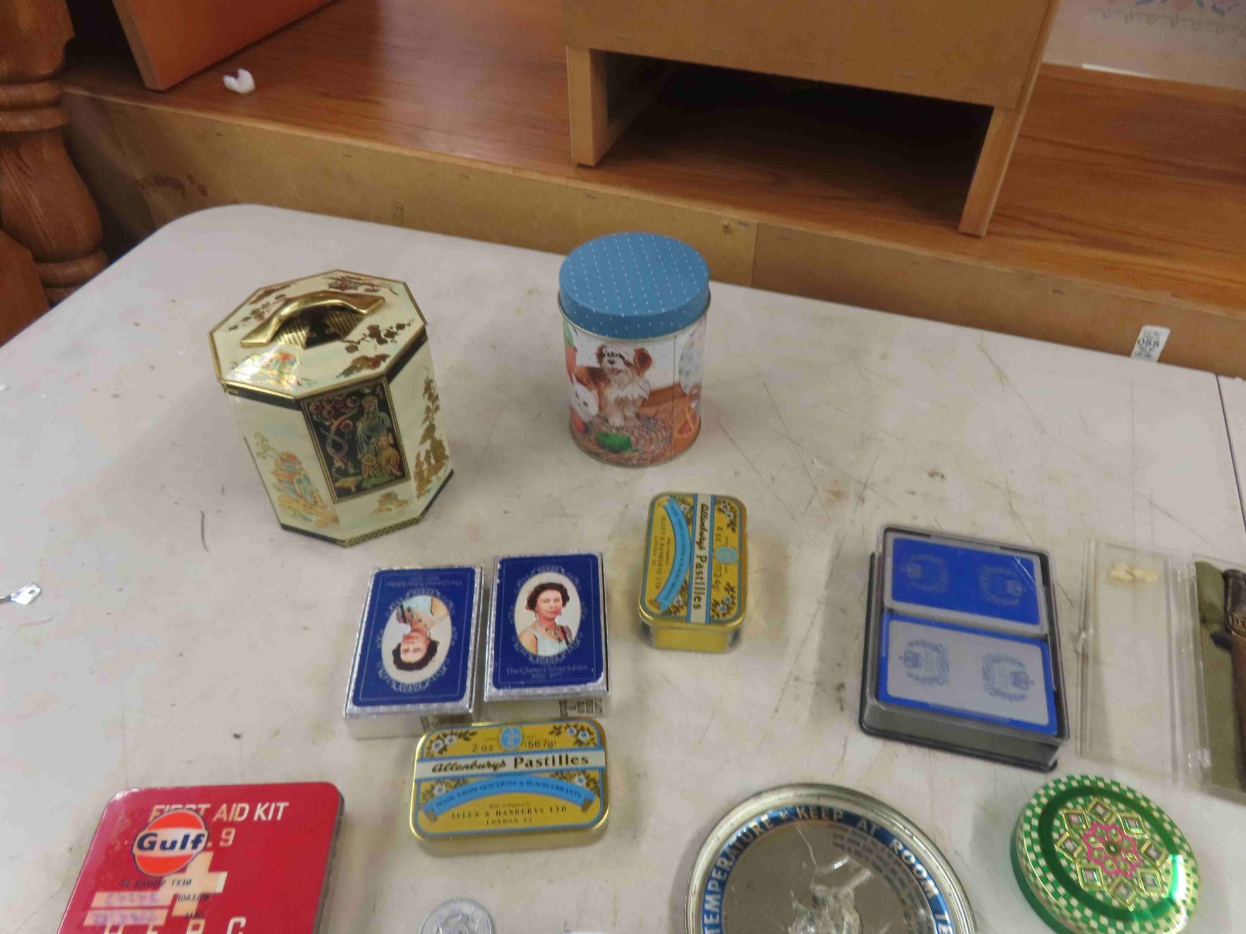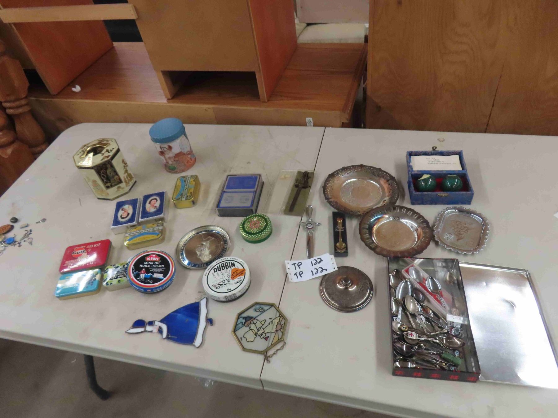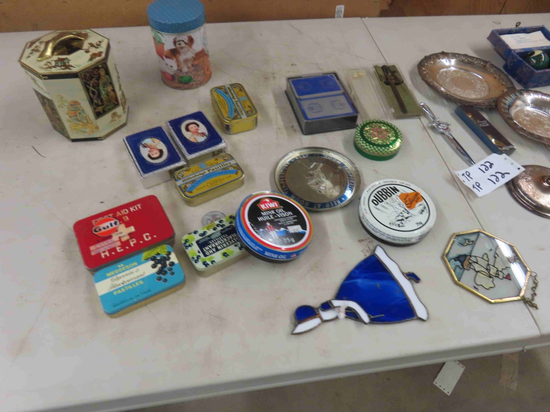 Tins, Silverware, Gulf 1st Aid Kit, Letter Opener, Oriental Iron Ball, plus more