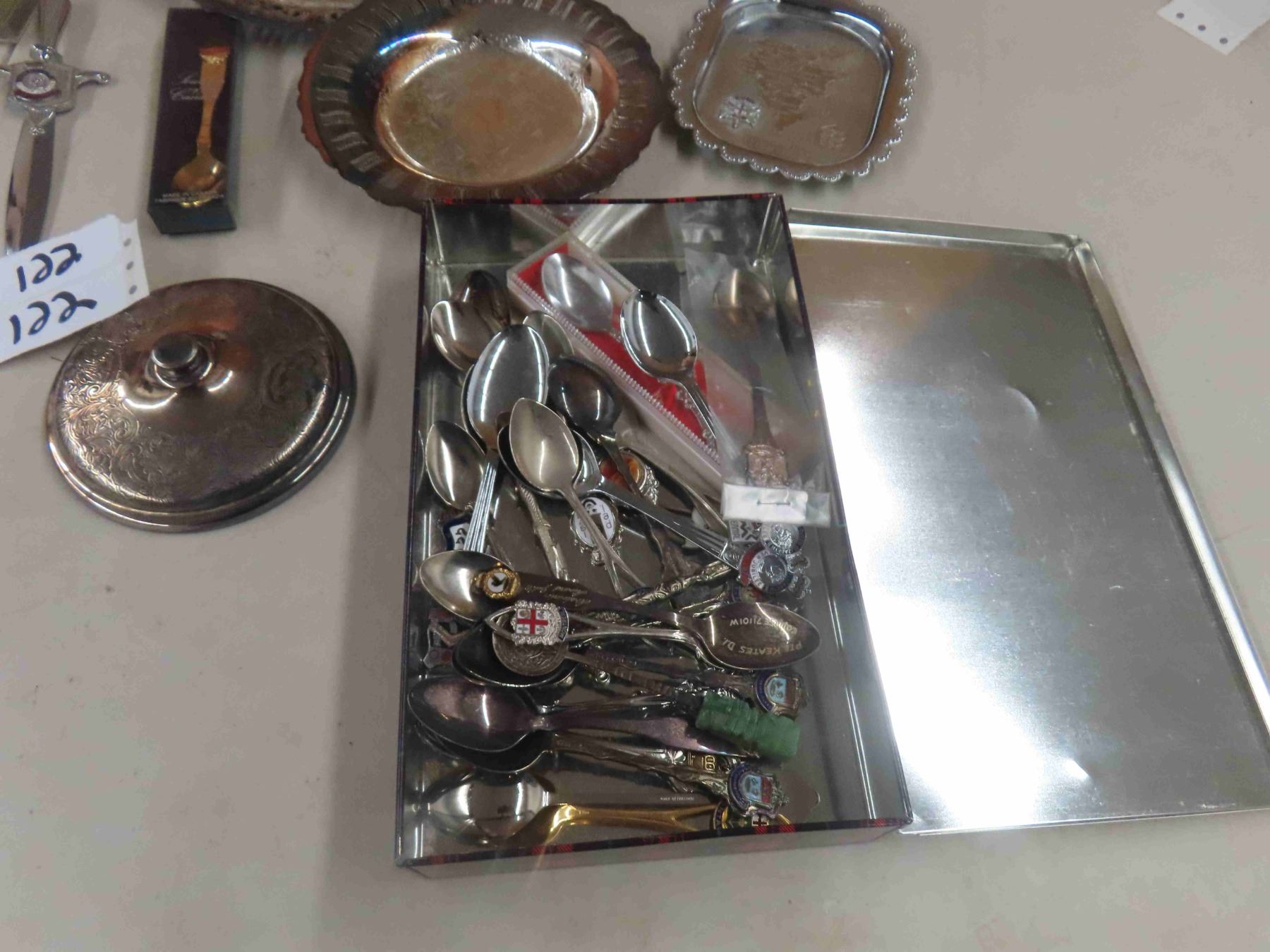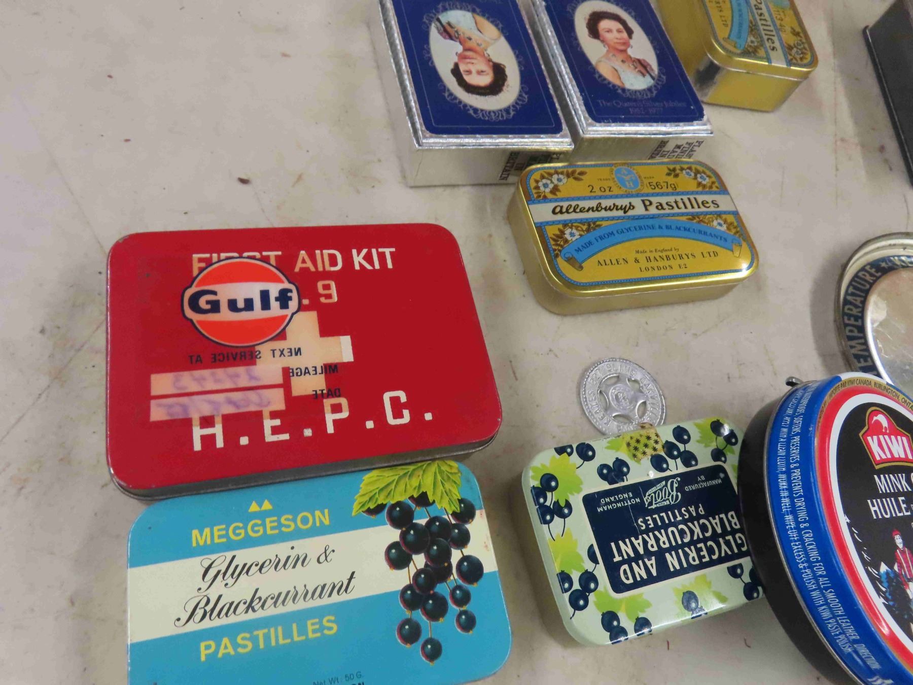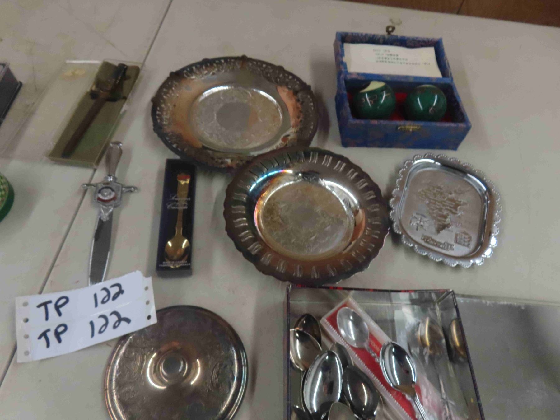 Tins, Silverware, Gulf 1st Aid Kit, Letter Opener, Oriental Iron Ball, plus more