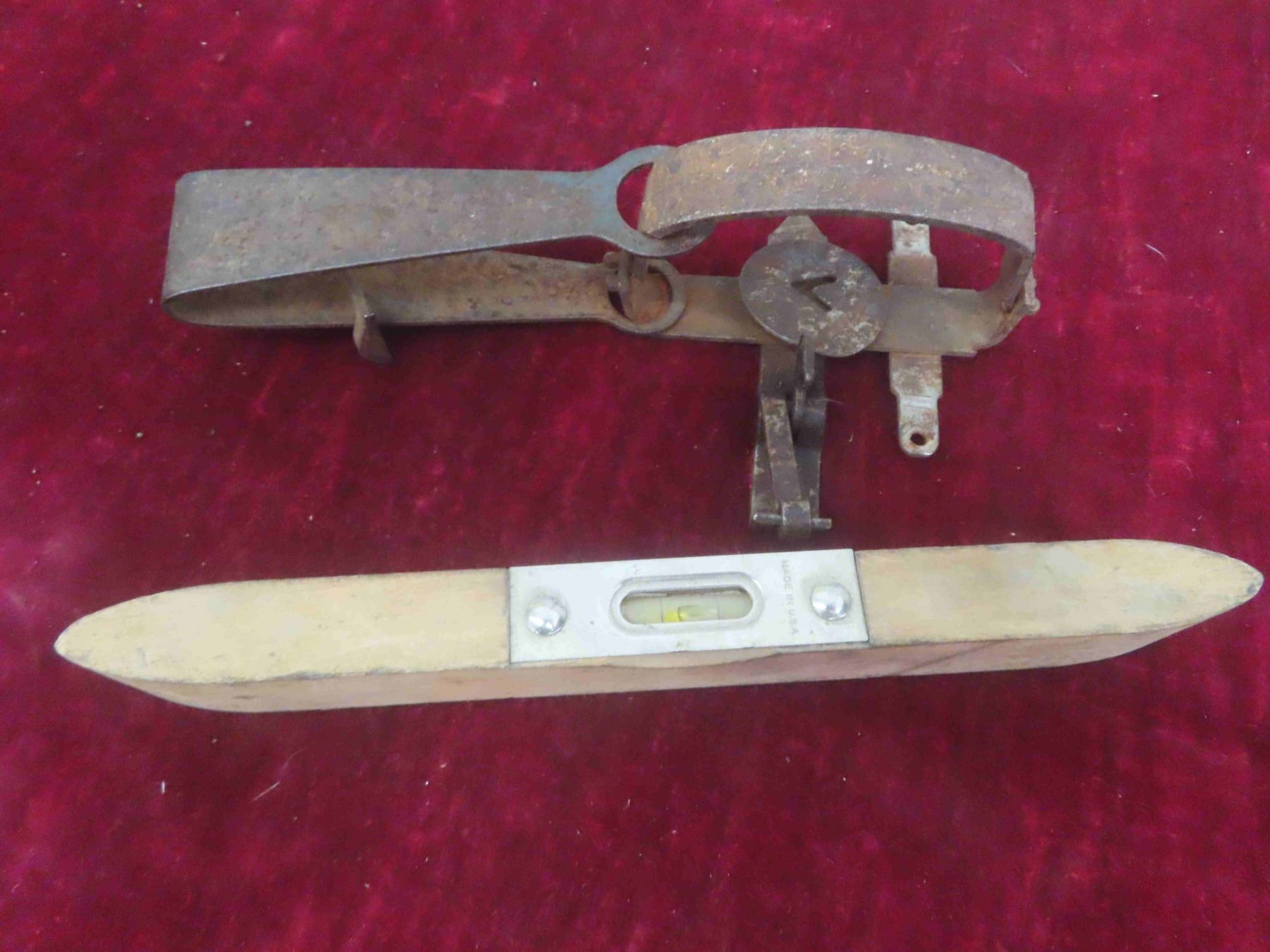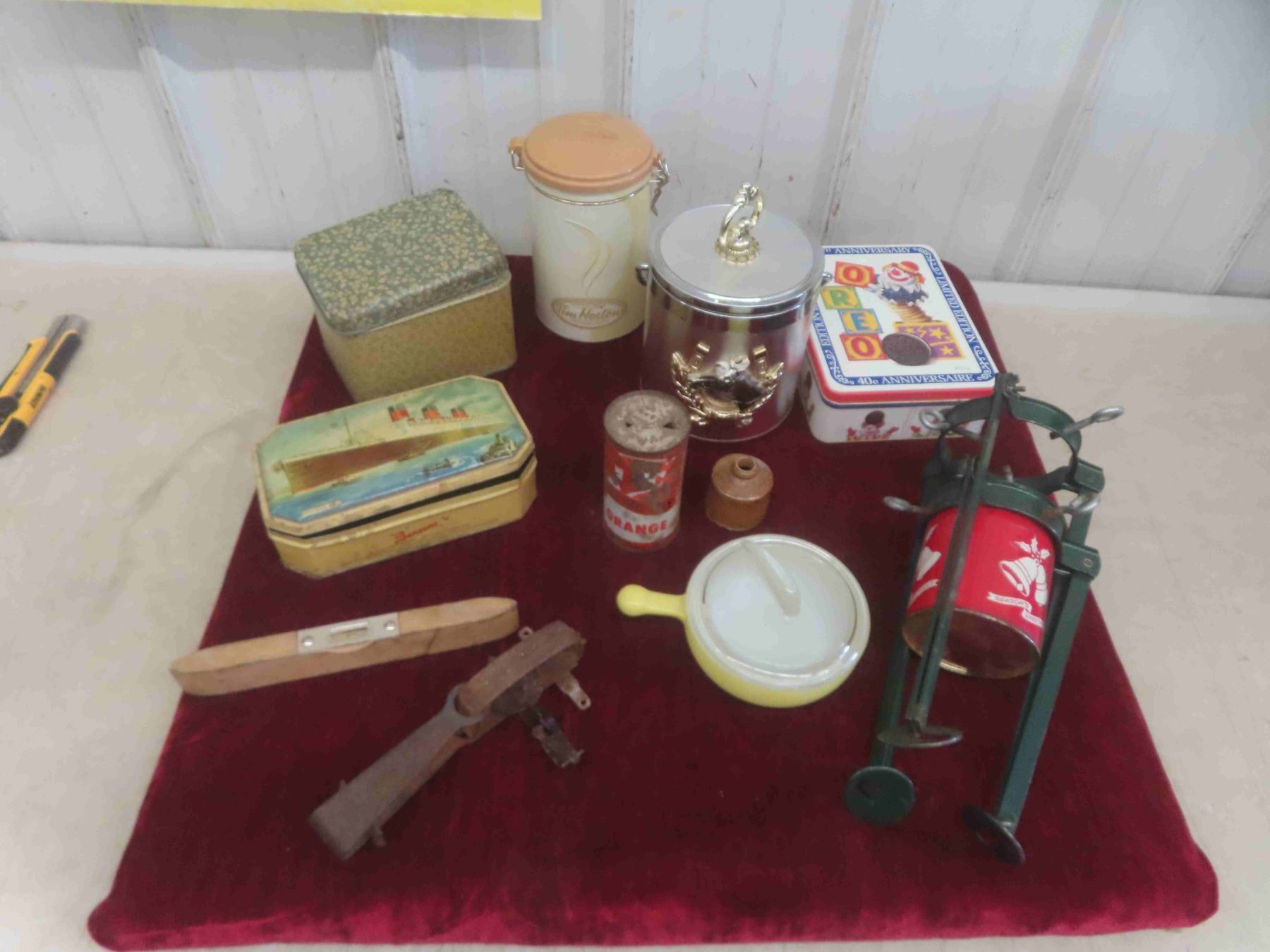 Tins, Vintage Old Country Orange Tin Trap, Level, Glass Bake Bowl w/ Lid Xmas Tree Stand