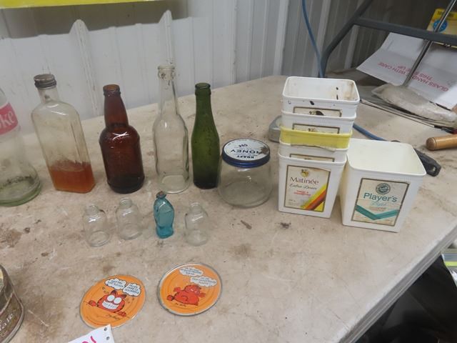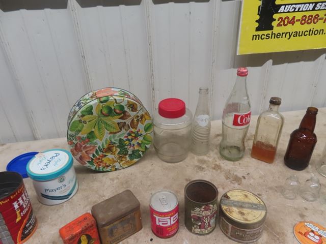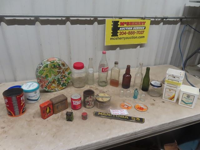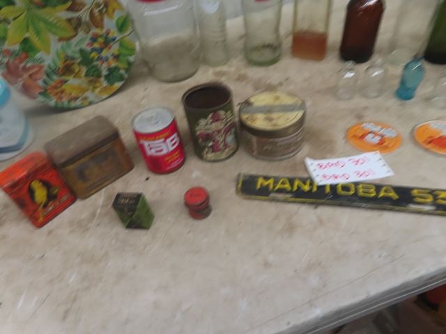 Tobacco Tins; Prince of Whales, Chateau , Pop Bottles , VArious Other Tins and Bottles & 1953 MB License Tag