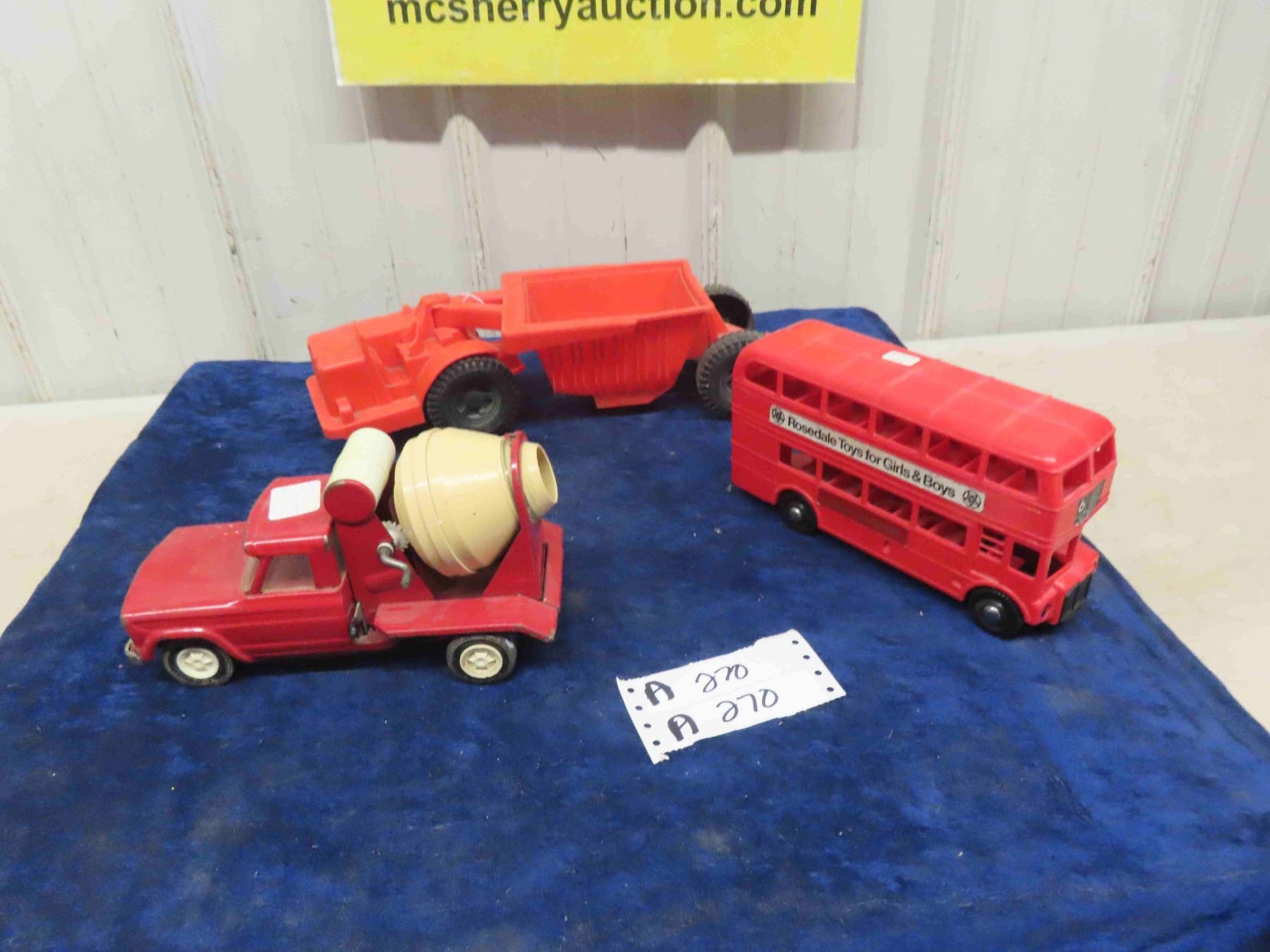 Tonka Metal Cement Truck, Plastic Reloadable Scrape/ Buggy, Plastic Double Decker Bus - Rosedale