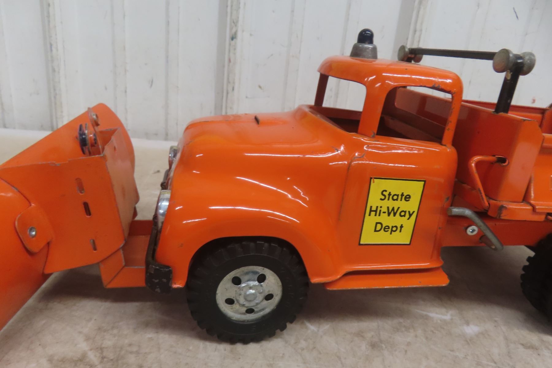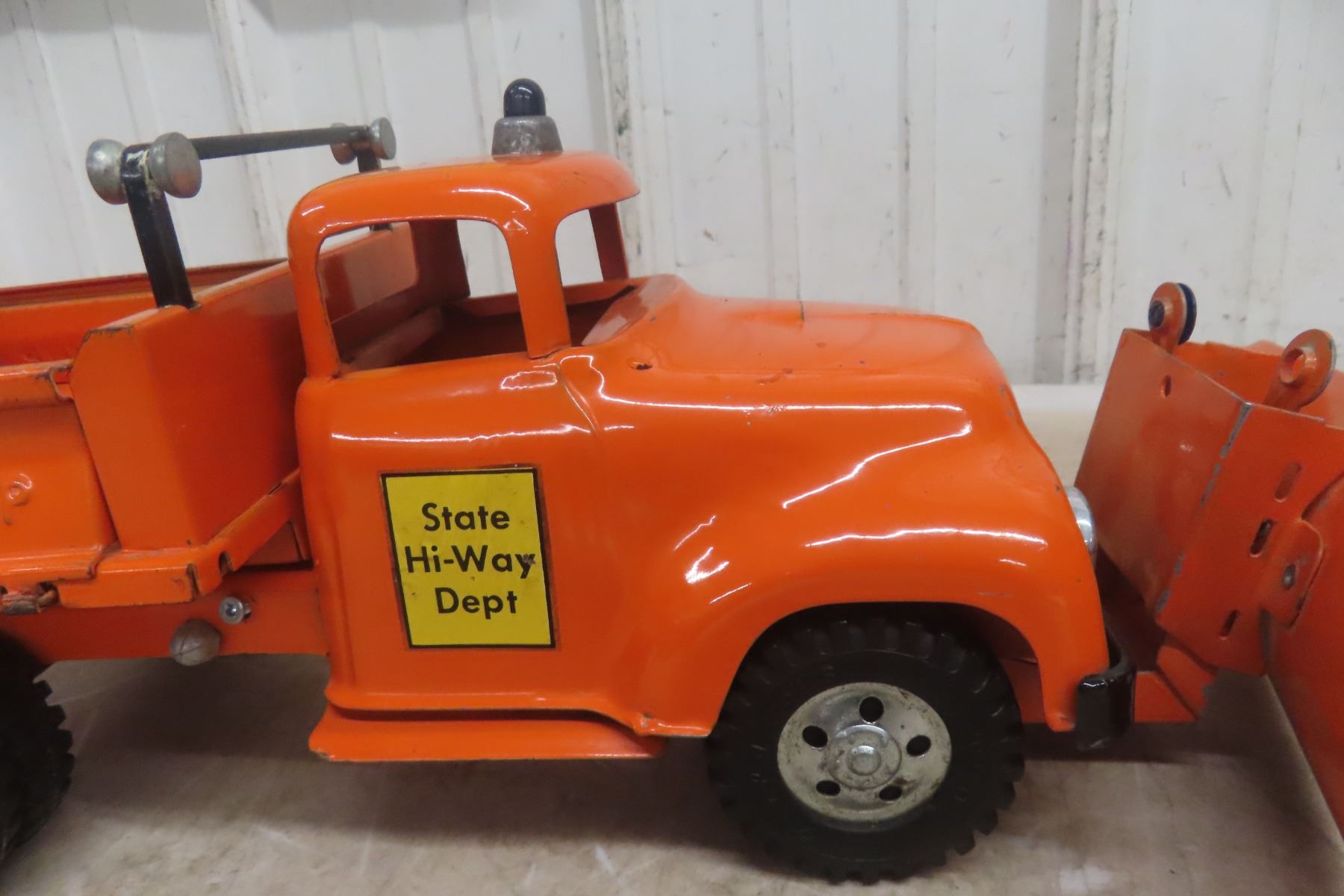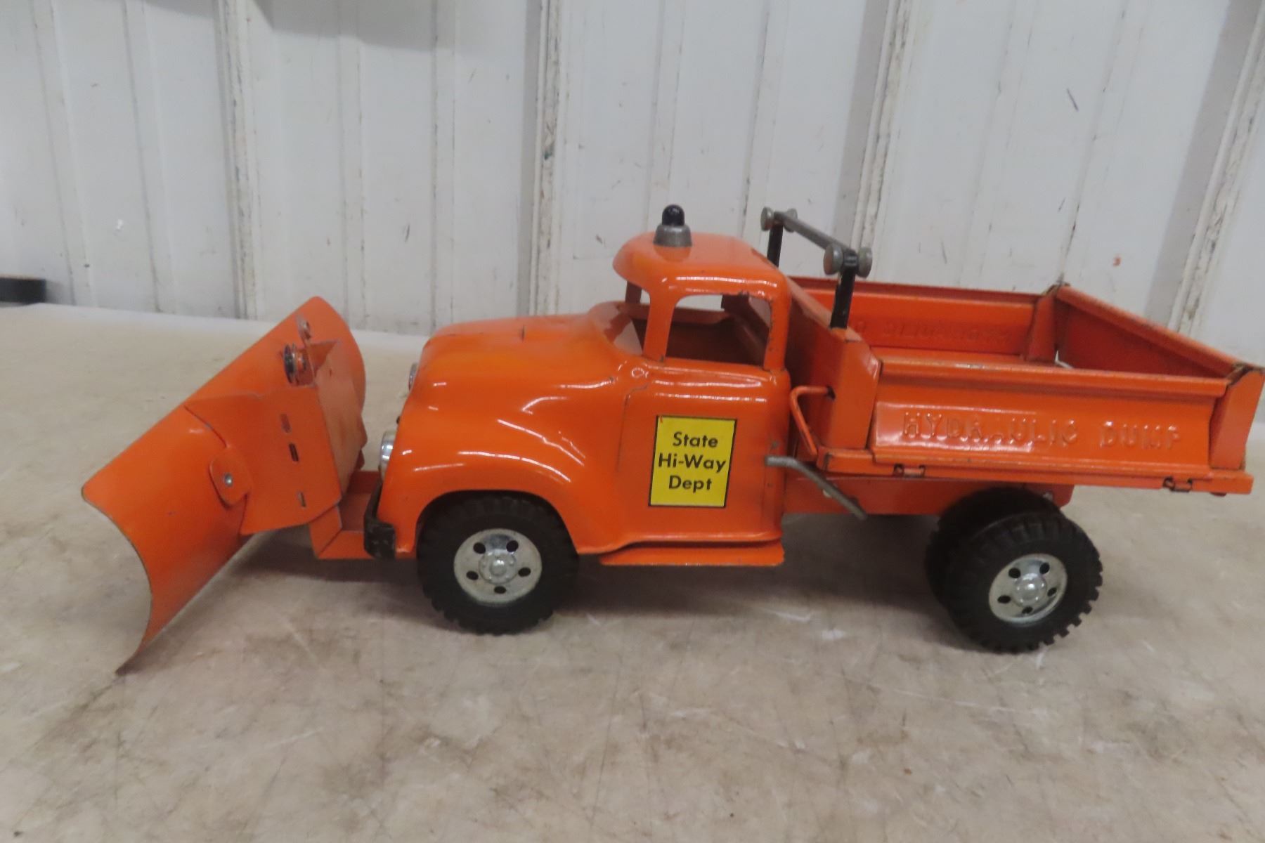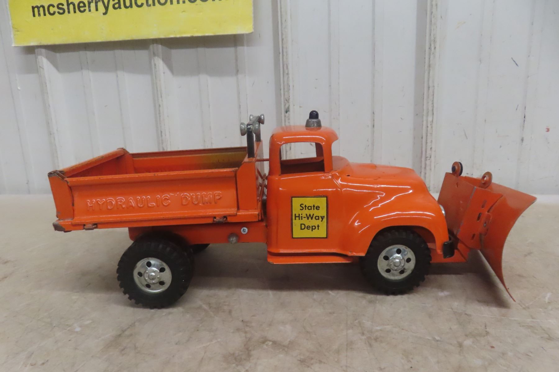 Tonka State Highway Dept Hydraulic Dump Truck with Snowplow Pressed Metal 1956 or 1957 15"