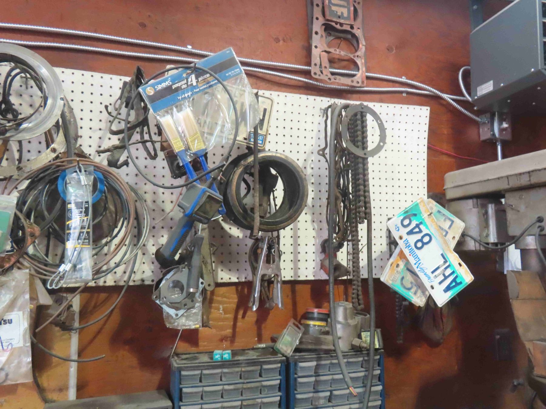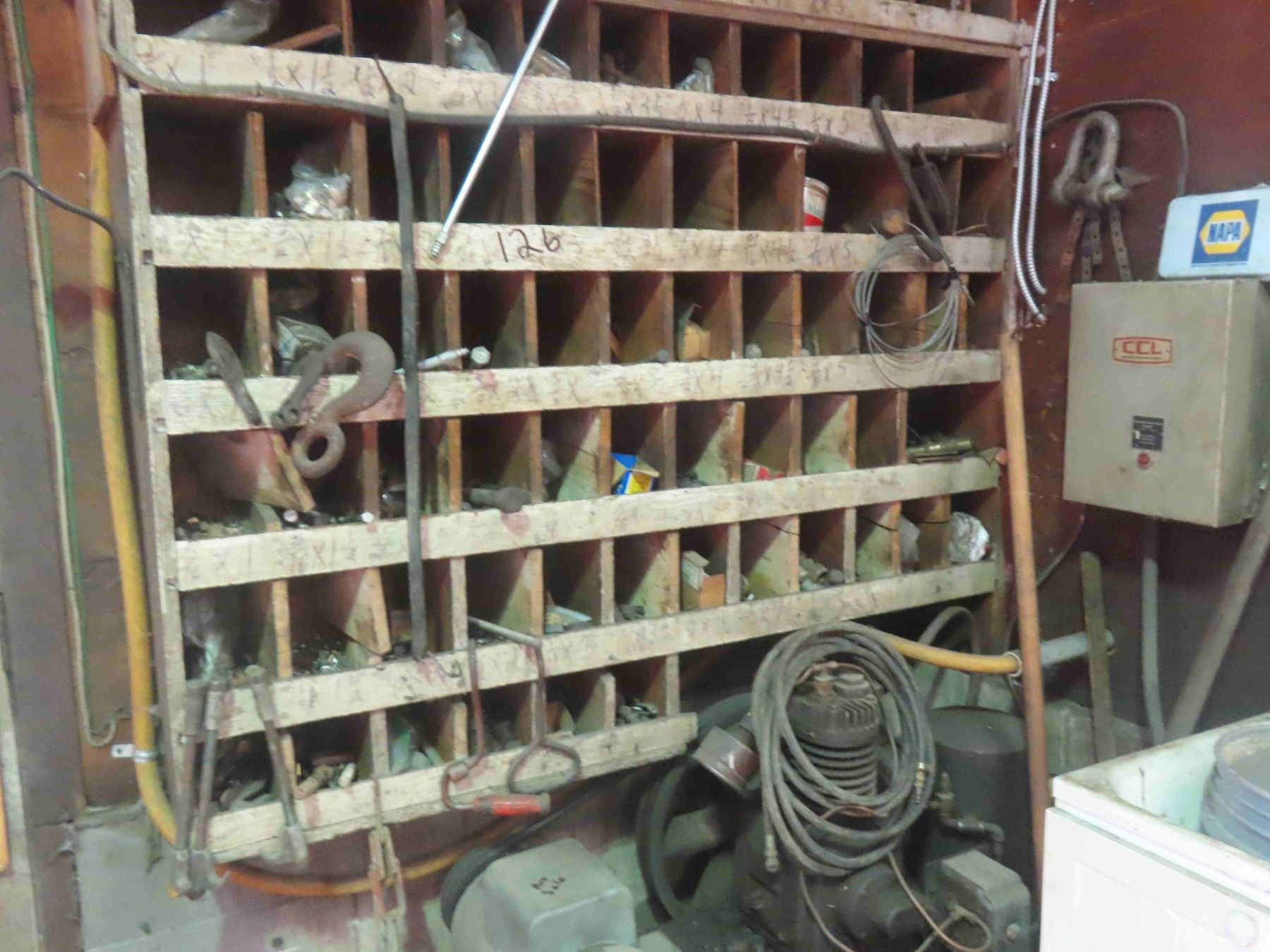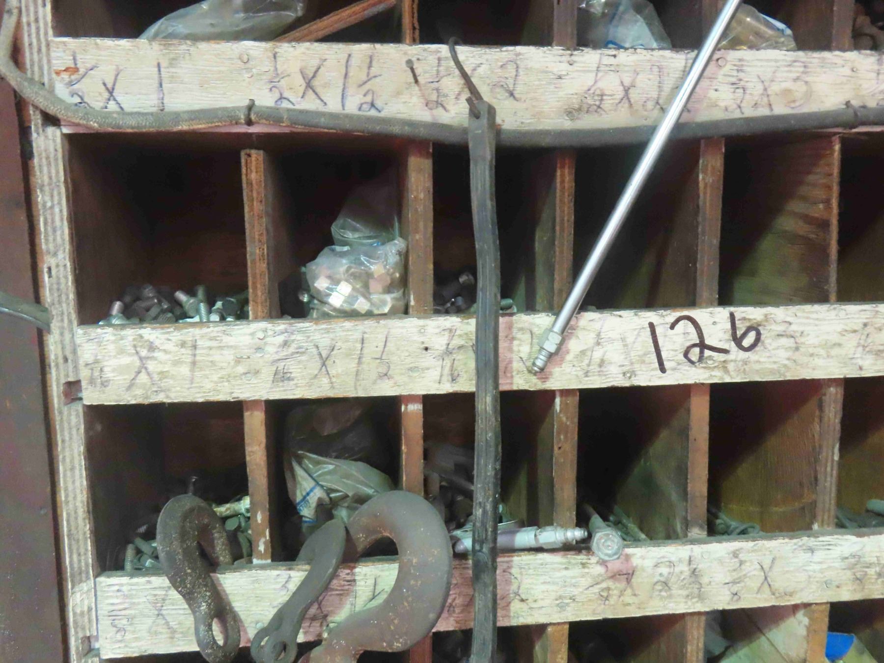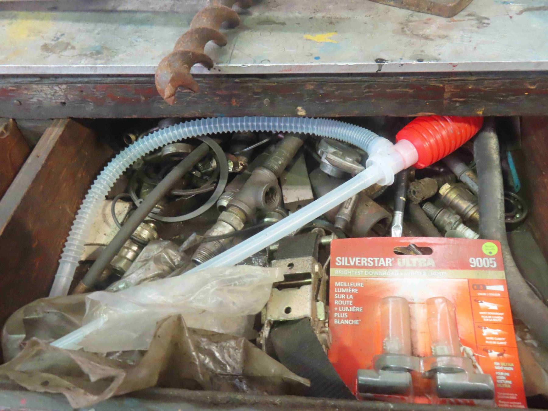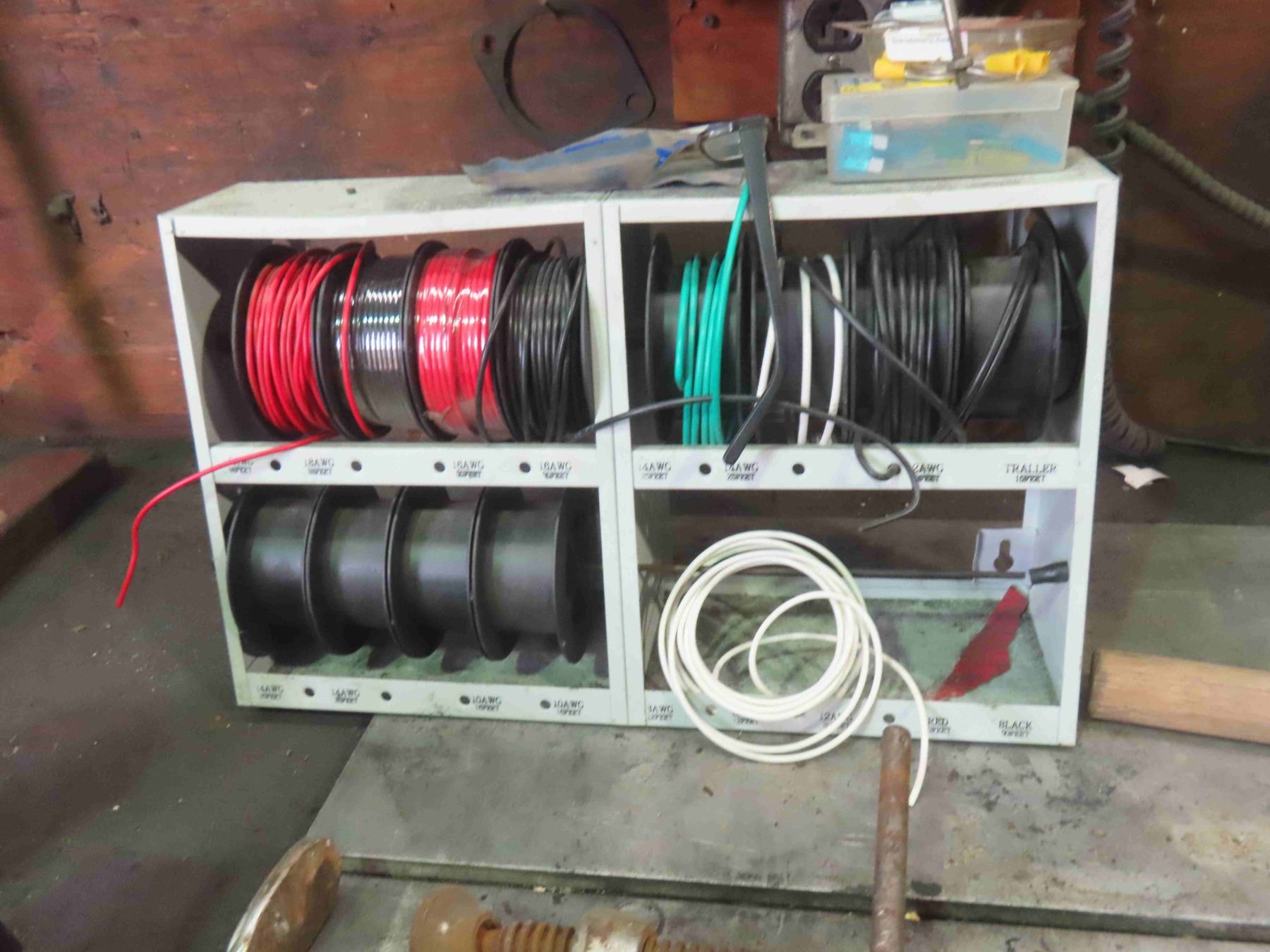 Tool Bench Full of Shop Items: Air Couplings, Trailer Lighting, Grease Guns, Clevers, Battery Terminal Cables, Seals, Connectors, Rolling Chains Organizers Full Of Wiring Kit, Electrical, Hole Saws, Pins, Grinding Stones, Pulleys, Misc Fasteners, Vise, Bench Grinder Tool Bench Not Included