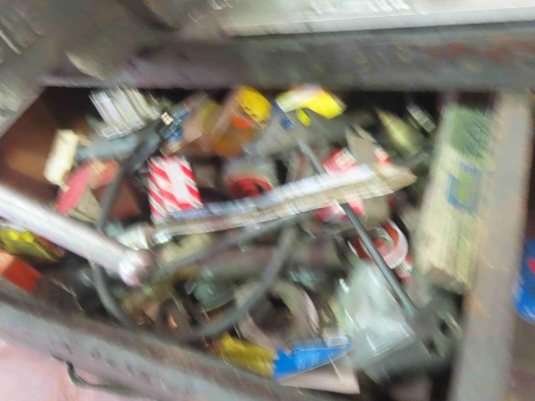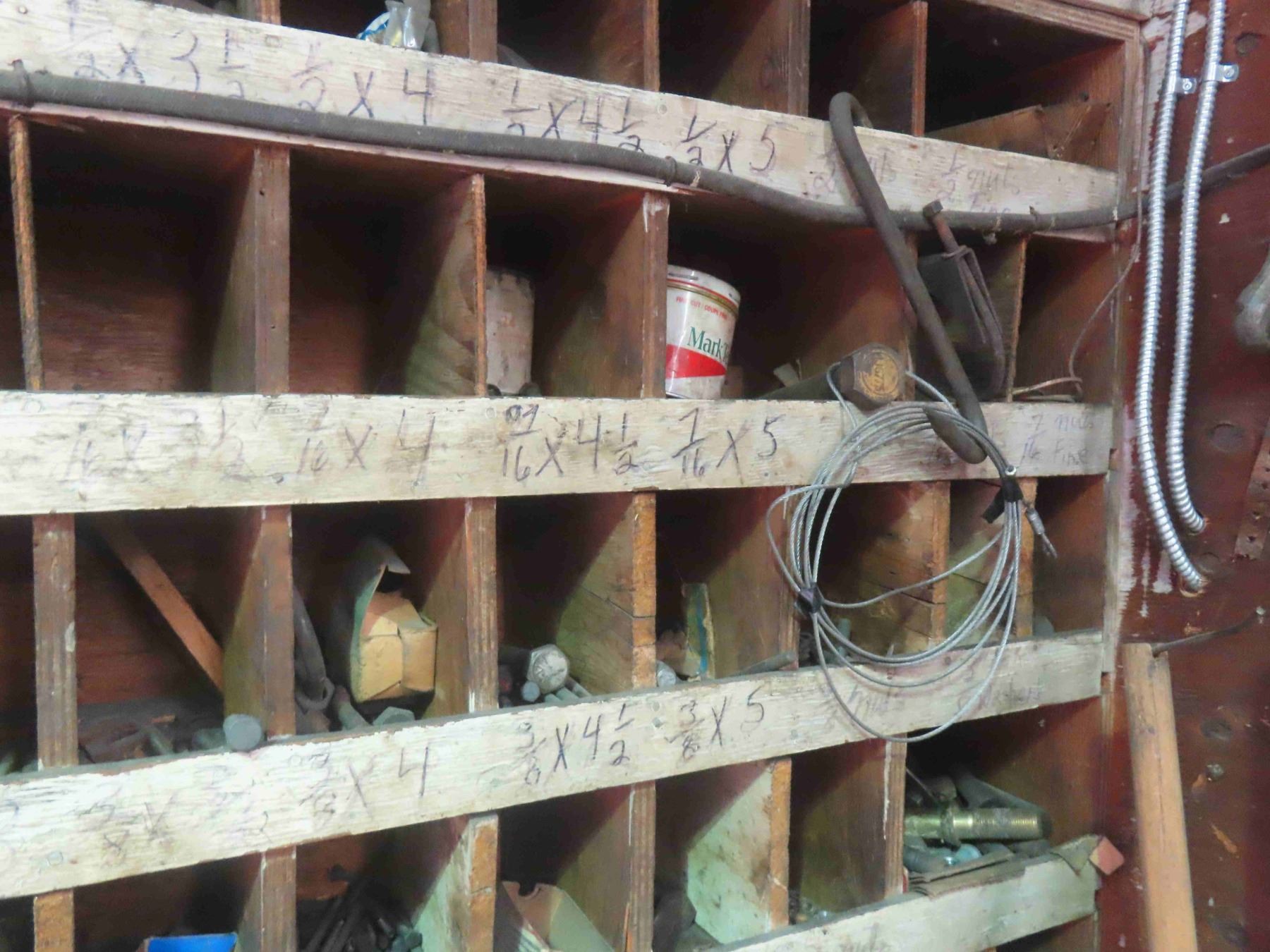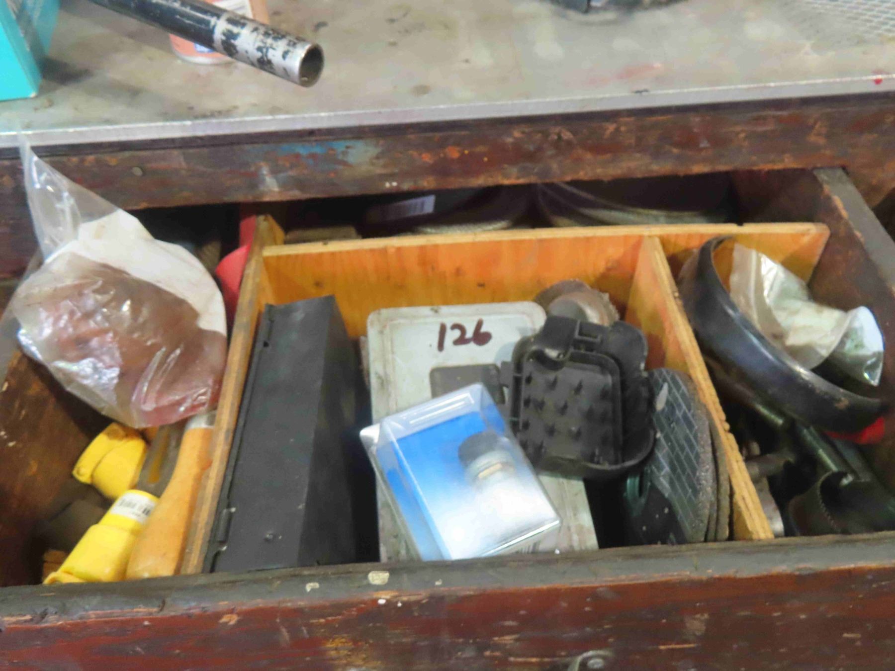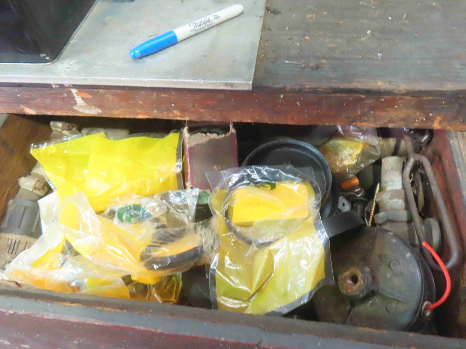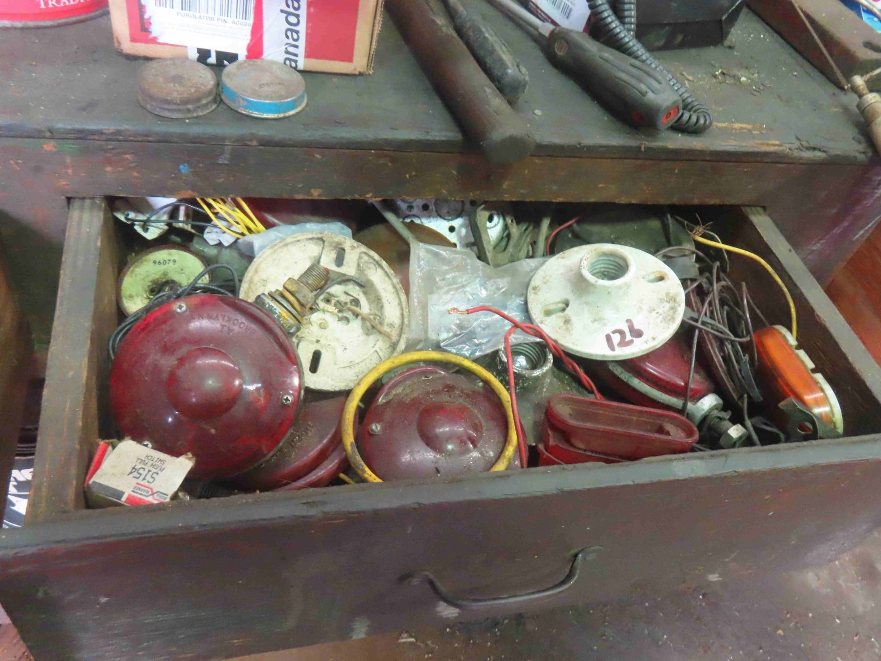 Tool Bench Full of Shop Items: Air Couplings, Trailer Lighting, Grease Guns, Clevers, Battery Terminal Cables, Seals, Connectors, Rolling Chains Organizers Full Of Wiring Kit, Electrical, Hole Saws, Pins, Grinding Stones, Pulleys, Misc Fasteners, Vise, Bench Grinder Tool Bench Not Included