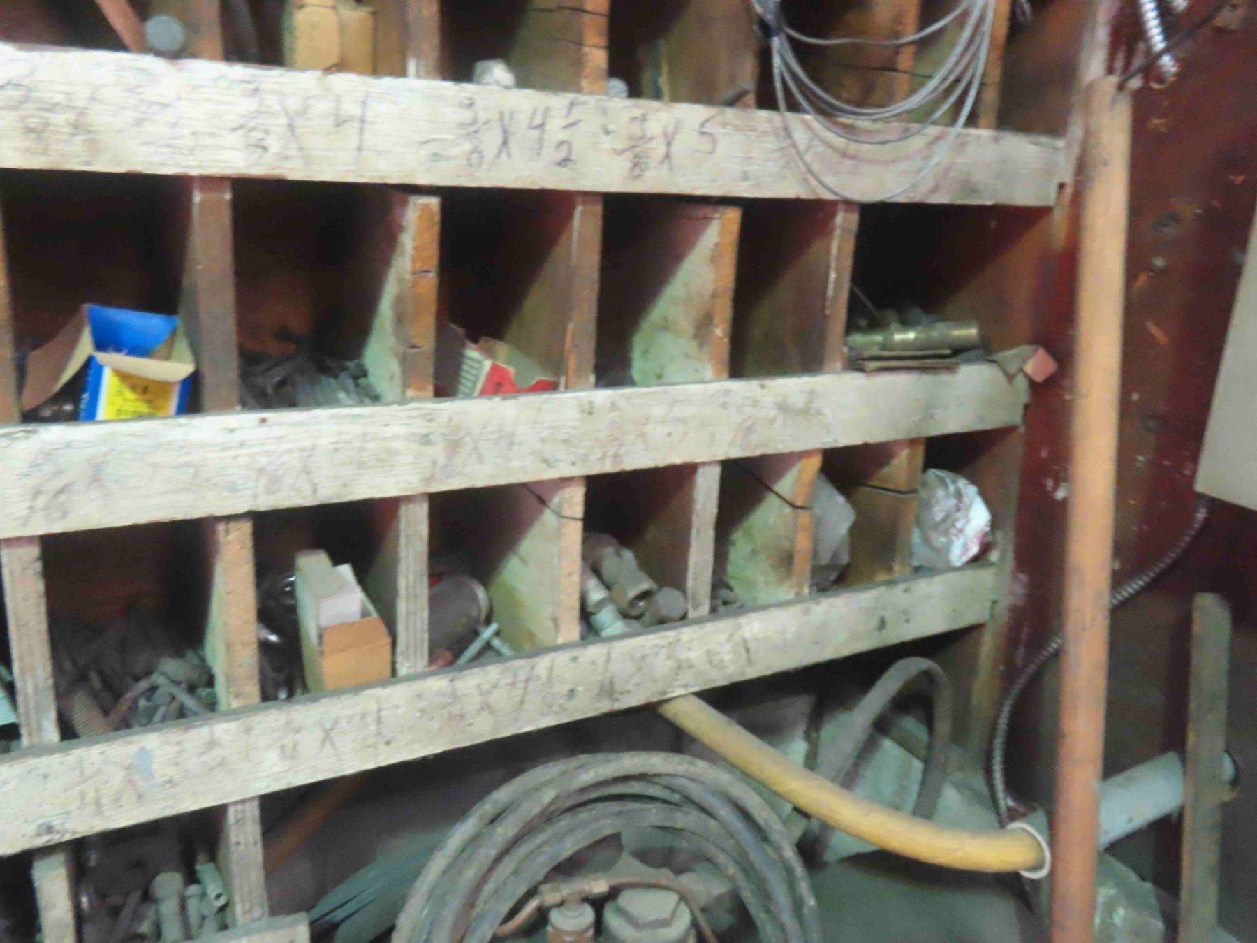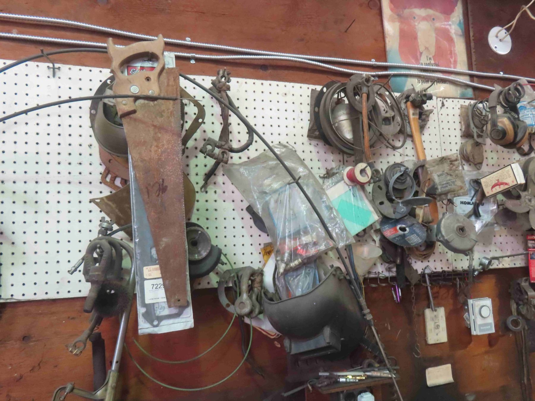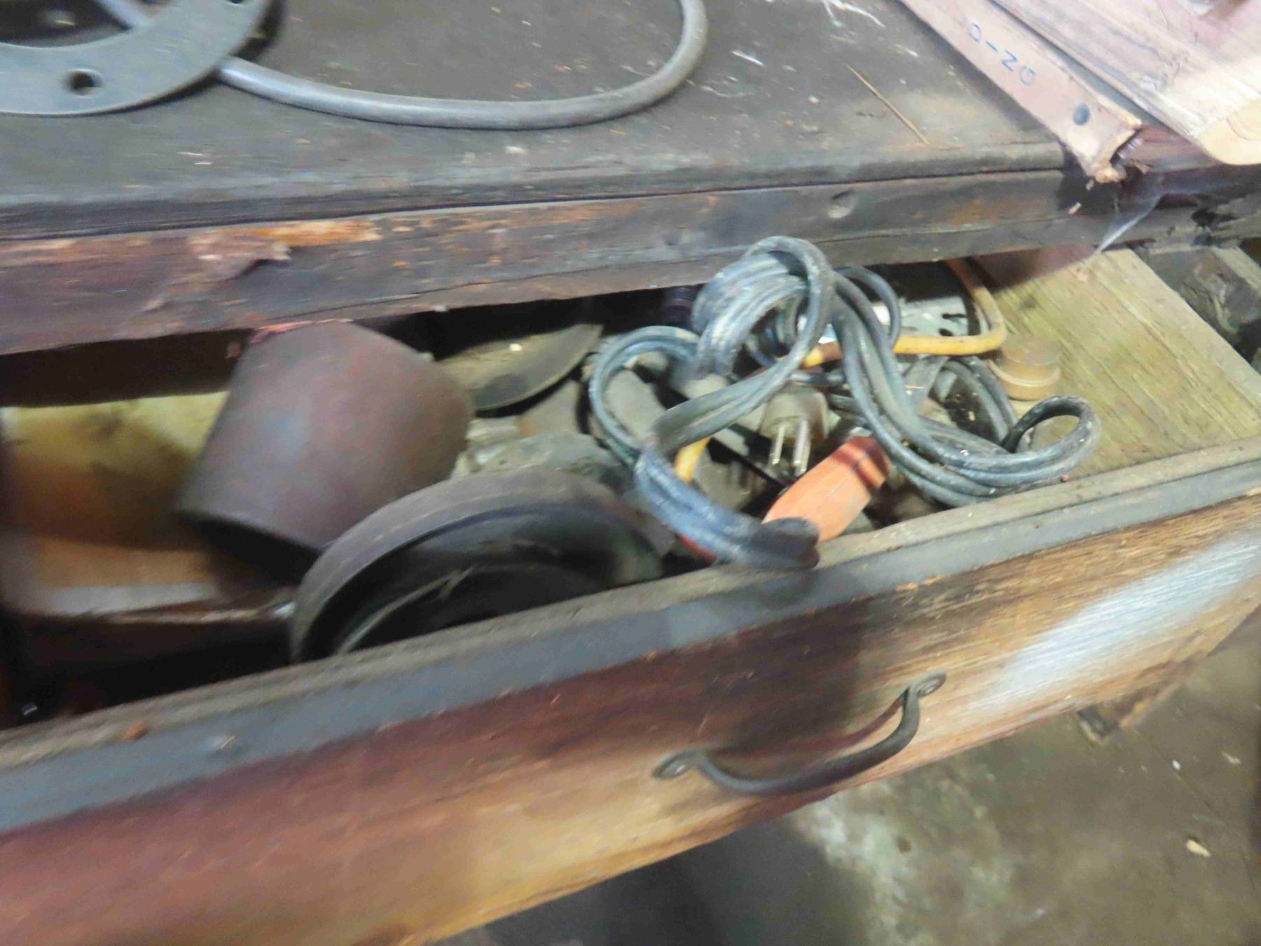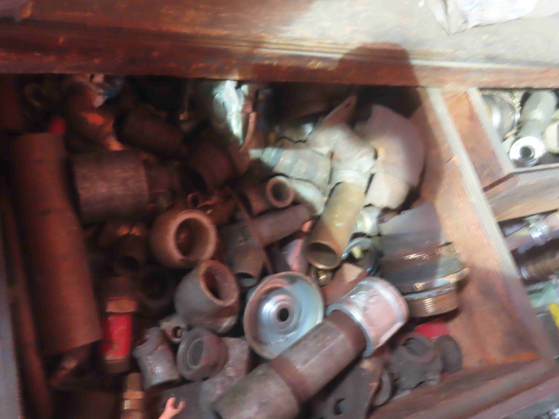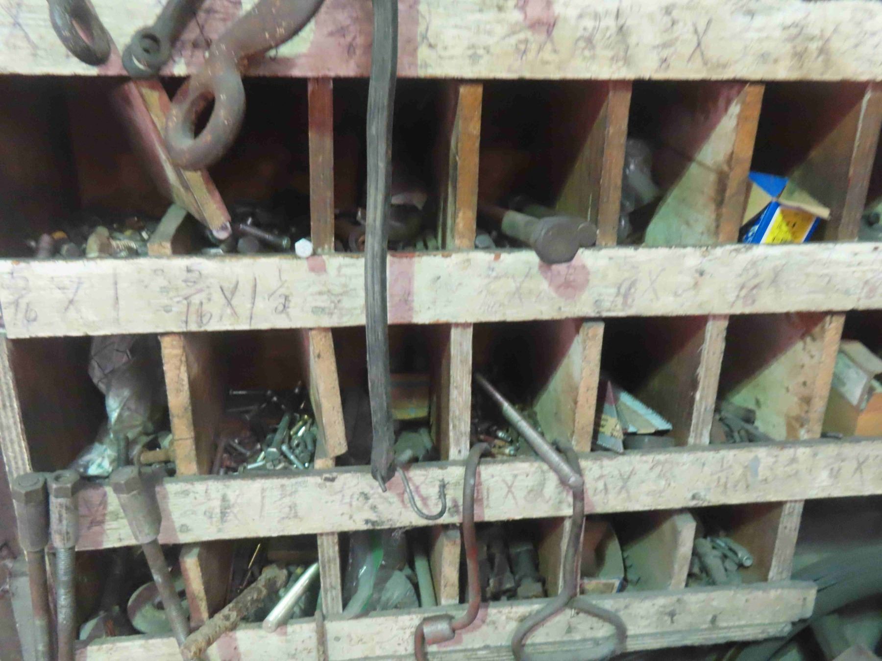 Tool Bench Full of Shop Items: Air Couplings, Trailer Lighting, Grease Guns, Clevers, Battery Terminal Cables, Seals, Connectors, Rolling Chains Organizers Full Of Wiring Kit, Electrical, Hole Saws, Pins, Grinding Stones, Pulleys, Misc Fasteners, Vise, Bench Grinder Tool Bench Not Included