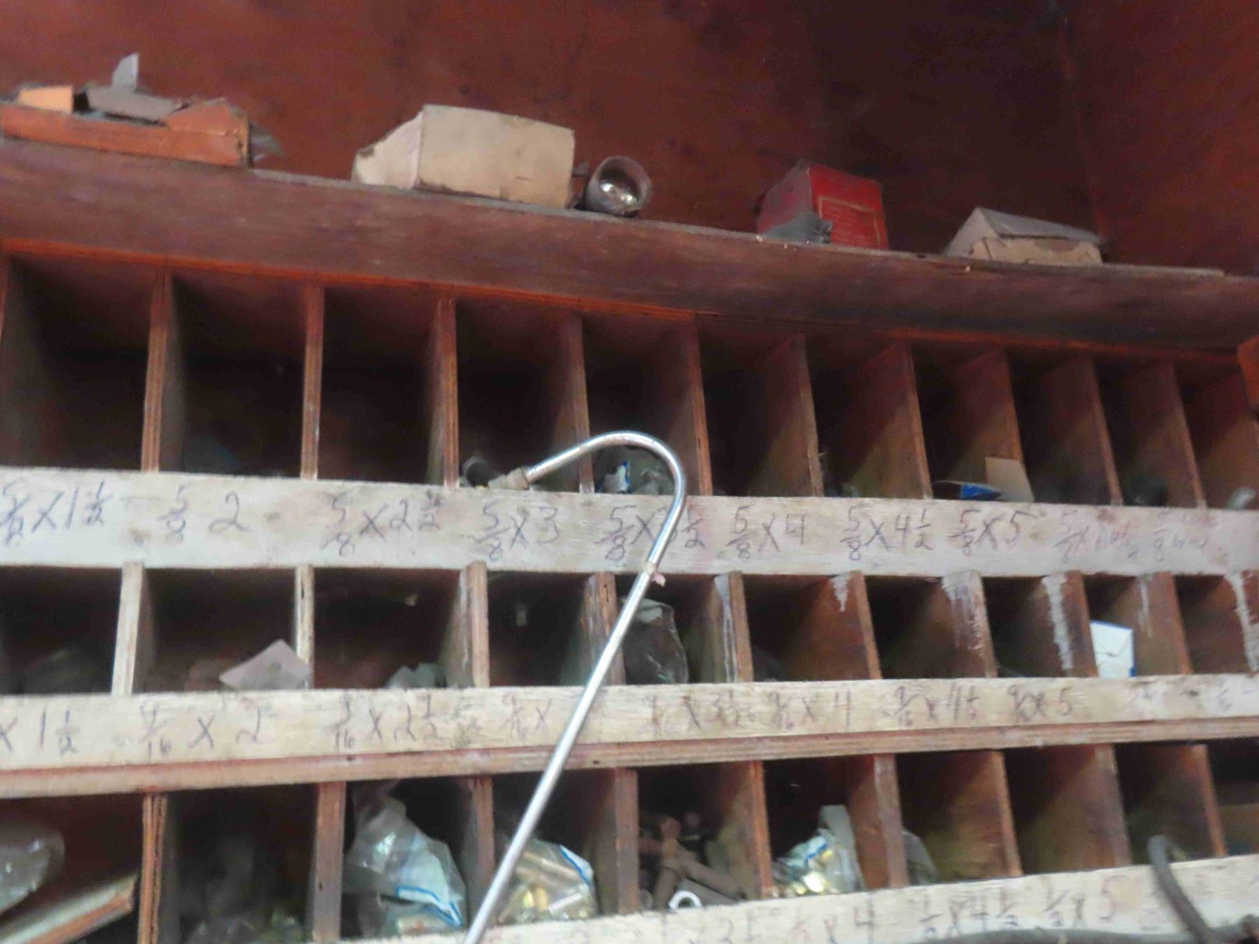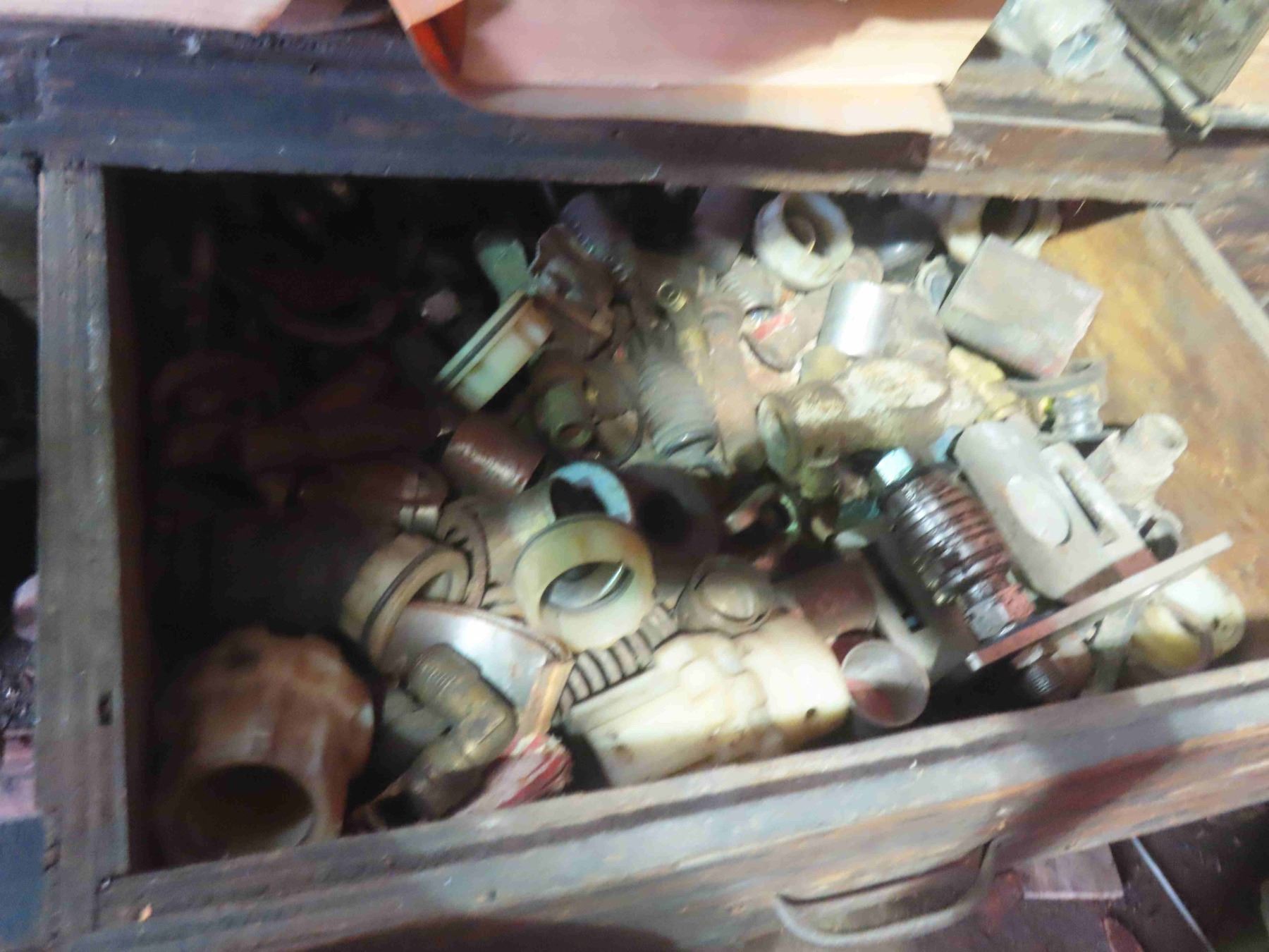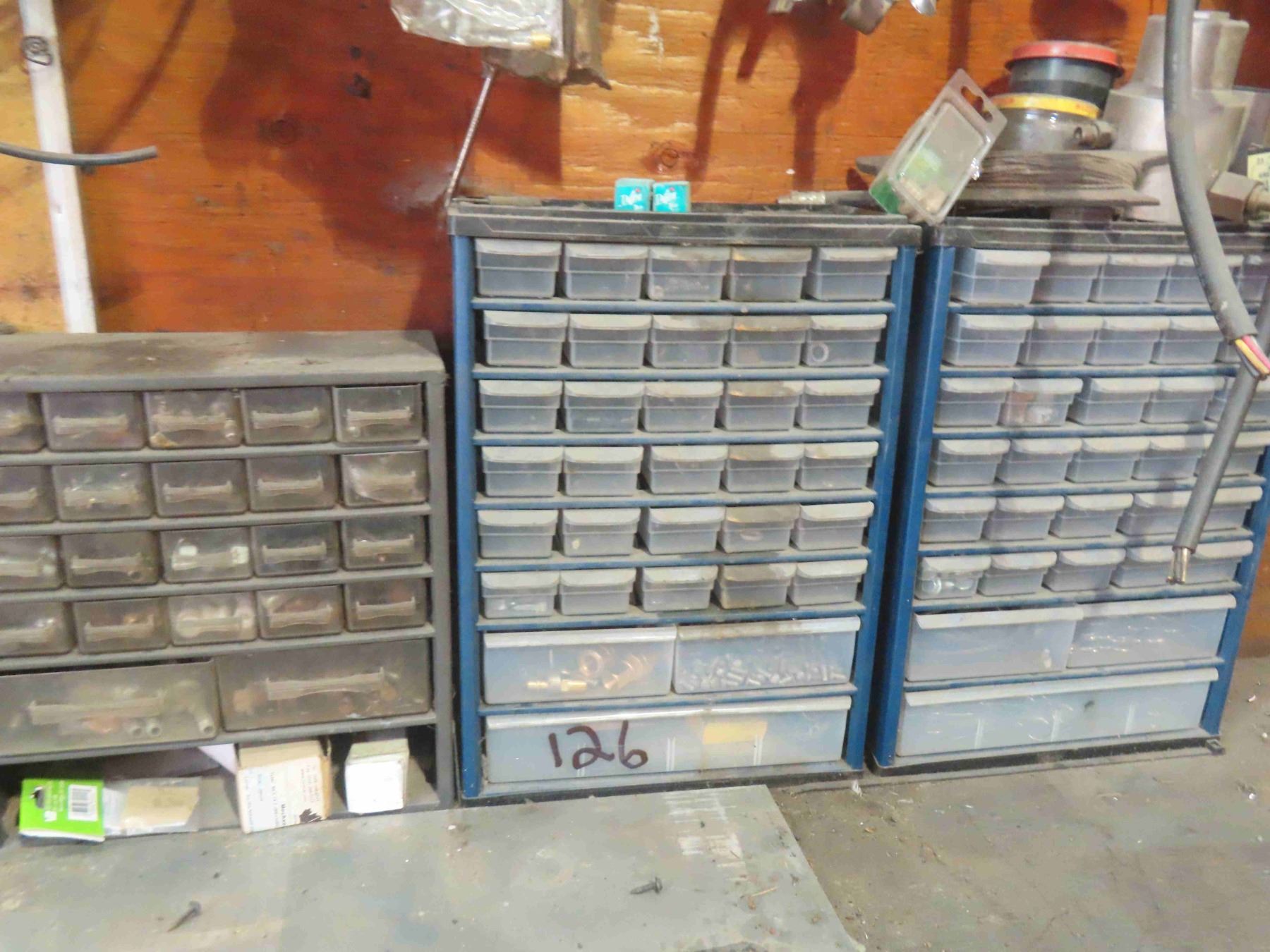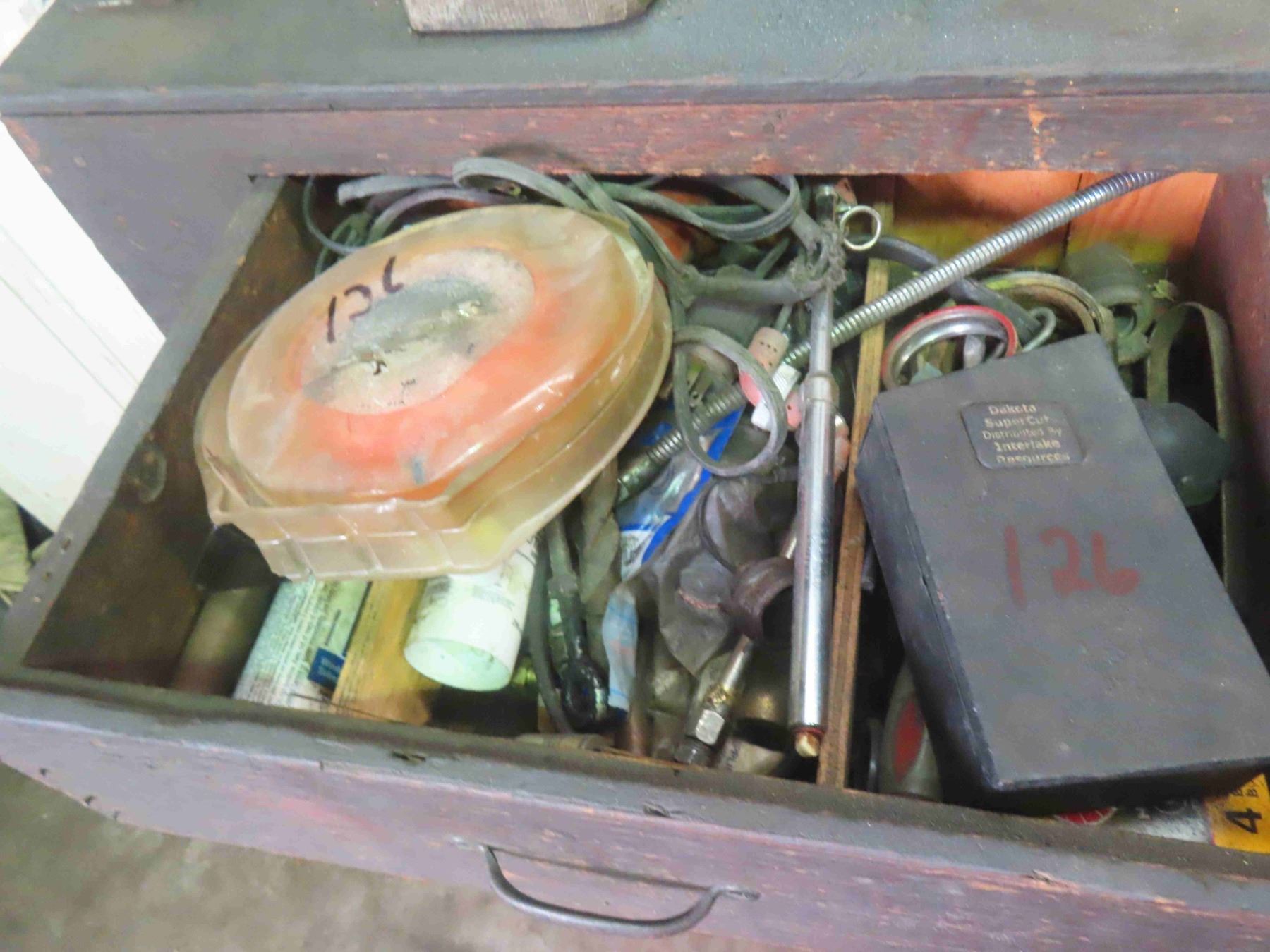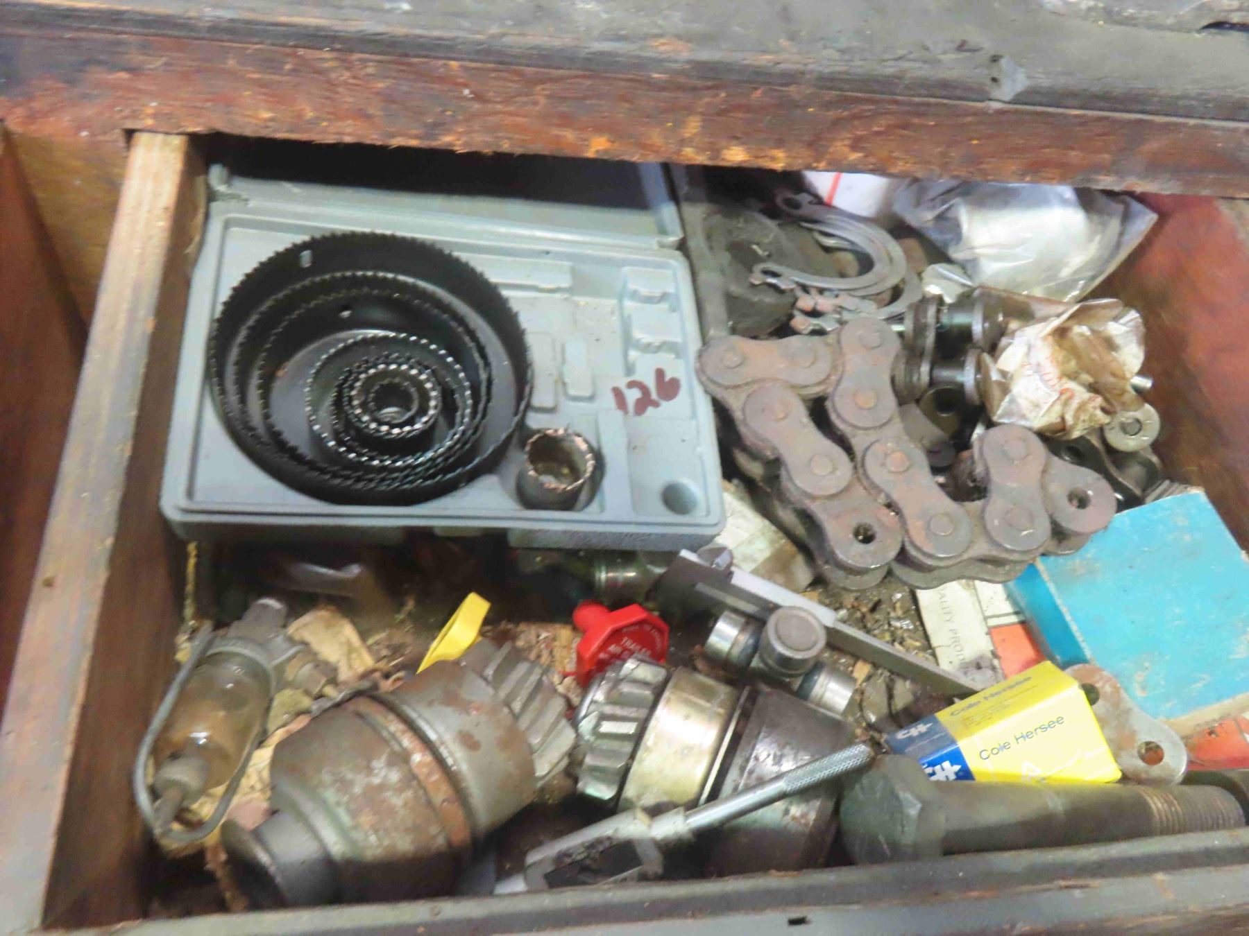 Tool Bench Full of Shop Items: Air Couplings, Trailer Lighting, Grease Guns, Clevers, Battery Terminal Cables, Seals, Connectors, Rolling Chains Organizers Full Of Wiring Kit, Electrical, Hole Saws, Pins, Grinding Stones, Pulleys, Misc Fasteners, Vise, Bench Grinder Tool Bench Not Included