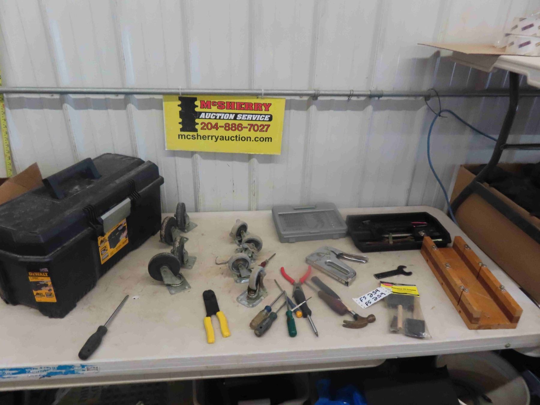 Tool Box, 2 Sets of Casters, Odds n Ends of Hand Tools, Screwdriver, Wrenches, Hammer plus more