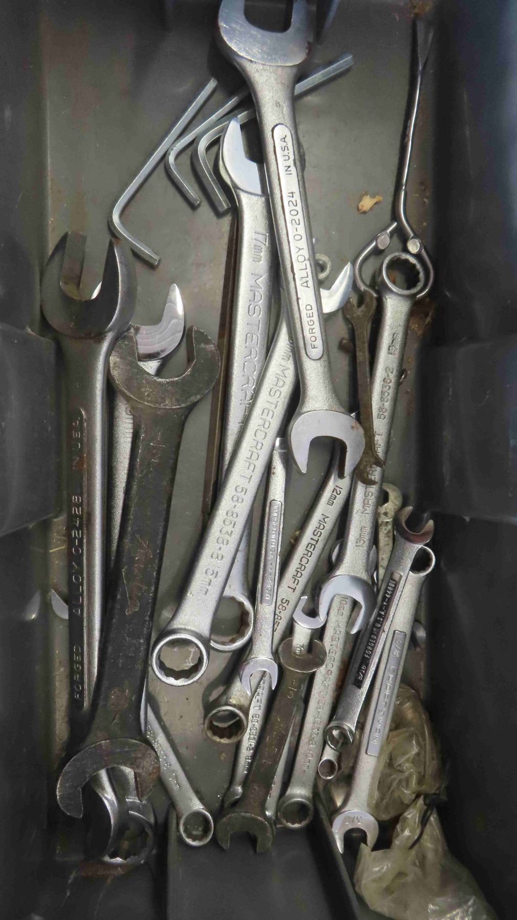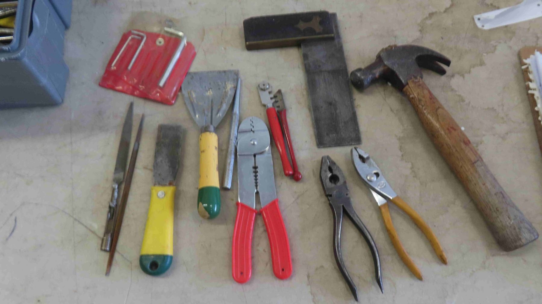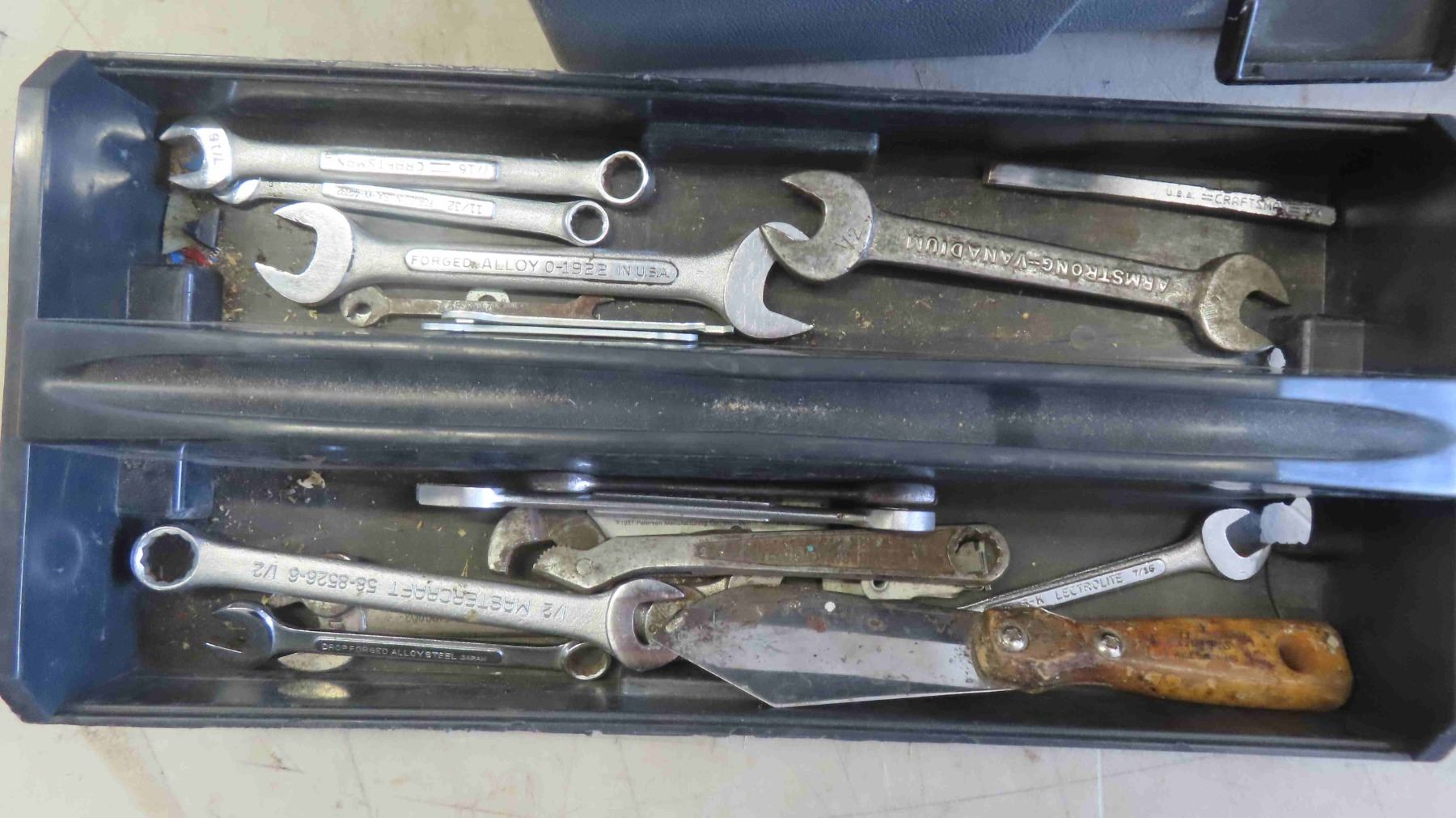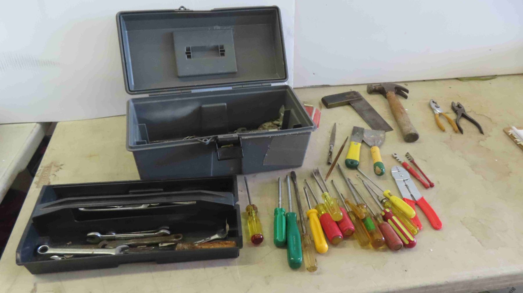 Tool Box Filled with Tools: Screwdrivers, Square, Wrenches, Glass Cutter