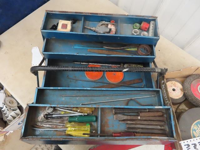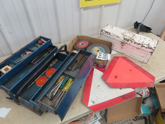 Tool Box, Odds & Ends Tools, Chisel, Screwdriver, 2 Slow Hazzard Signs, Wire Brush & Slow Signs
