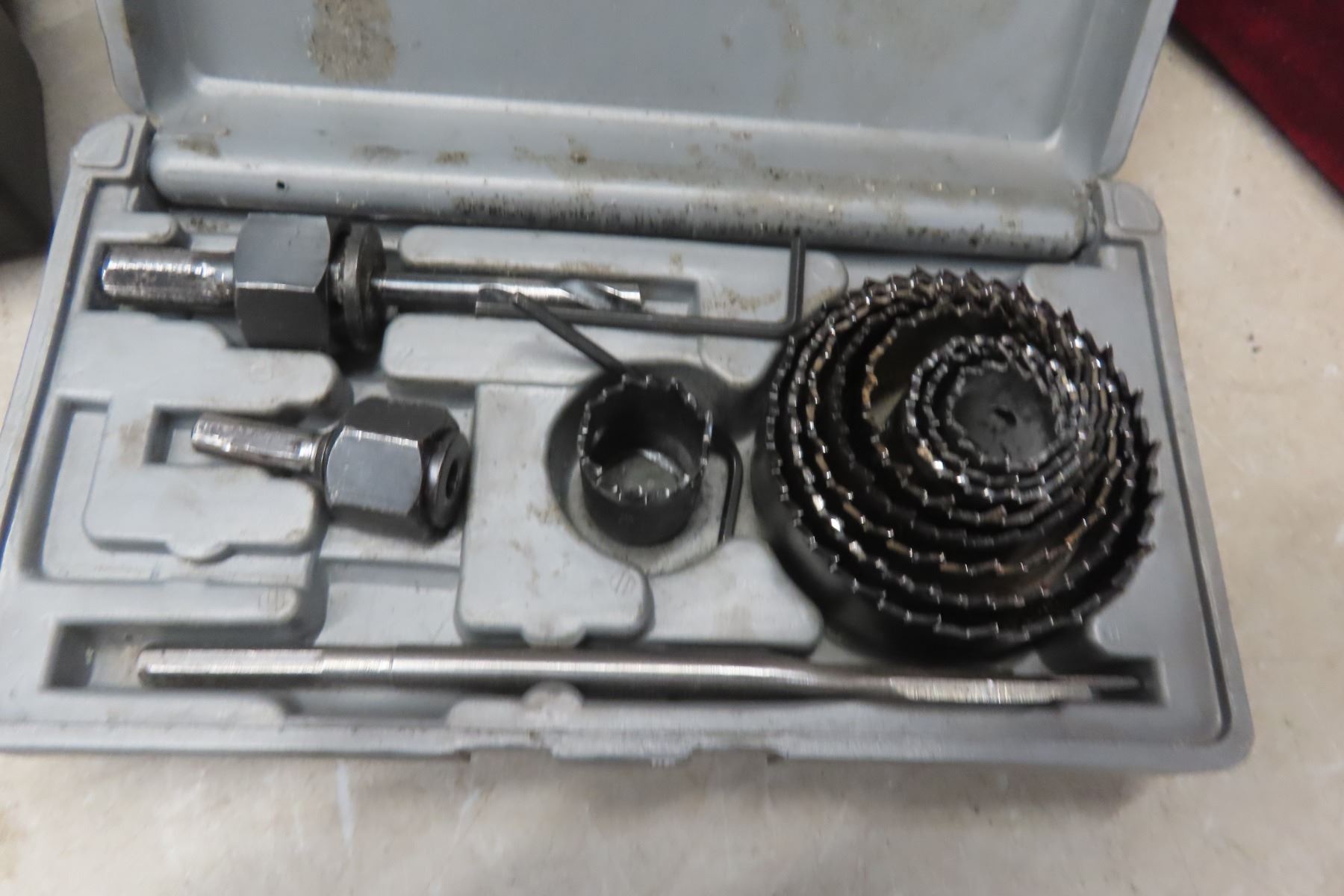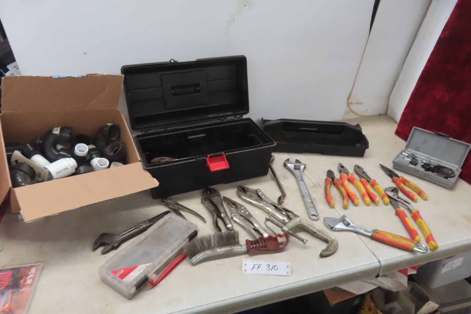 Tool Box with Pliers, Vise Grips, Wrenches, Screwdriver Bits, ABS Fittings, Hole Saws