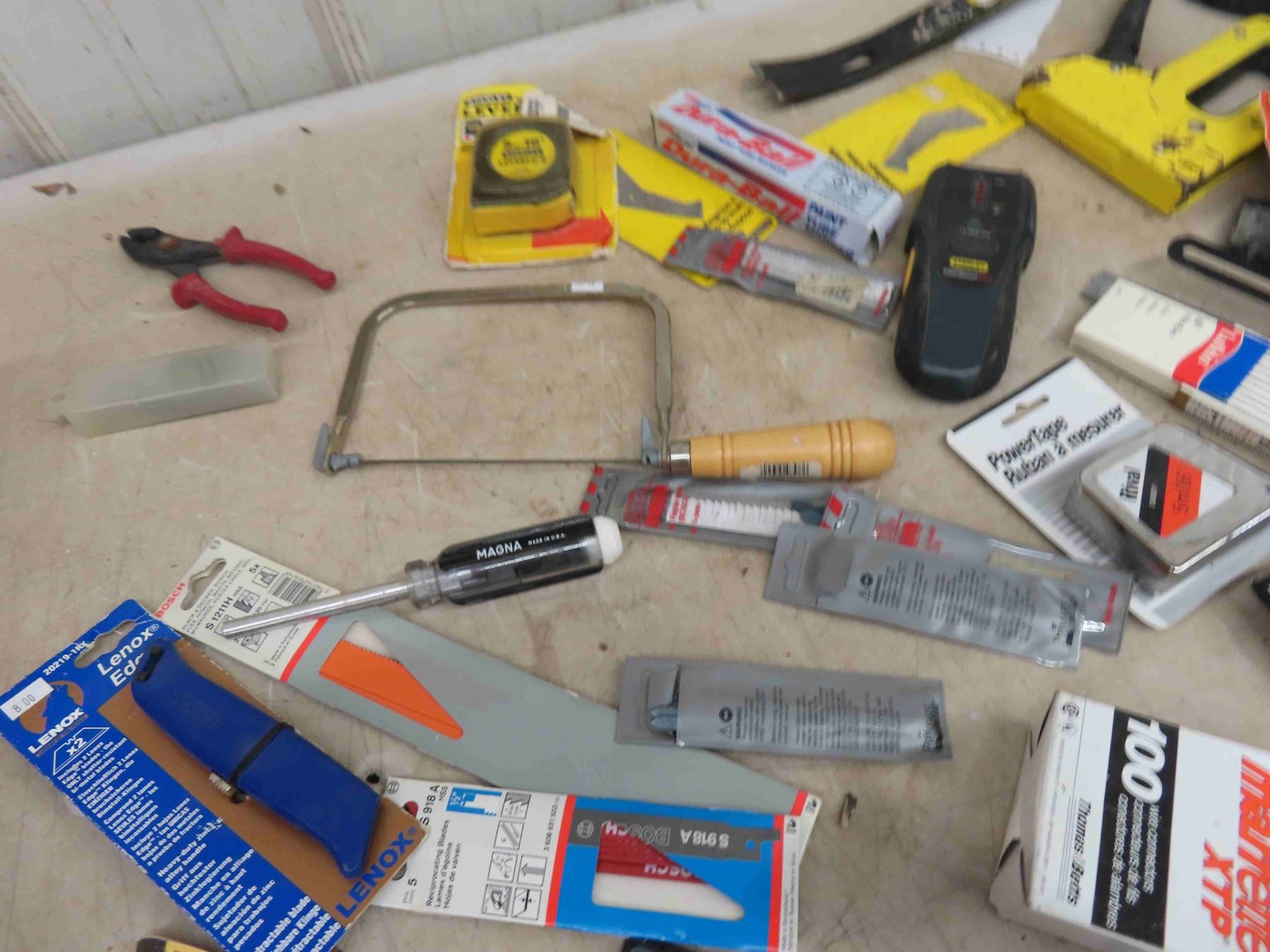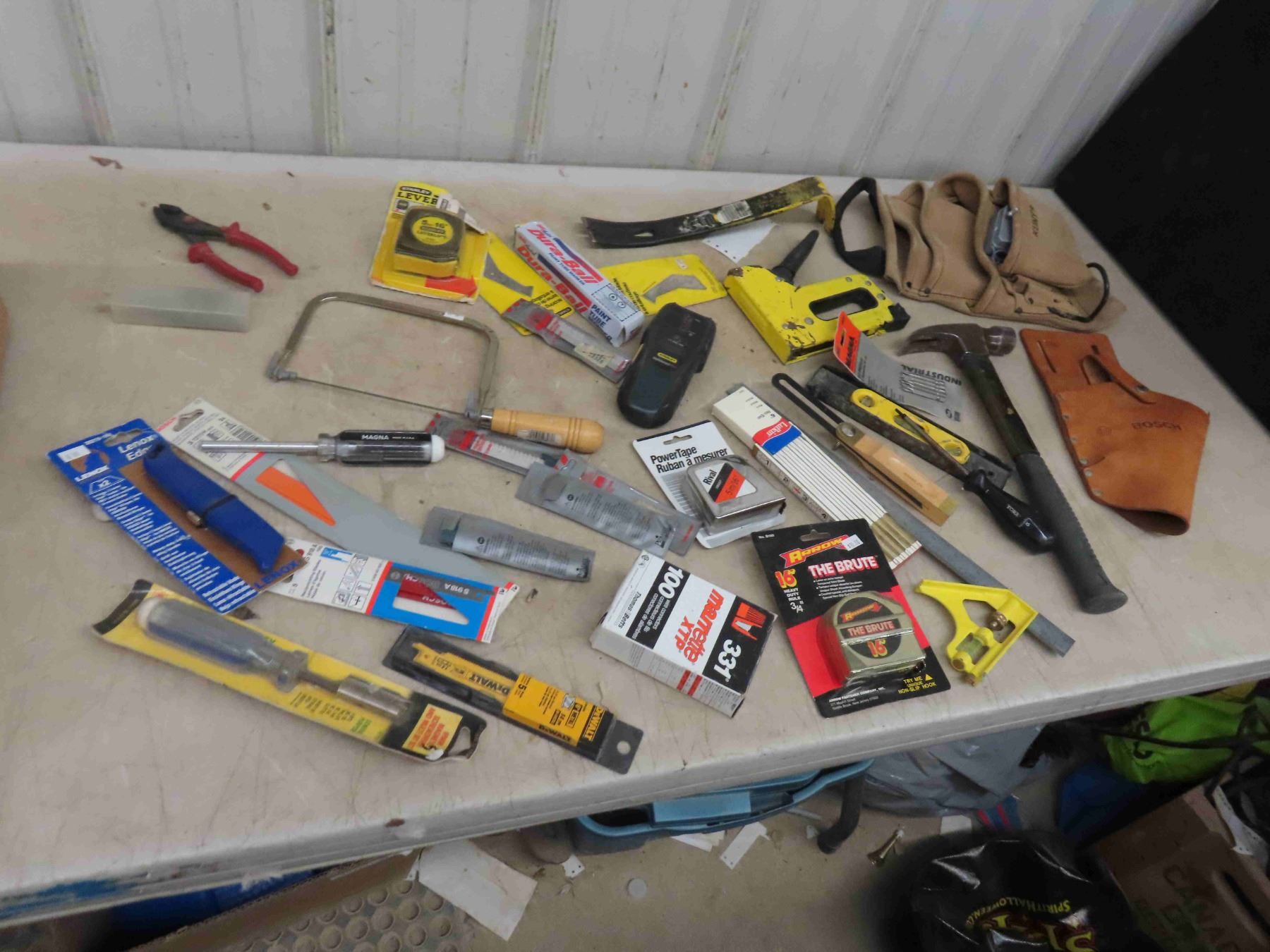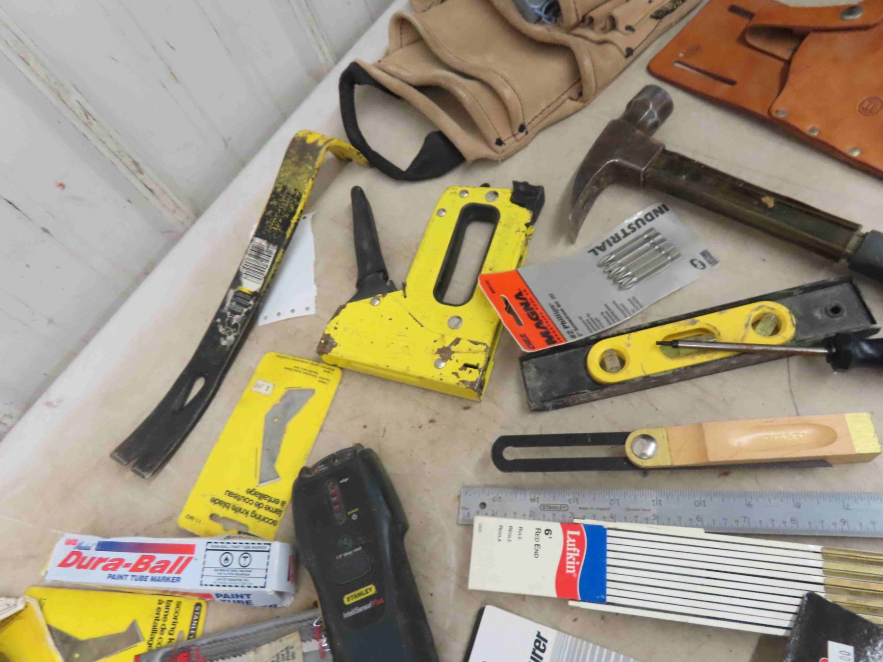 Tool Pouch , Saw Blades, Tape Measure, Stud Finder, Some New Some Used, Plus