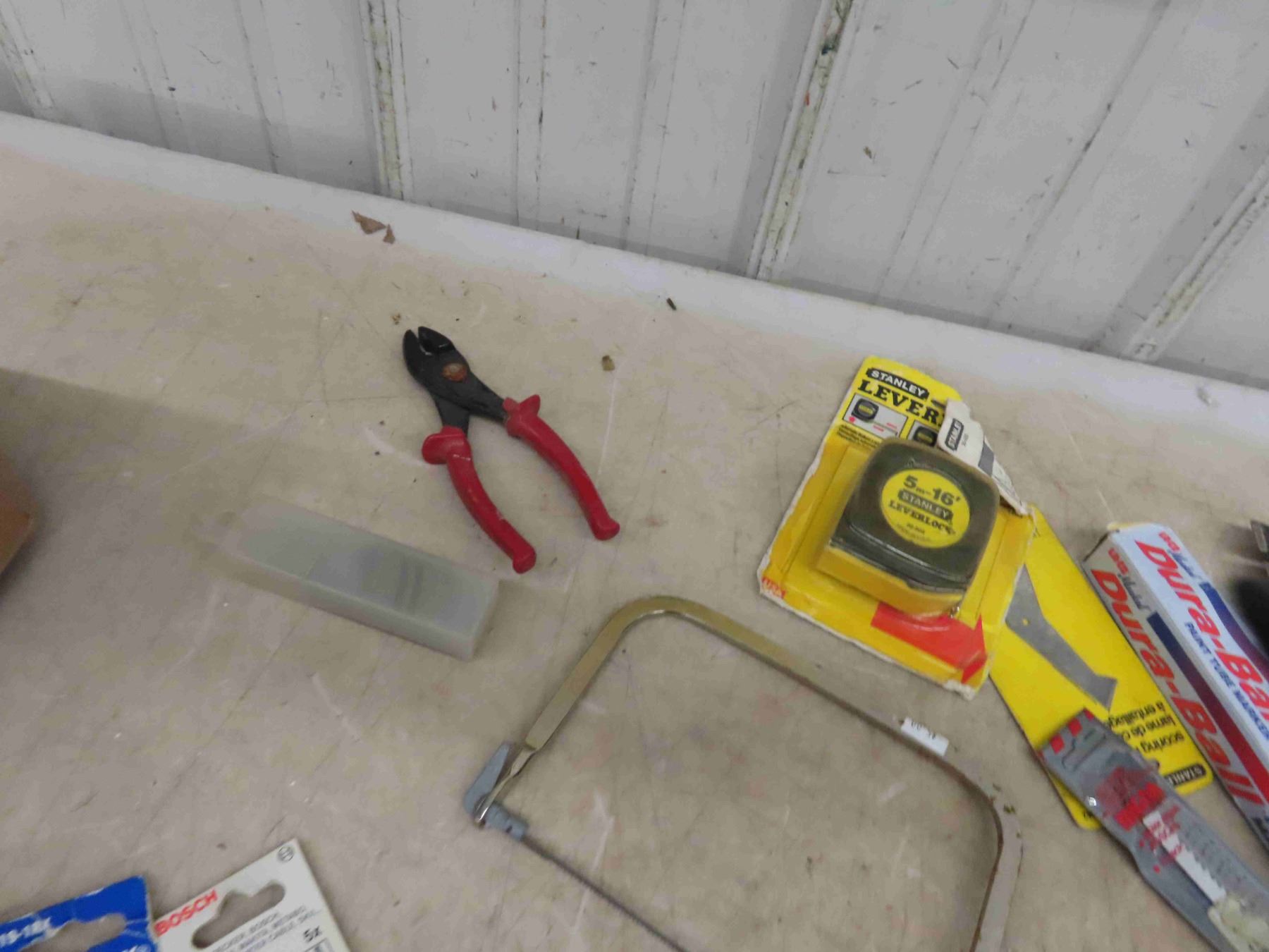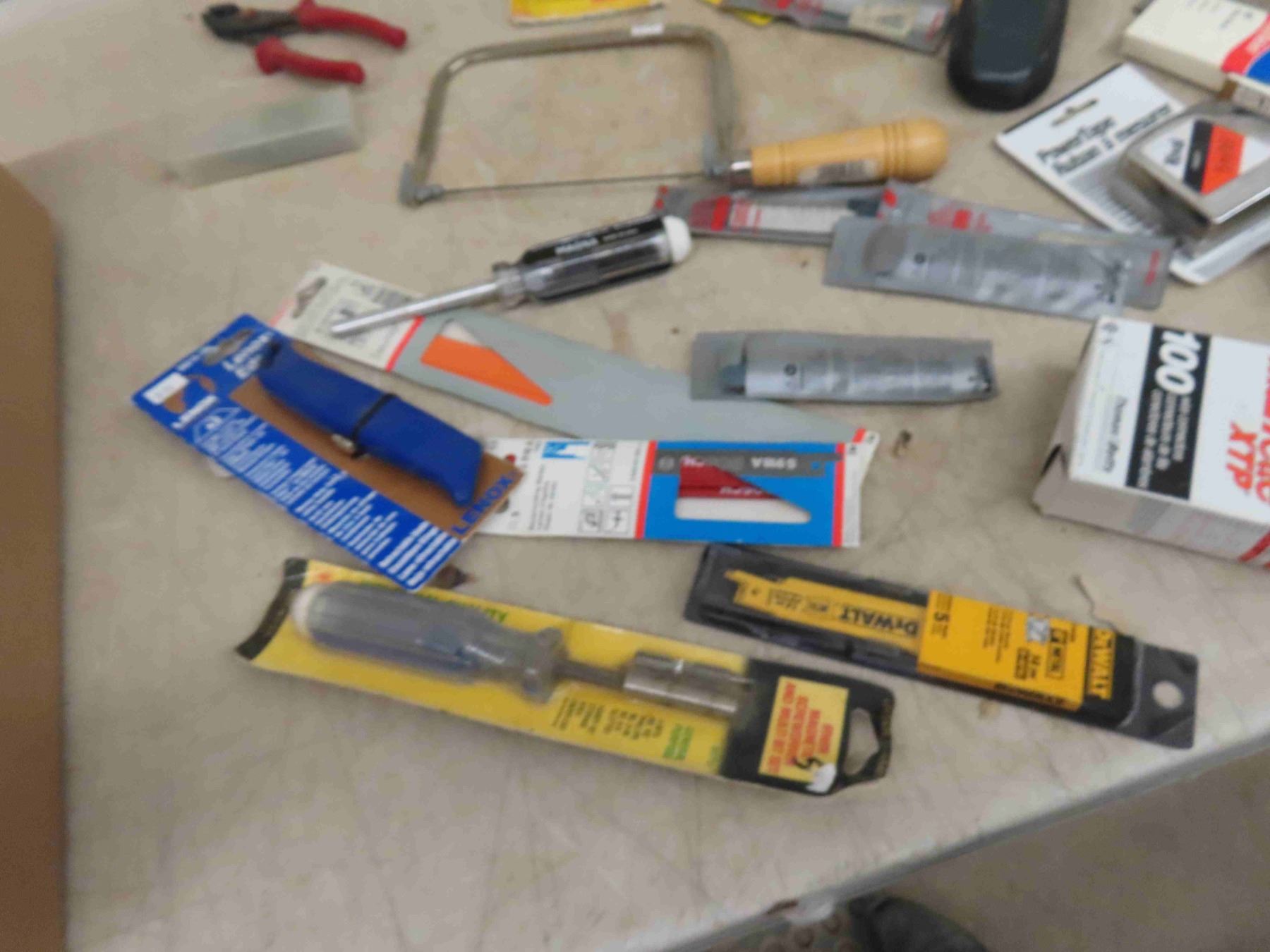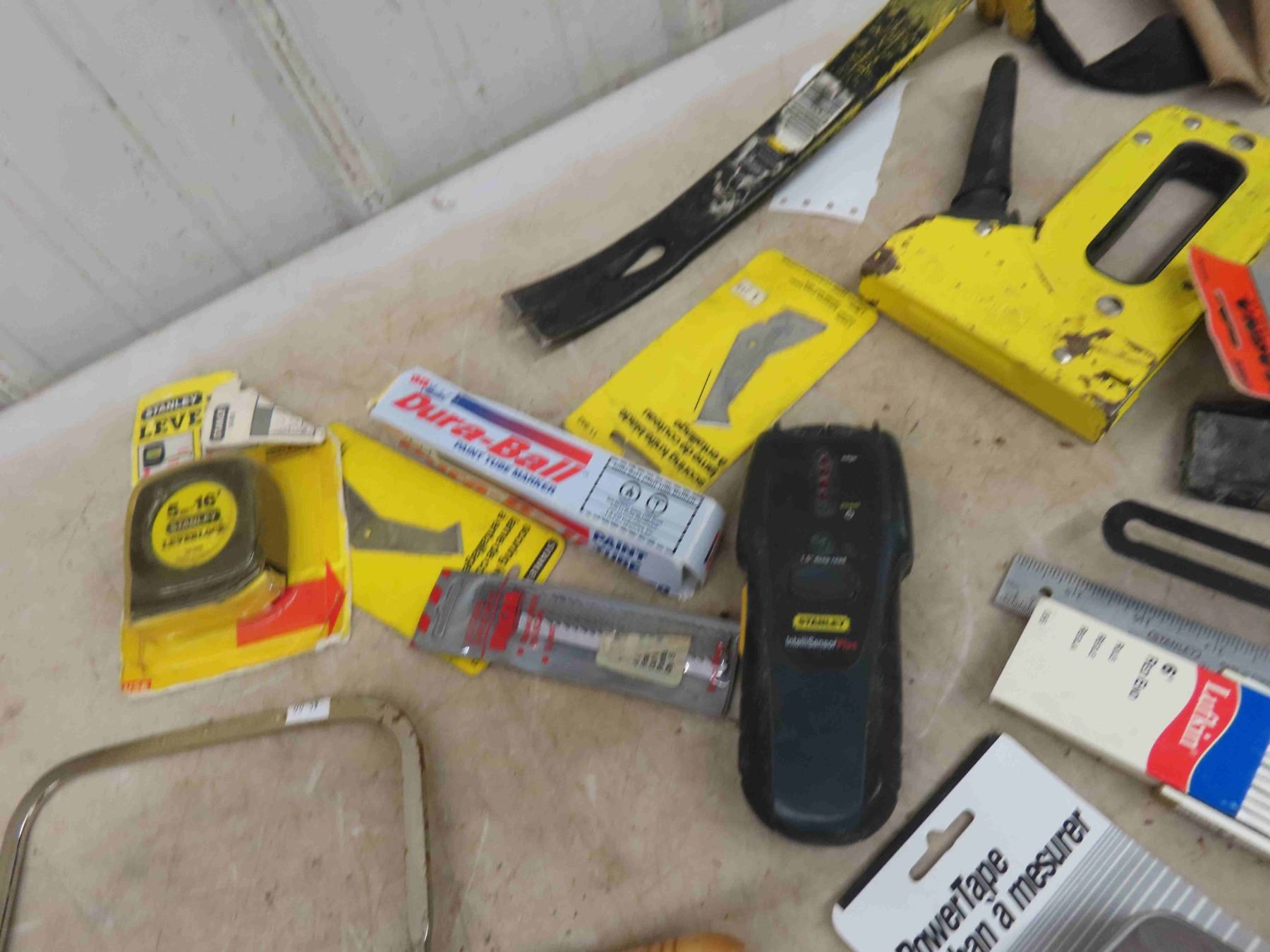 Tool Pouch , Saw Blades, Tape Measure, Stud Finder, Some New Some Used, Plus