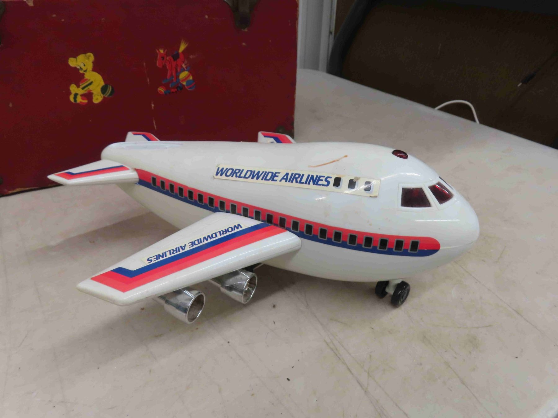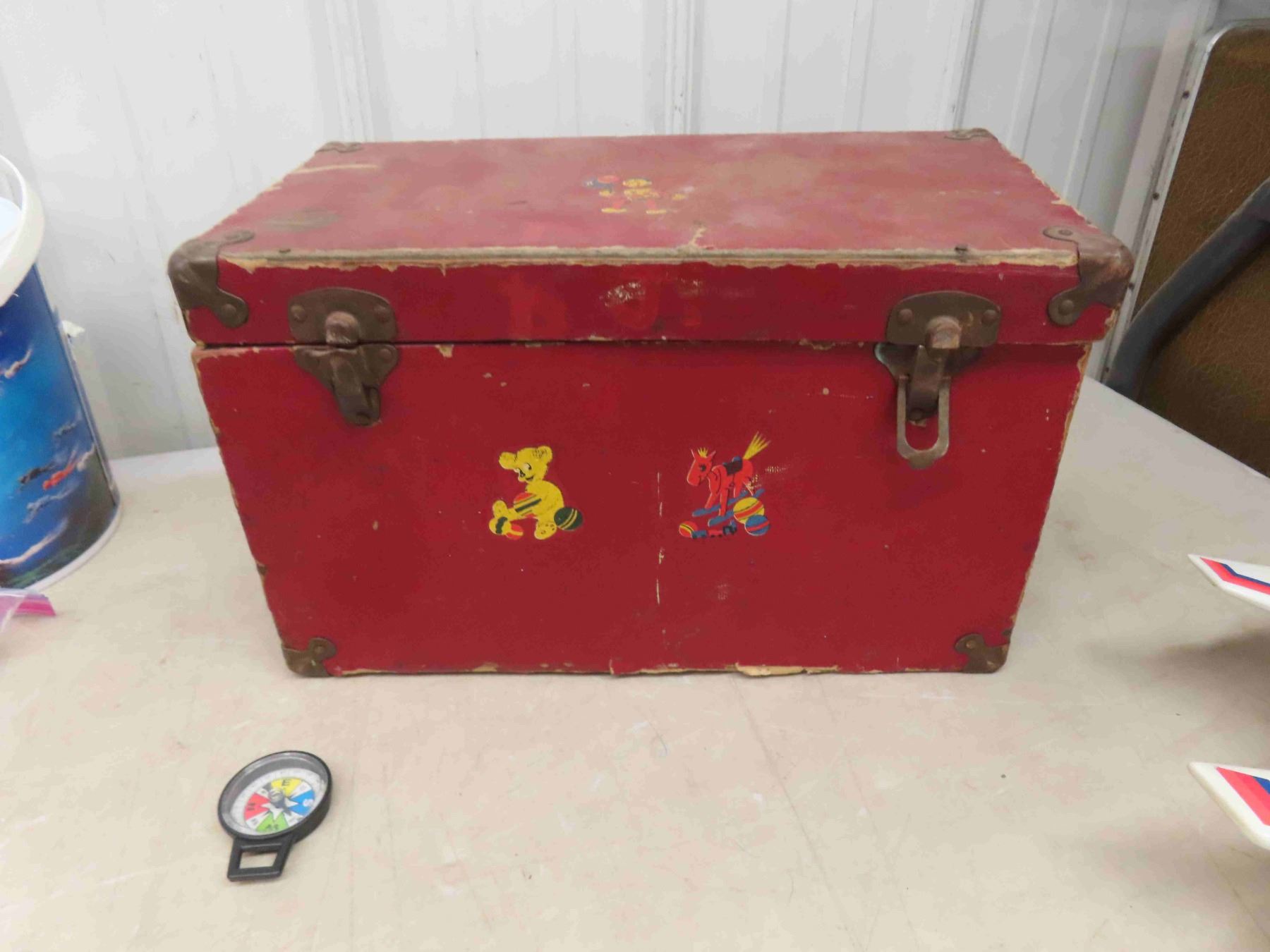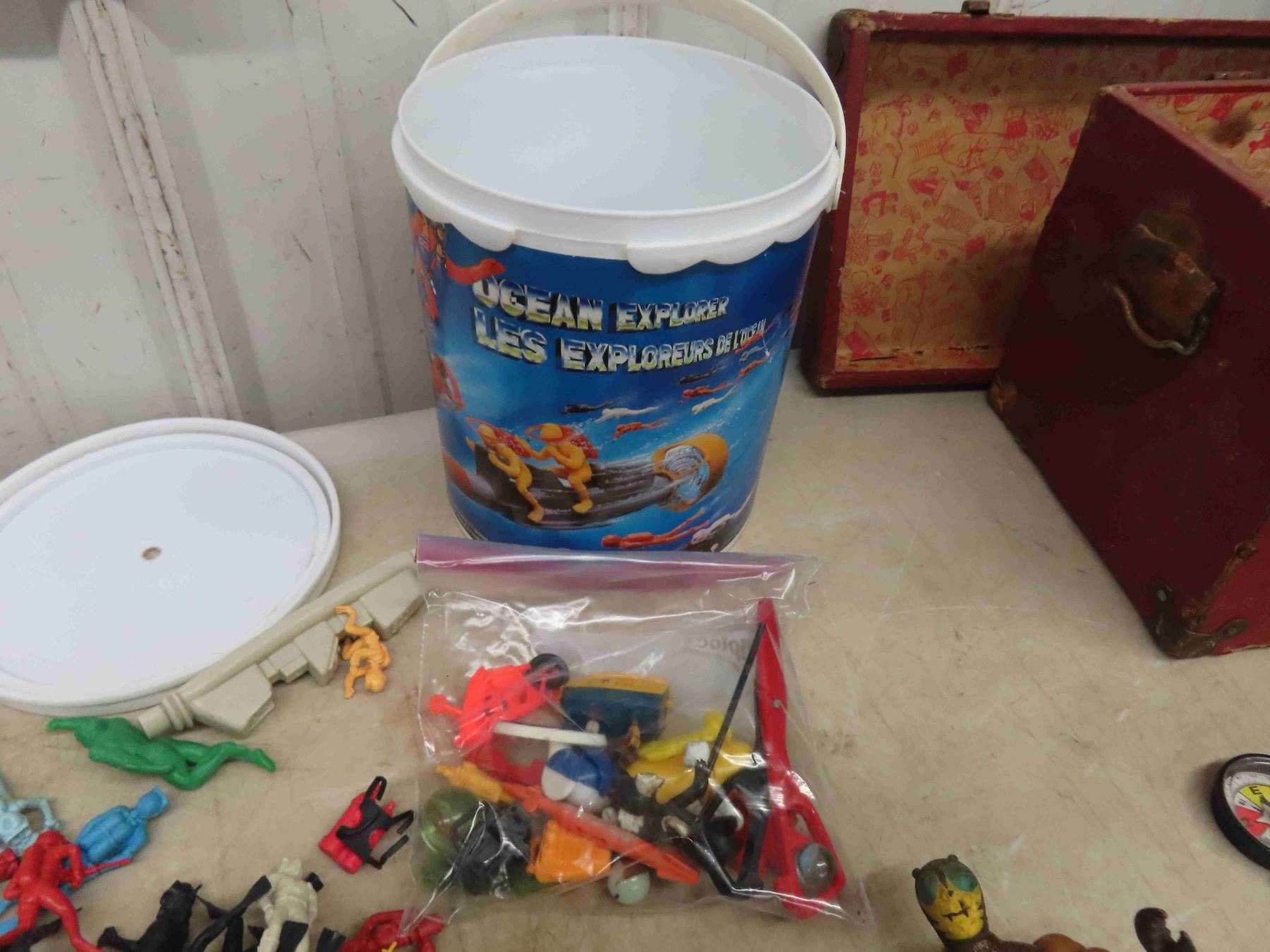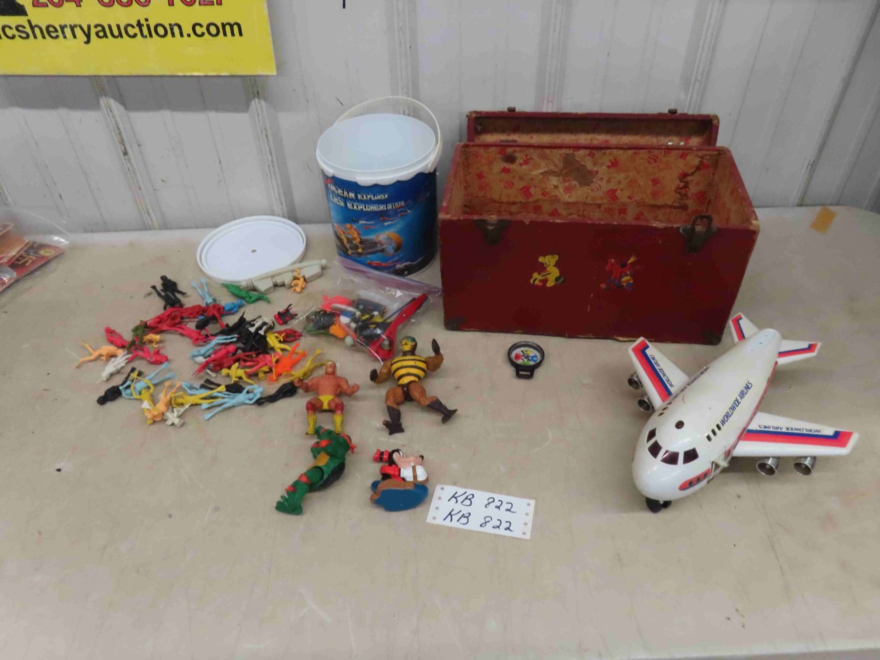 Toys : Ocean Explorer Set, Promo Airplane, Train Tracks, Compass, Old Lined Toy Chest (Hinge Broken on Back)