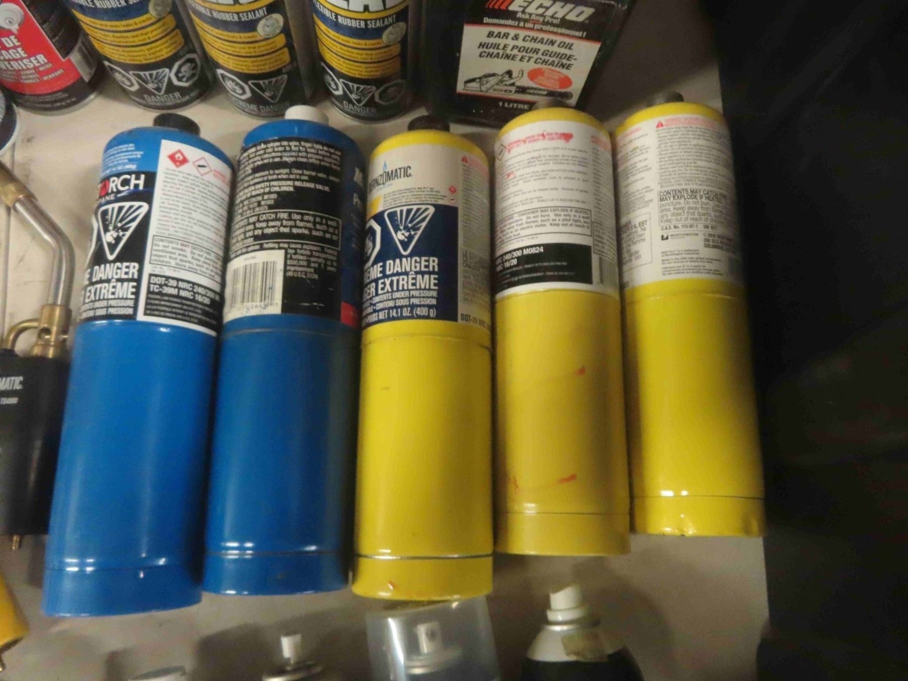 Tremclad Spray Paint, De-Icer, Air Filter Oil, Carb Cleaner, Rubber Sealant, Brake Cleaner, Other Auto Products, (5) 14 oz propane Tanks, plus more