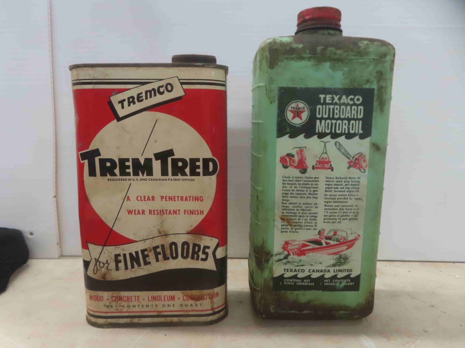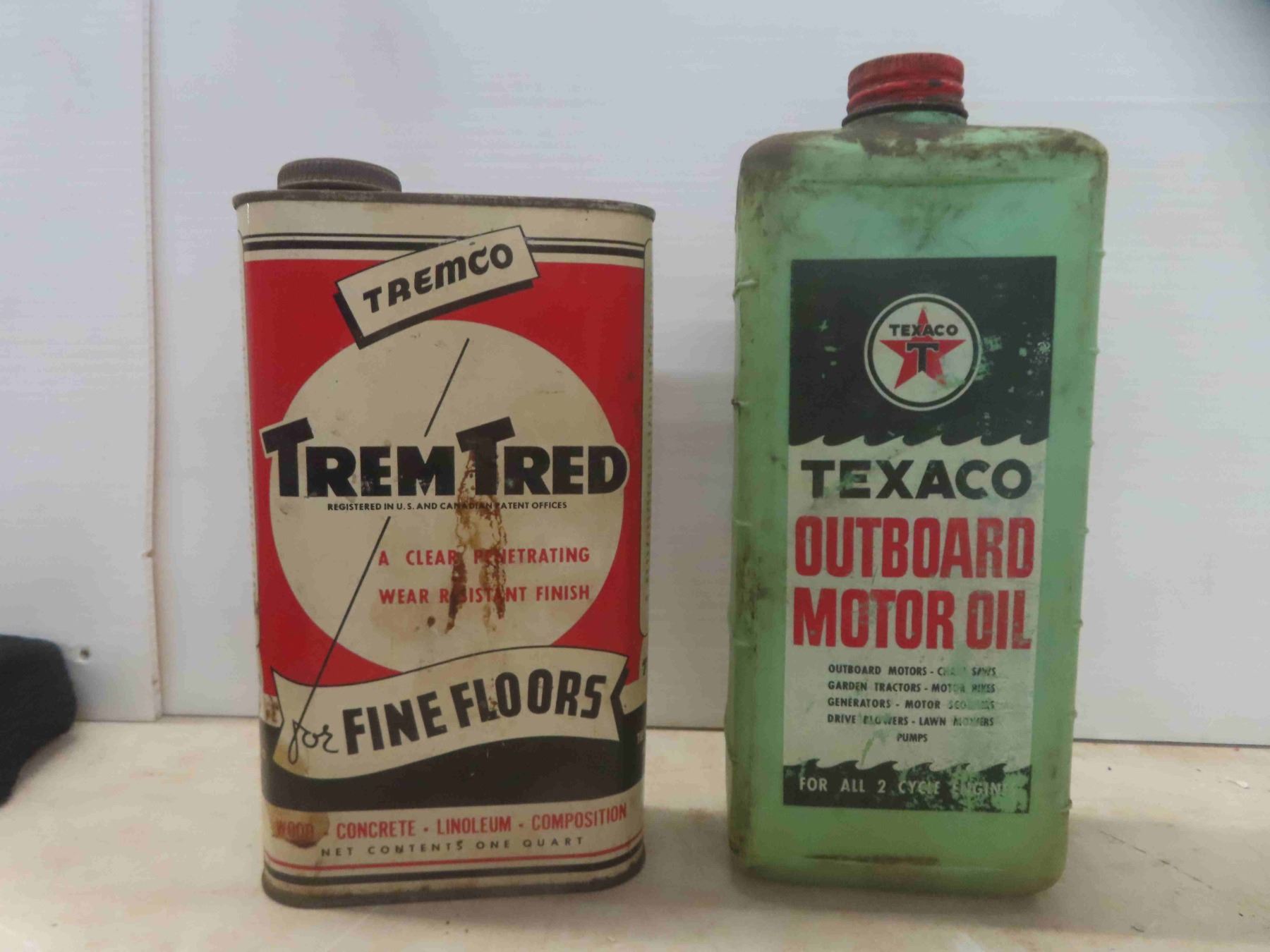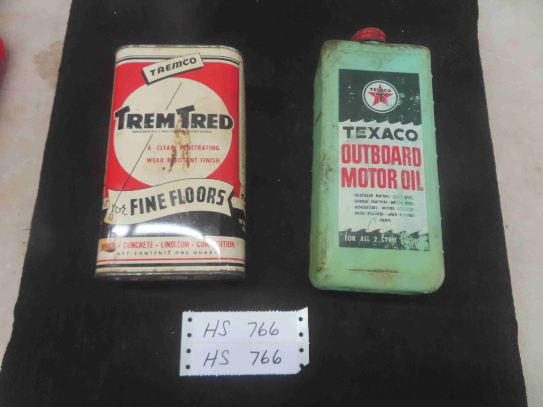 Tremco Trem-Tred Quart Can with Product, Texaco Outboard Motor Oil Plastic Quart Container