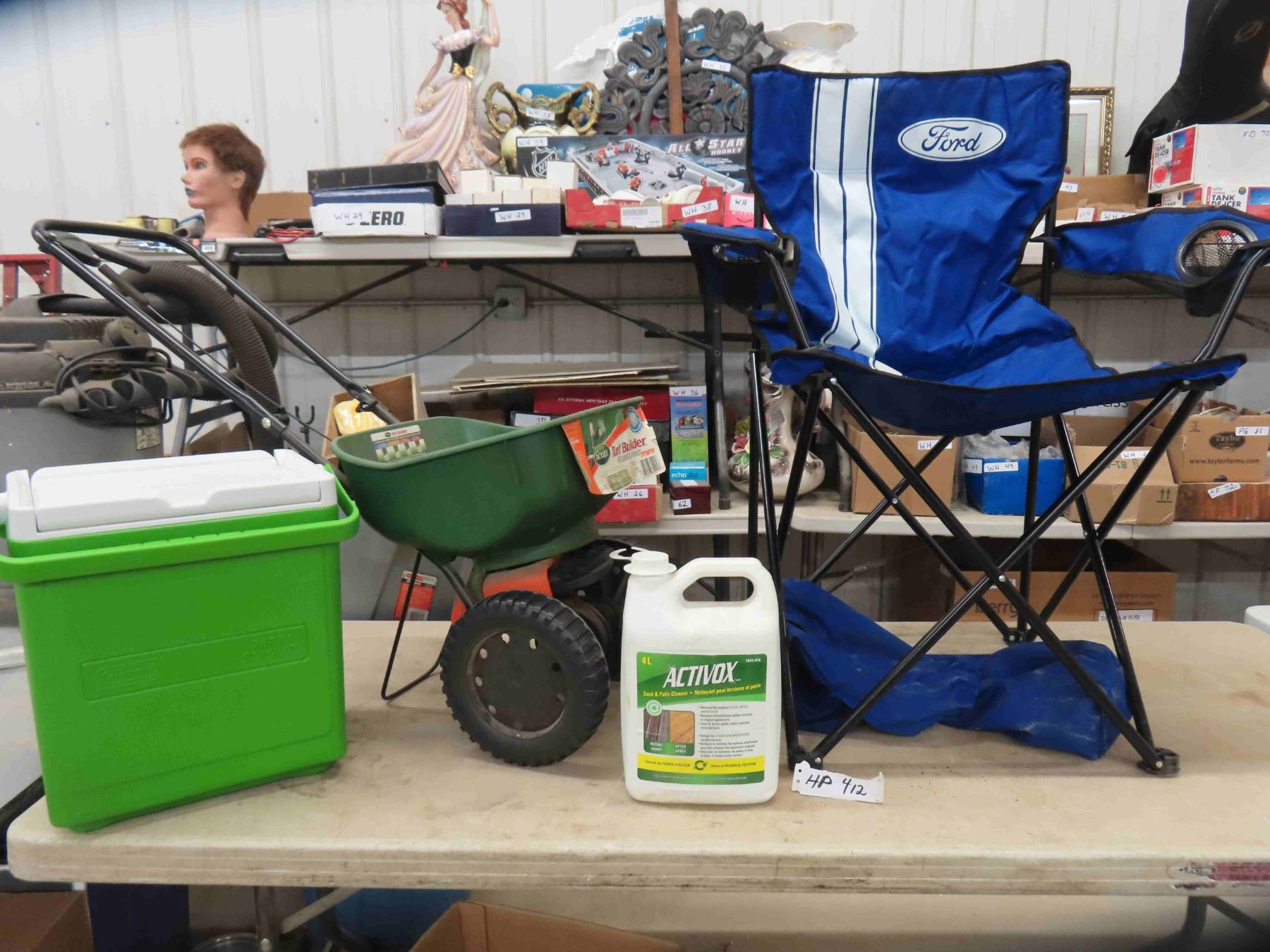 Turf Builder Seeder, Coleman Picnic Cooler, Fold Away Ford Lawn Chair