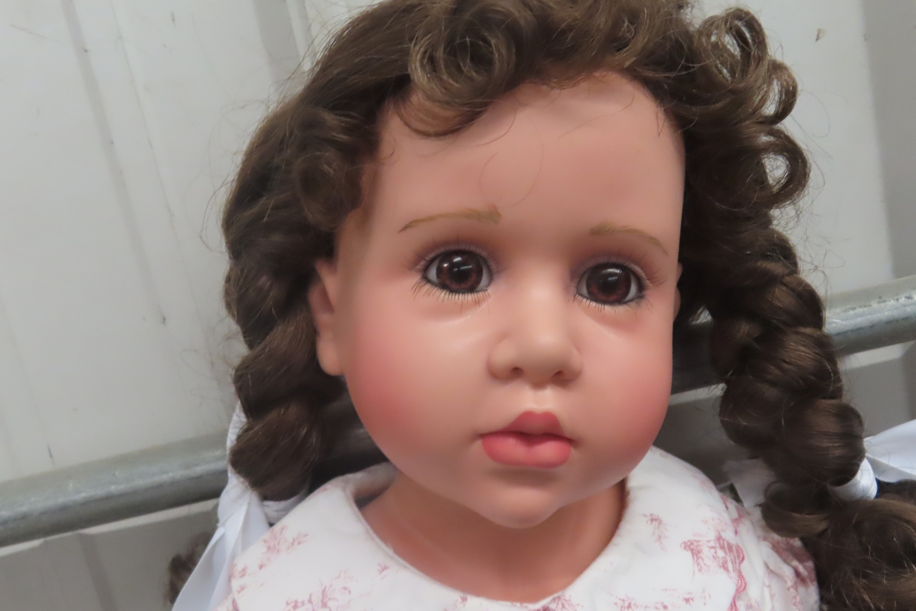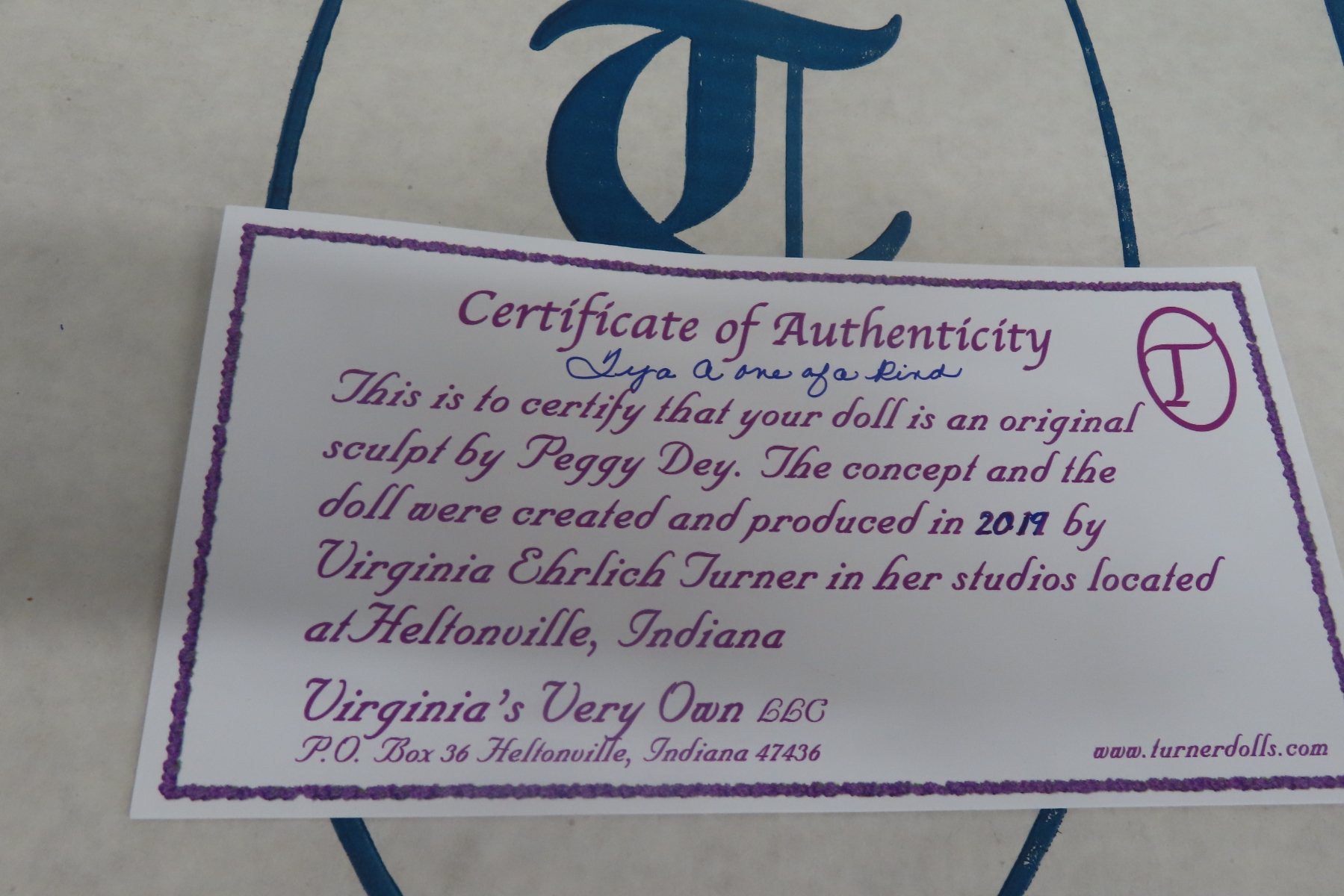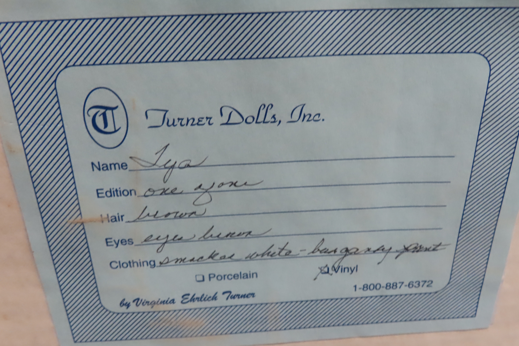 Turner Dolls “Iya” One-of-a-Kind Vinyl Doll, Sculpted by Peggy Dey and Produced in 2019 by Virginia Ehrlich Turner. Brown Hair, Brown Eyes, Wearing Smocked White Burgundy Print Outfit. Includes Original Box and Certificate. Stands 20" Tall.