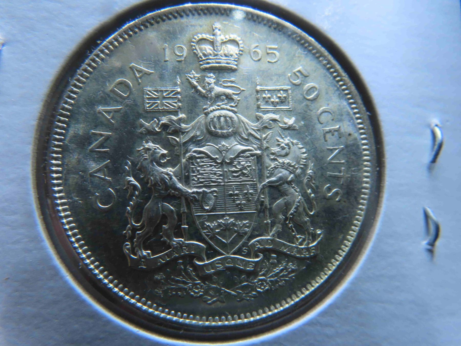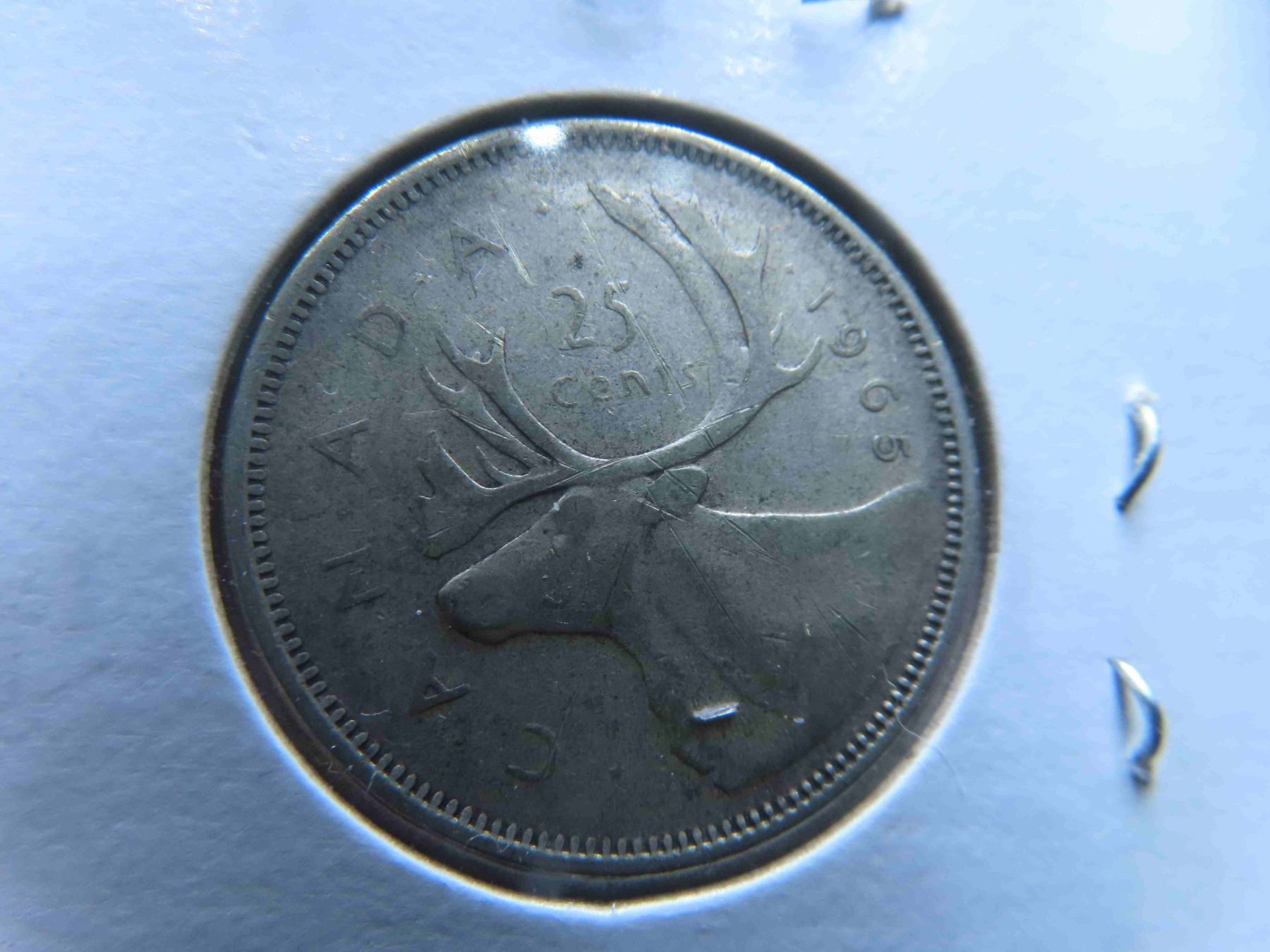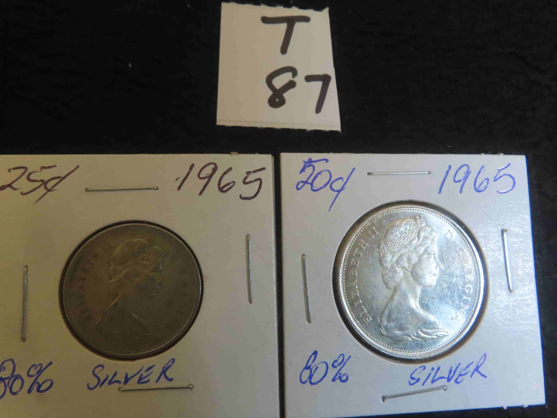 Two 1965 Canadian 80% silver coins, one 50 cent and one 25 cent, circulated and ungraded.