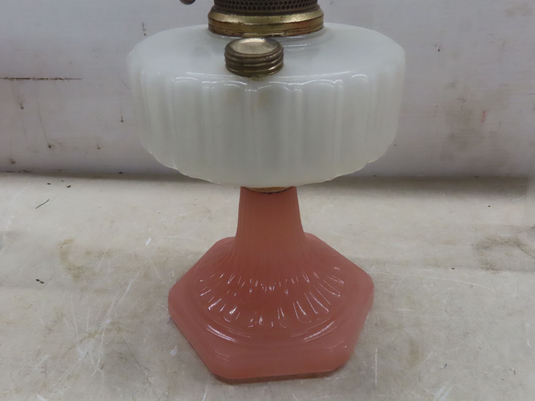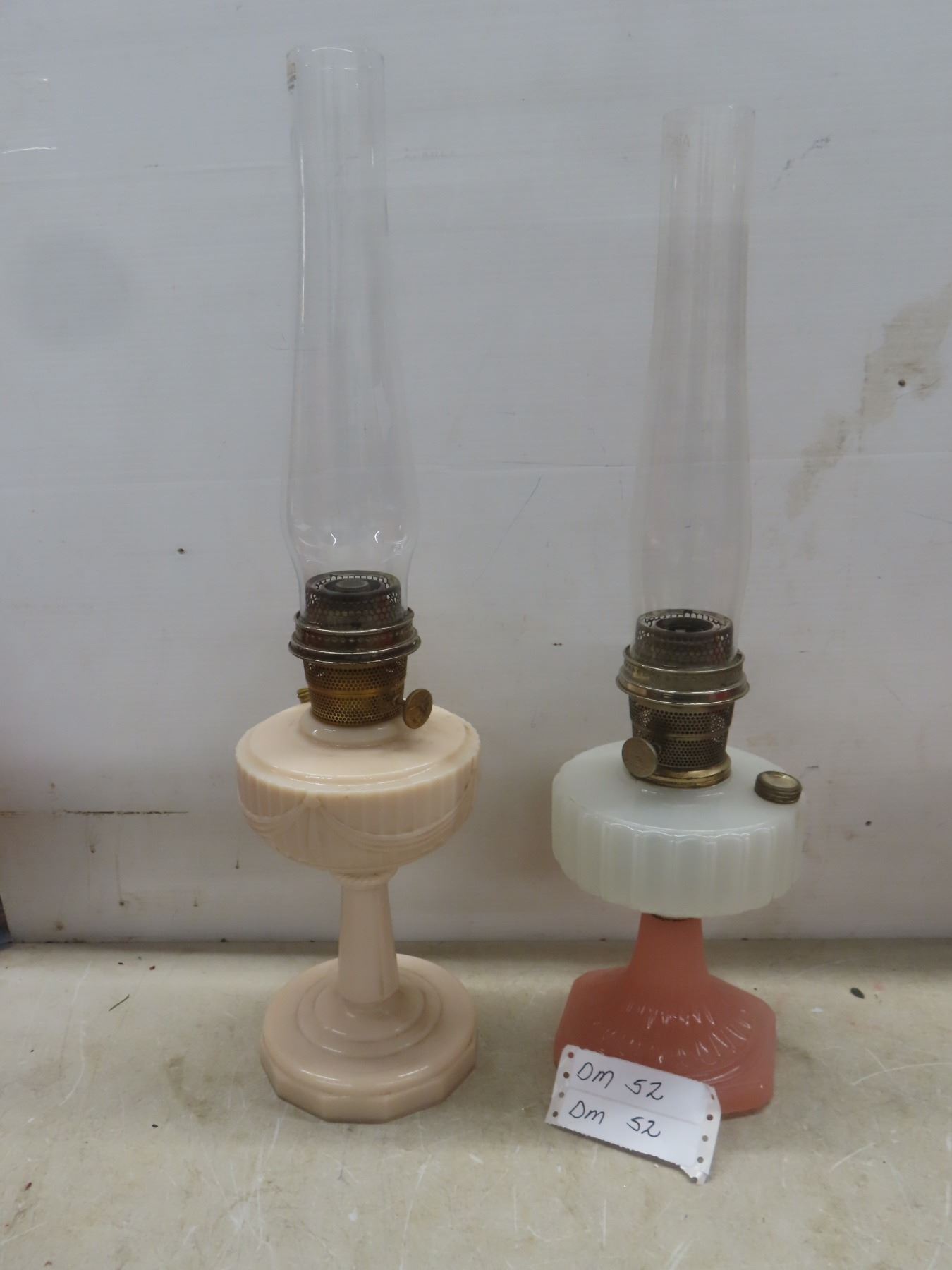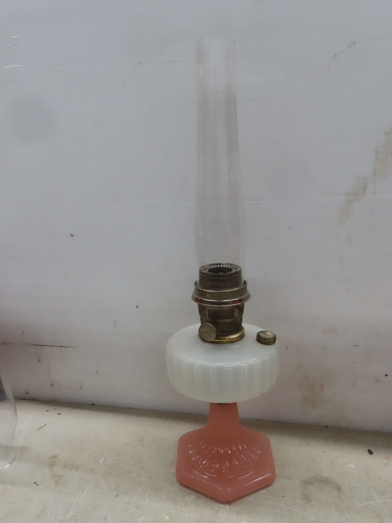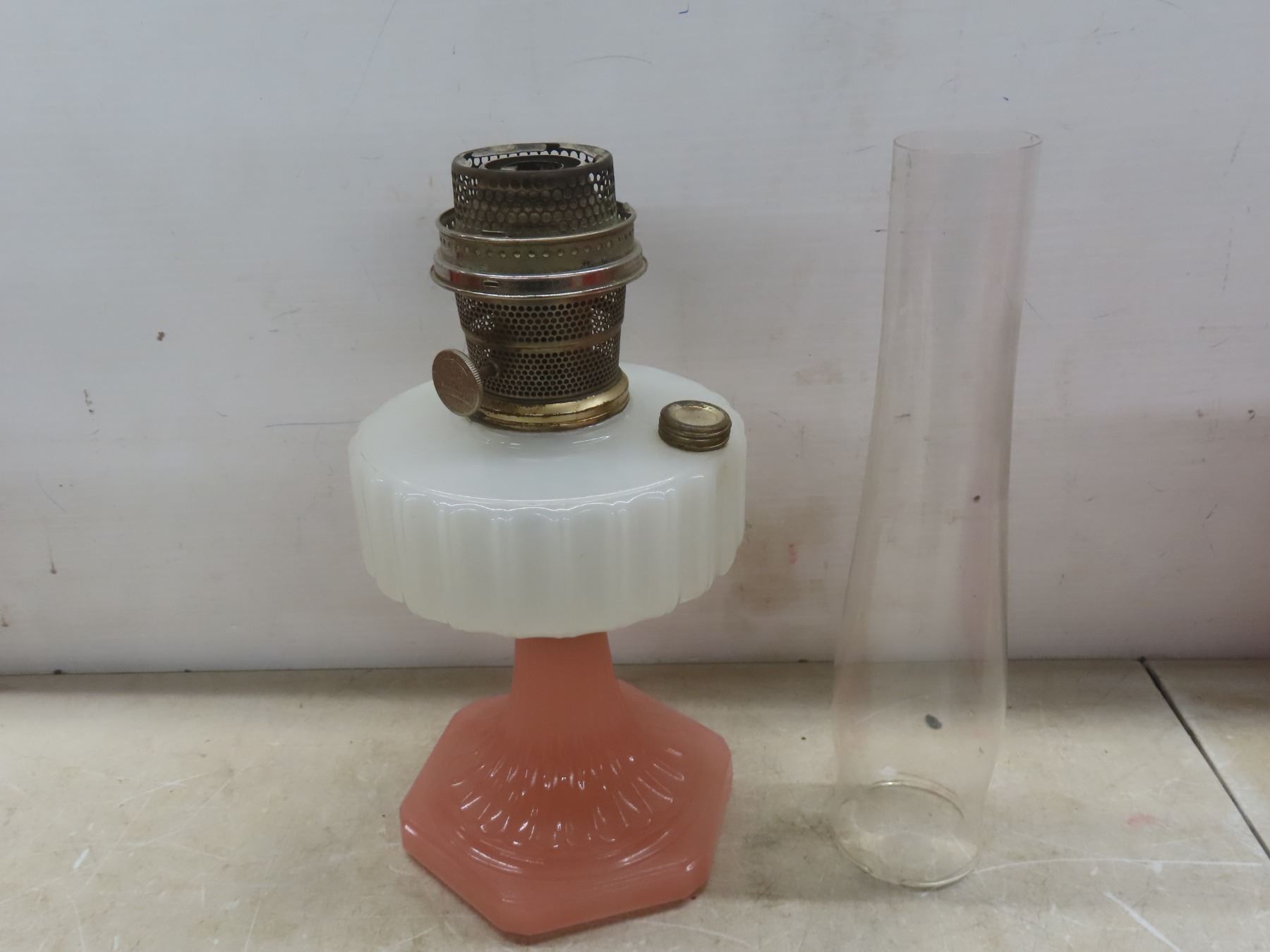 Two Aladdin Oil Lamps with Chimneys: Lincoln Drape (25") and Corinthian B116 in Pink & White (24")