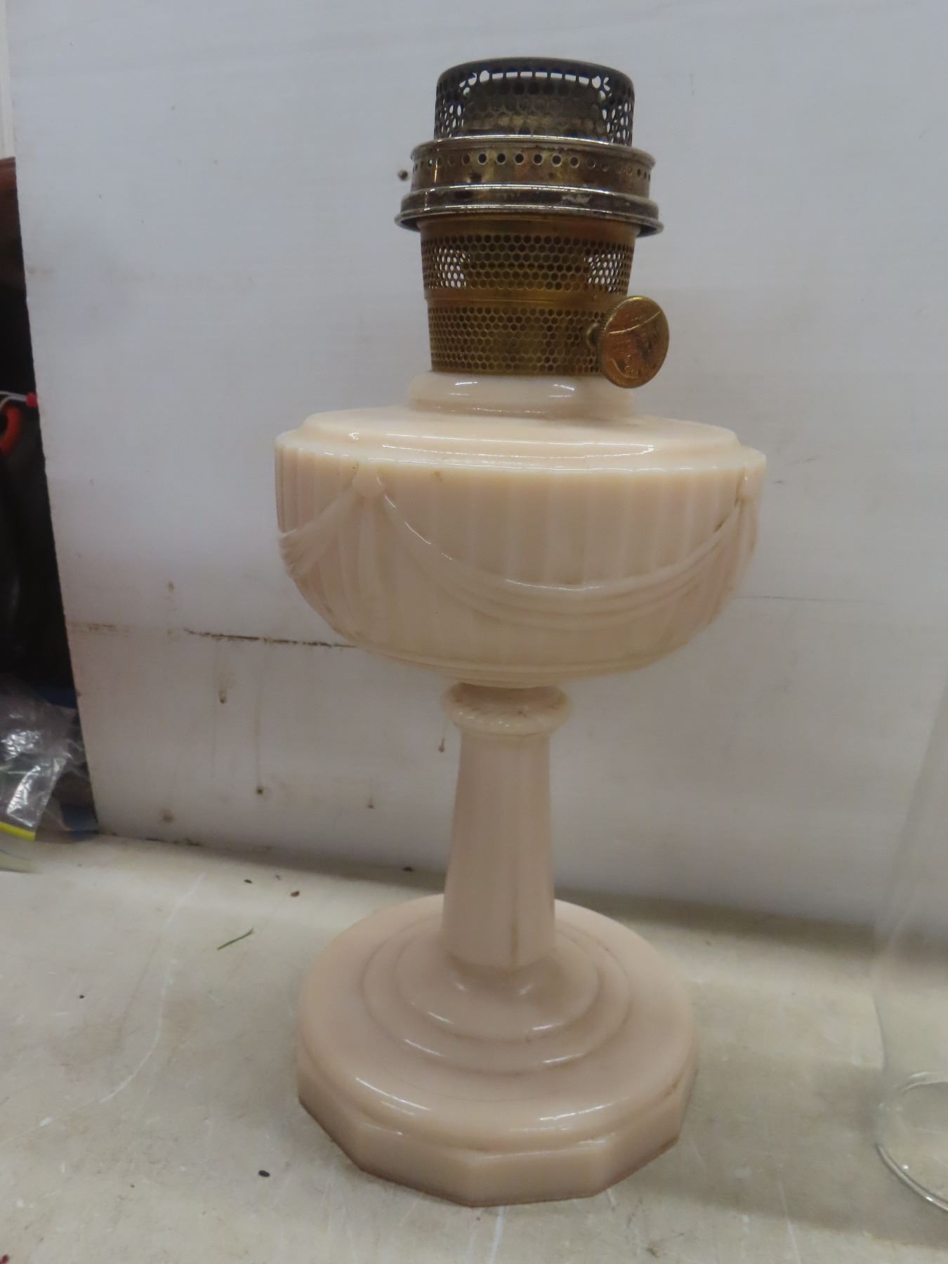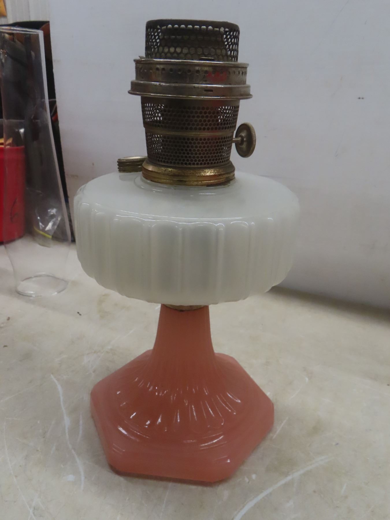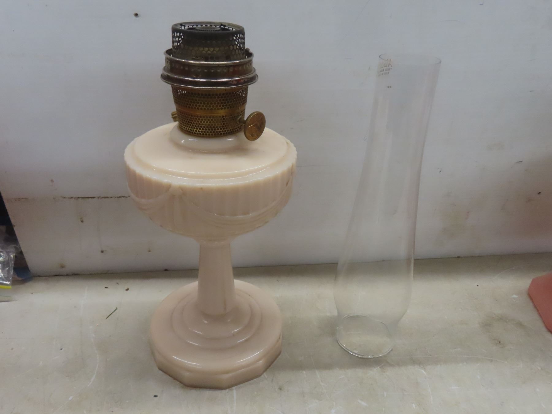 Two Aladdin Oil Lamps with Chimneys: Lincoln Drape (25") and Corinthian B116 in Pink & White (24")