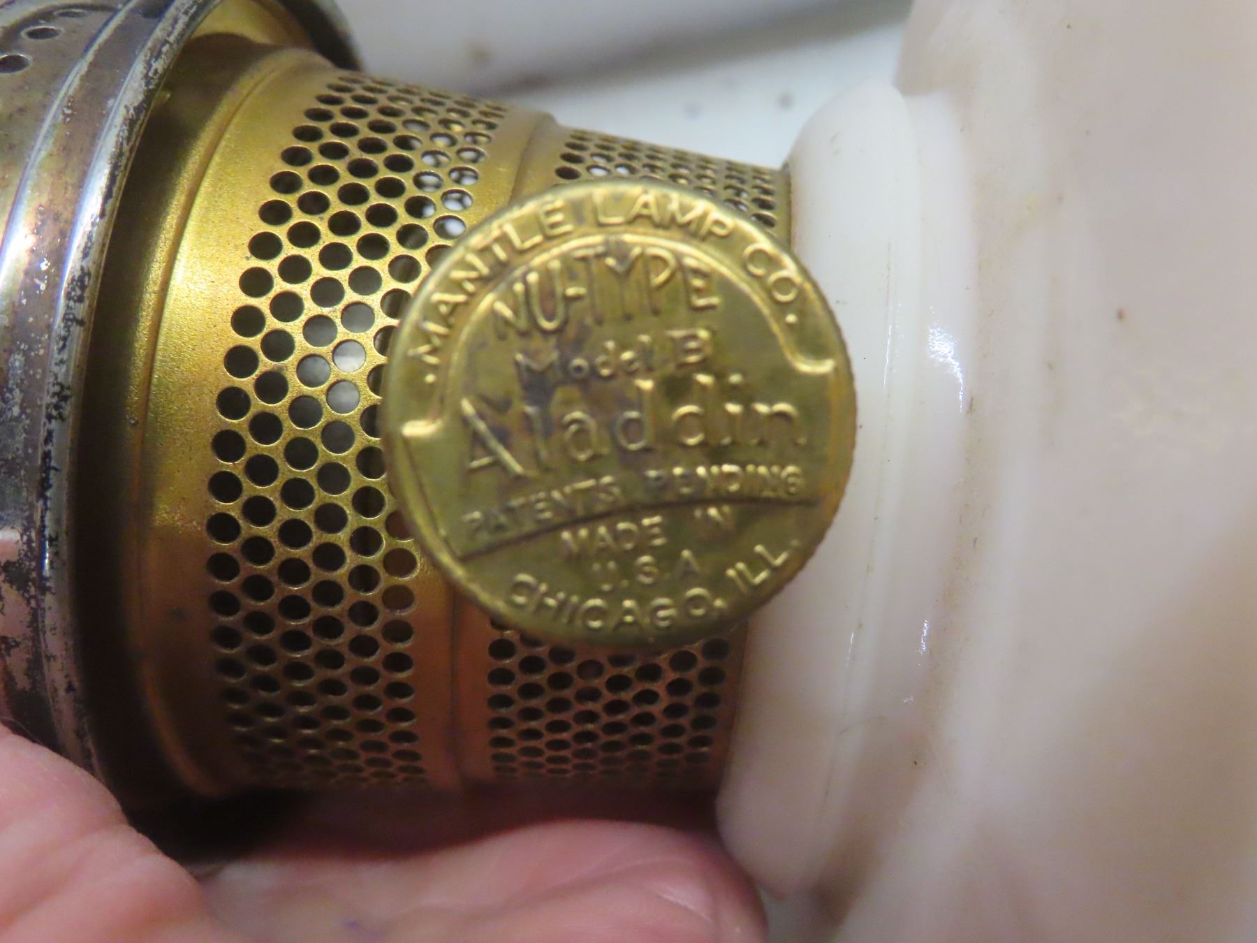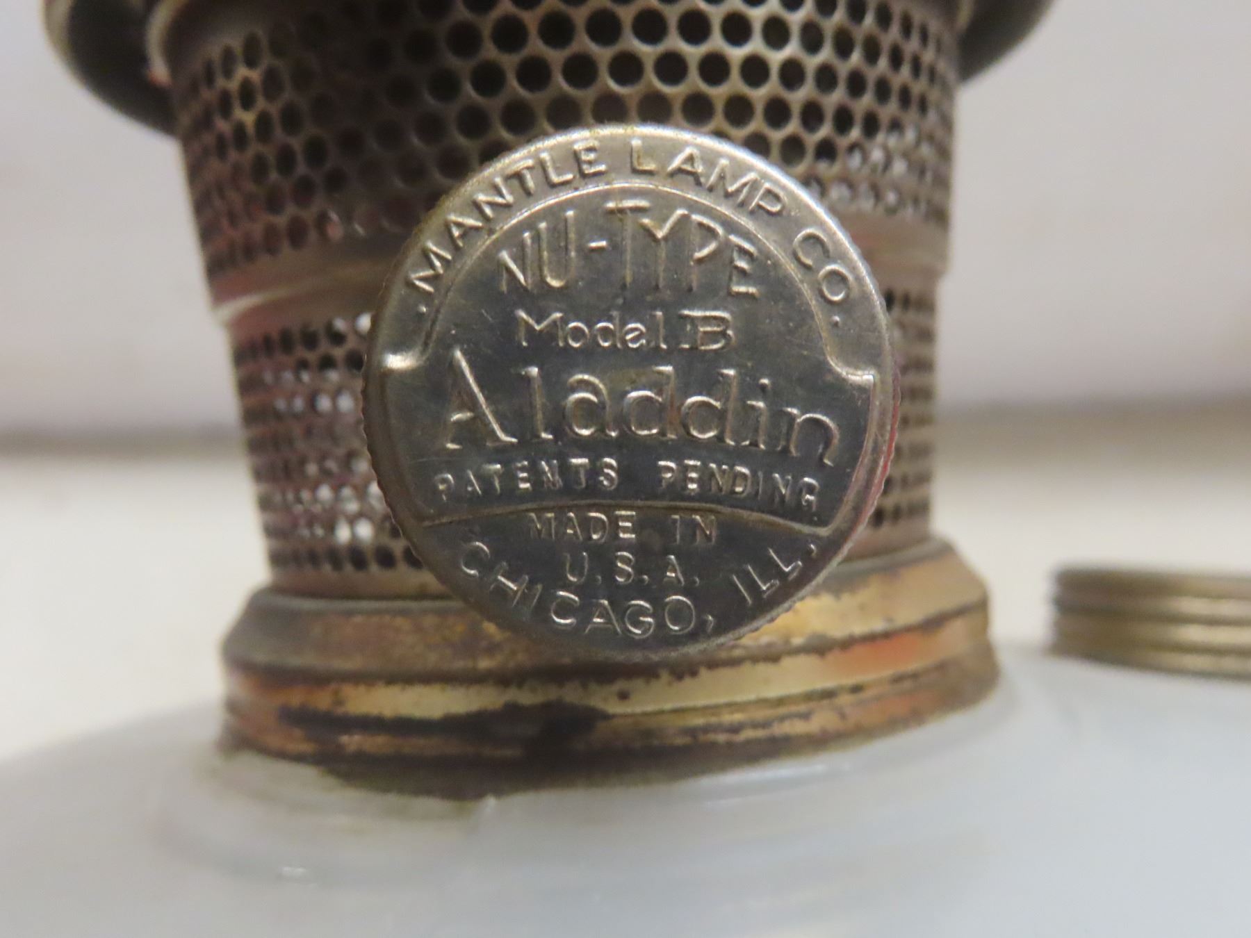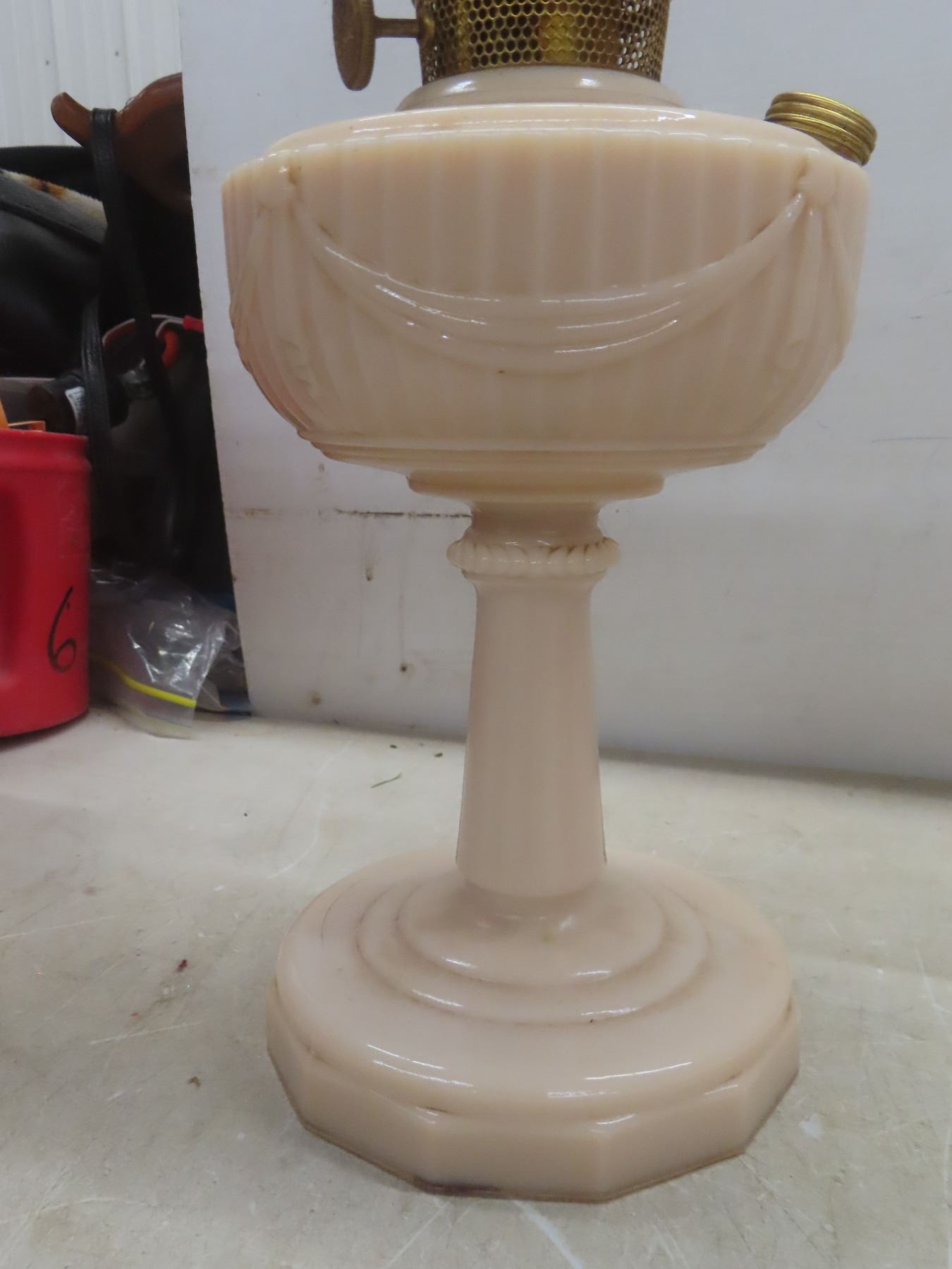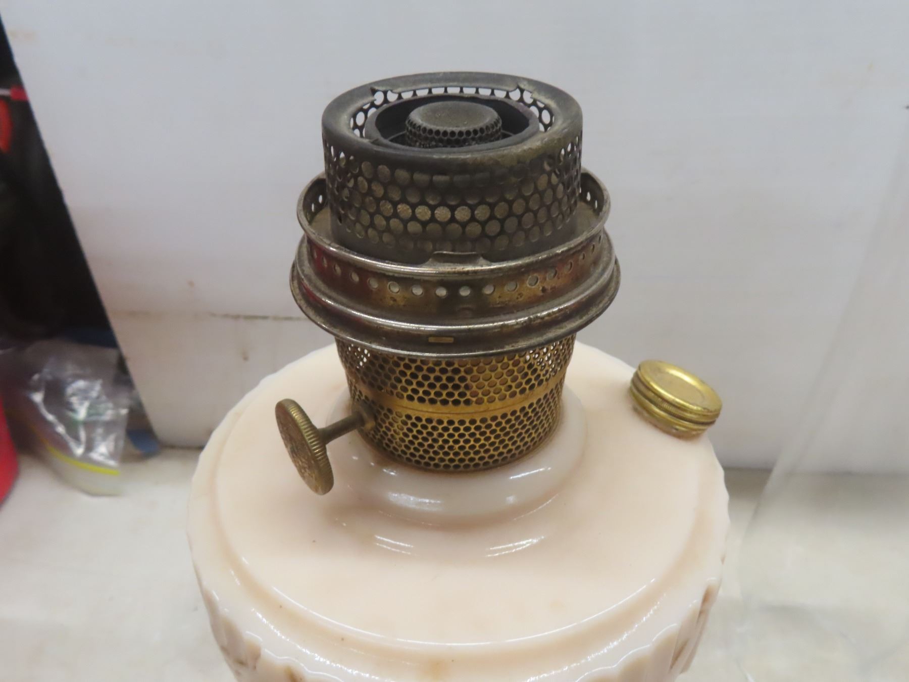 Two Aladdin Oil Lamps with Chimneys: Lincoln Drape (25") and Corinthian B116 in Pink & White (24")