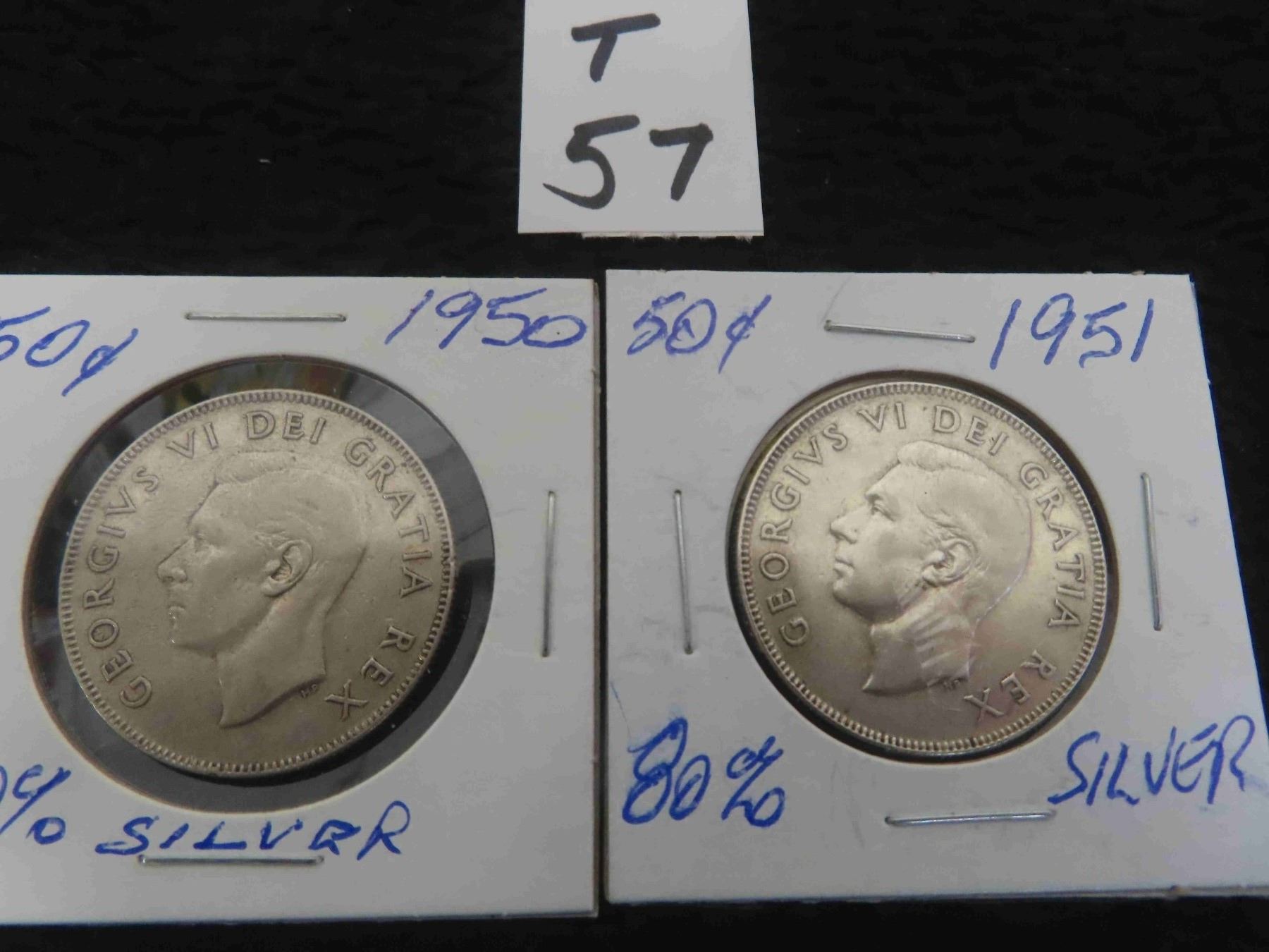 Two; Canadian 1950 and 1951 Canadian 50 cent pieces, 80% silver, circulated, ungraded.