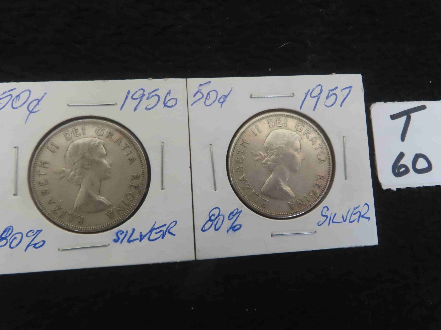 Two; Canadian 1956 and 1957 Canadian 50 cent pieces, 80% silver, circulated, ungraded.