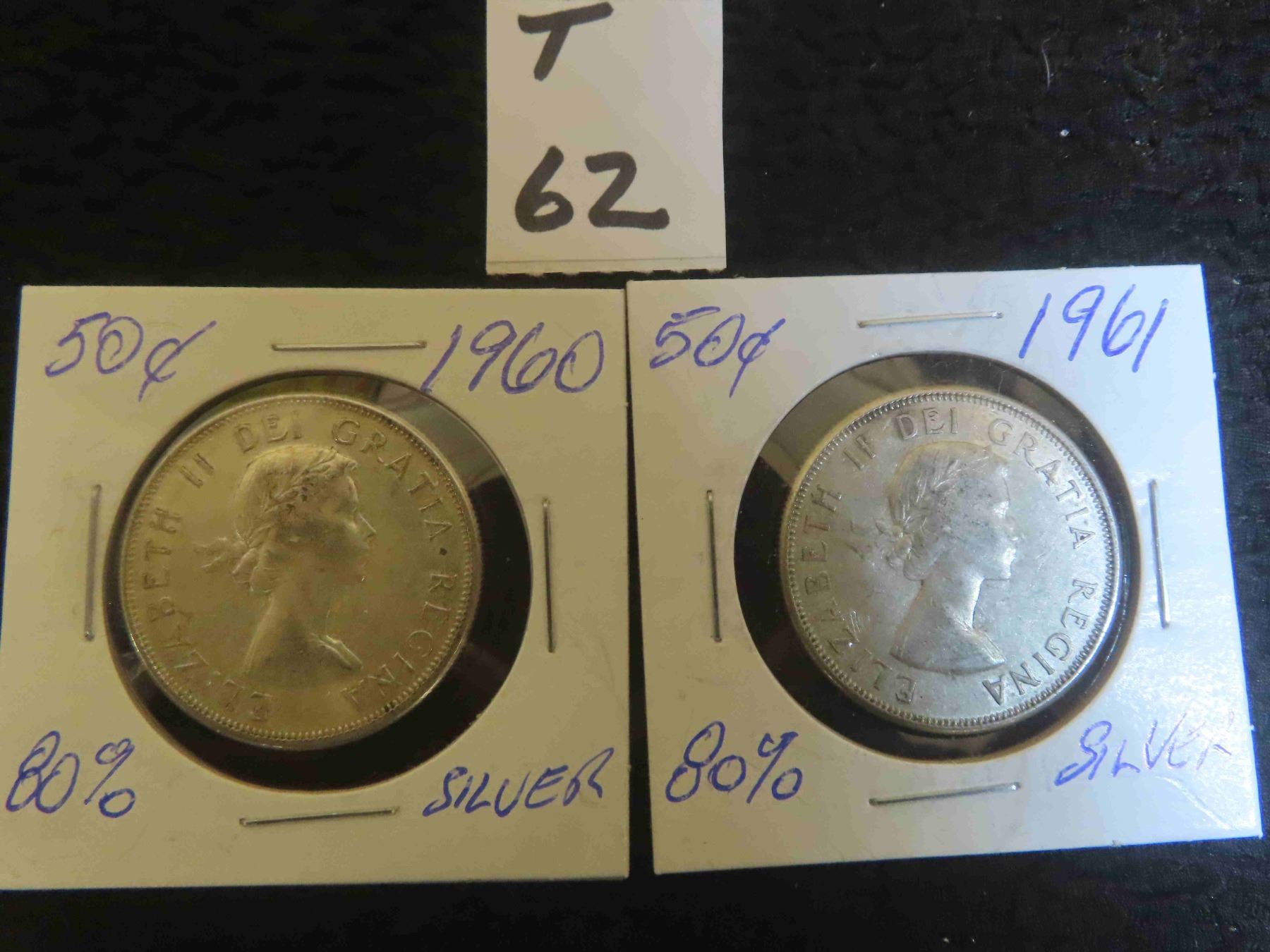 Two; Canadian 1960 and 1961 Canadian 50 cent pieces, 80% silver, circulated, ungraded.
