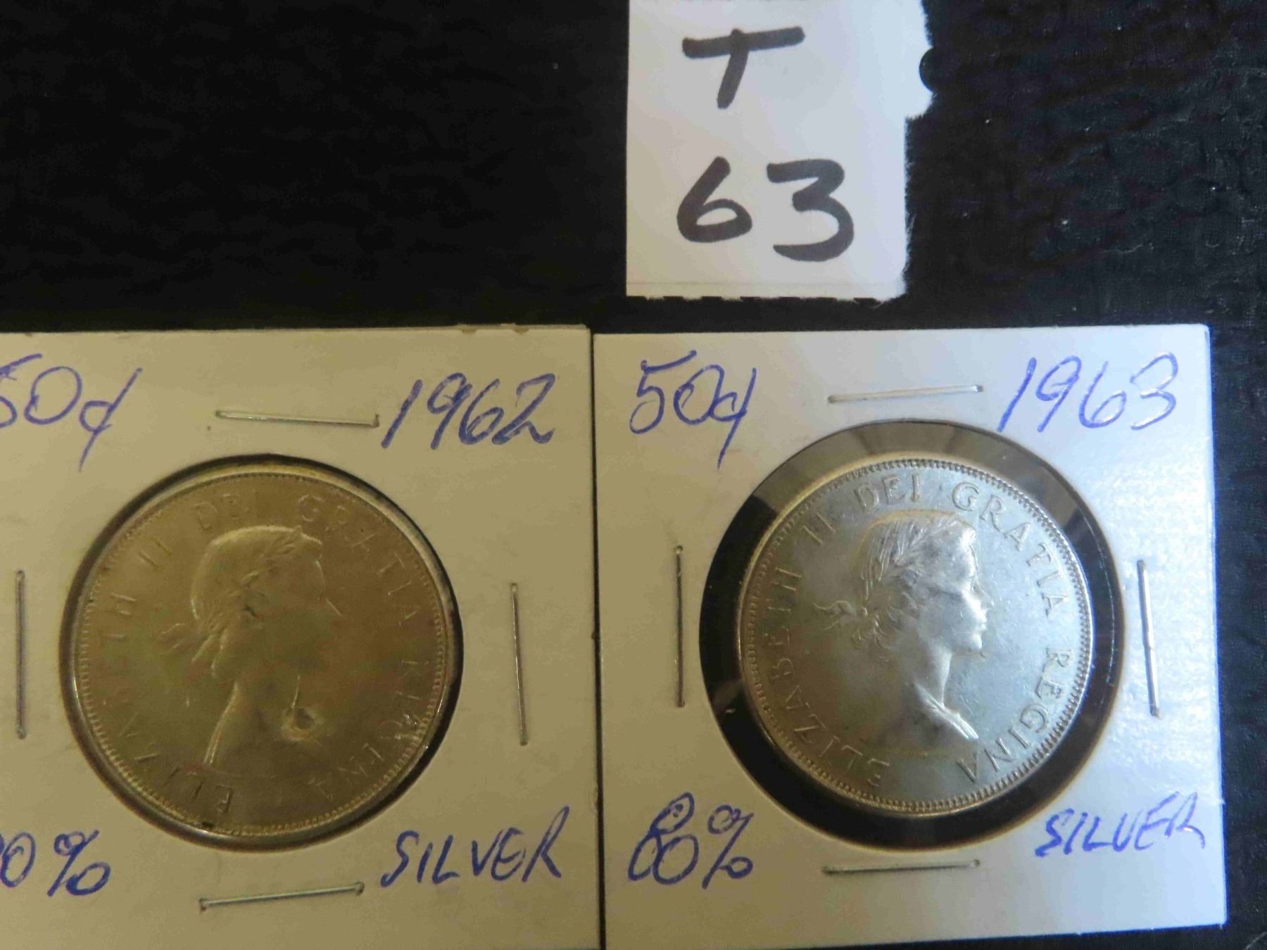 Two; Canadian 1962 and 1963 Canadian 50 cent pieces, 80% silver, circulated, ungraded.
