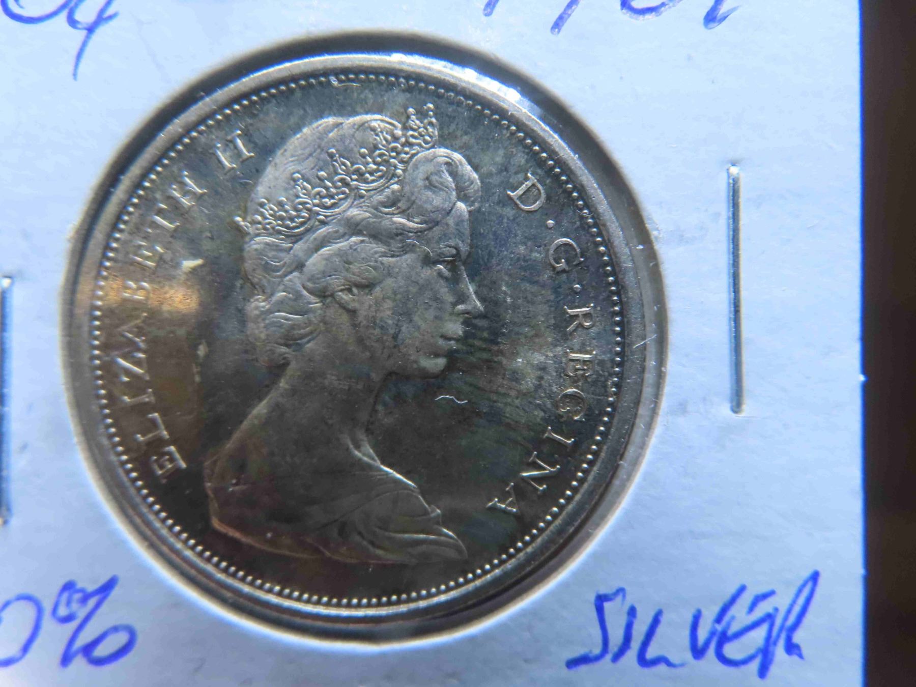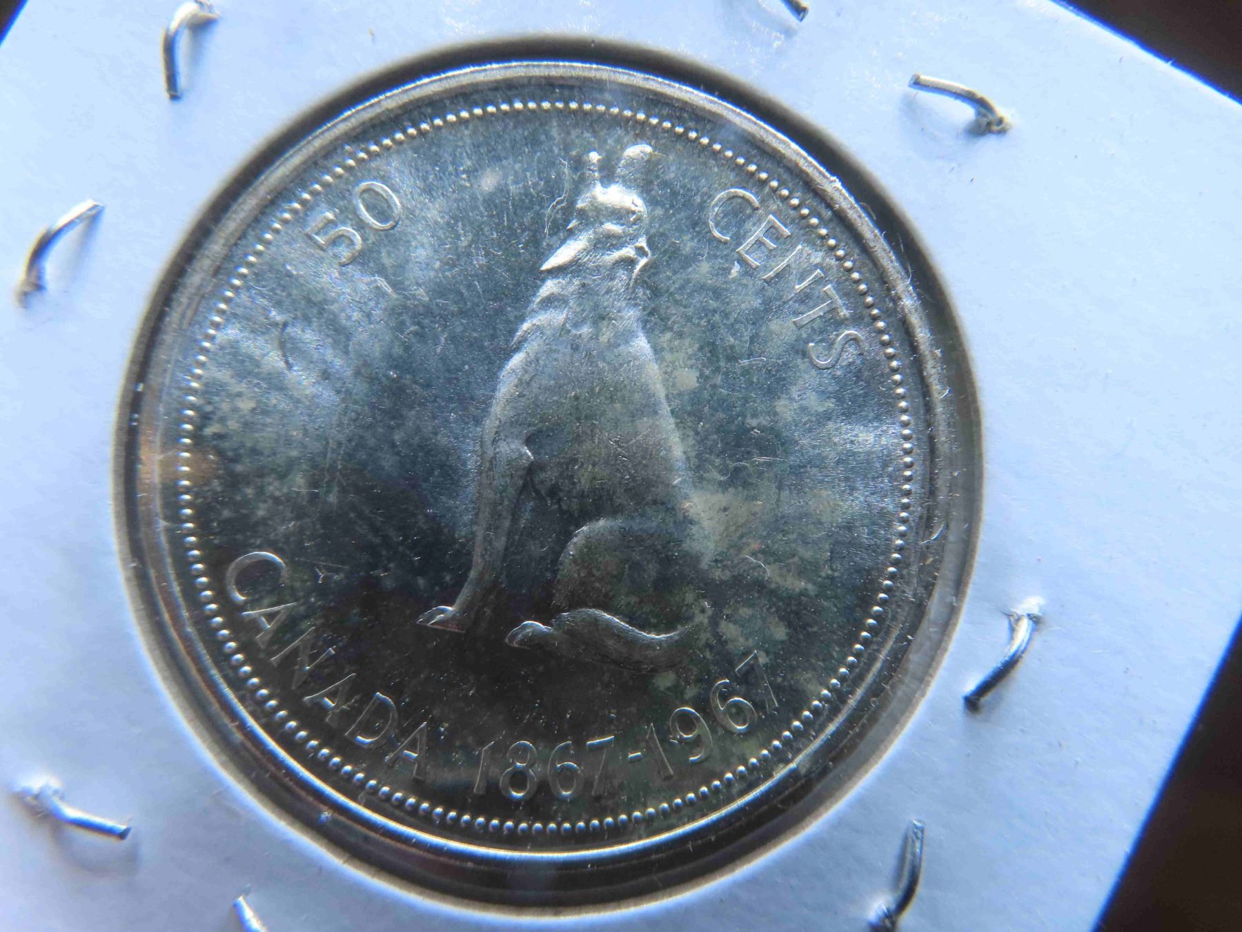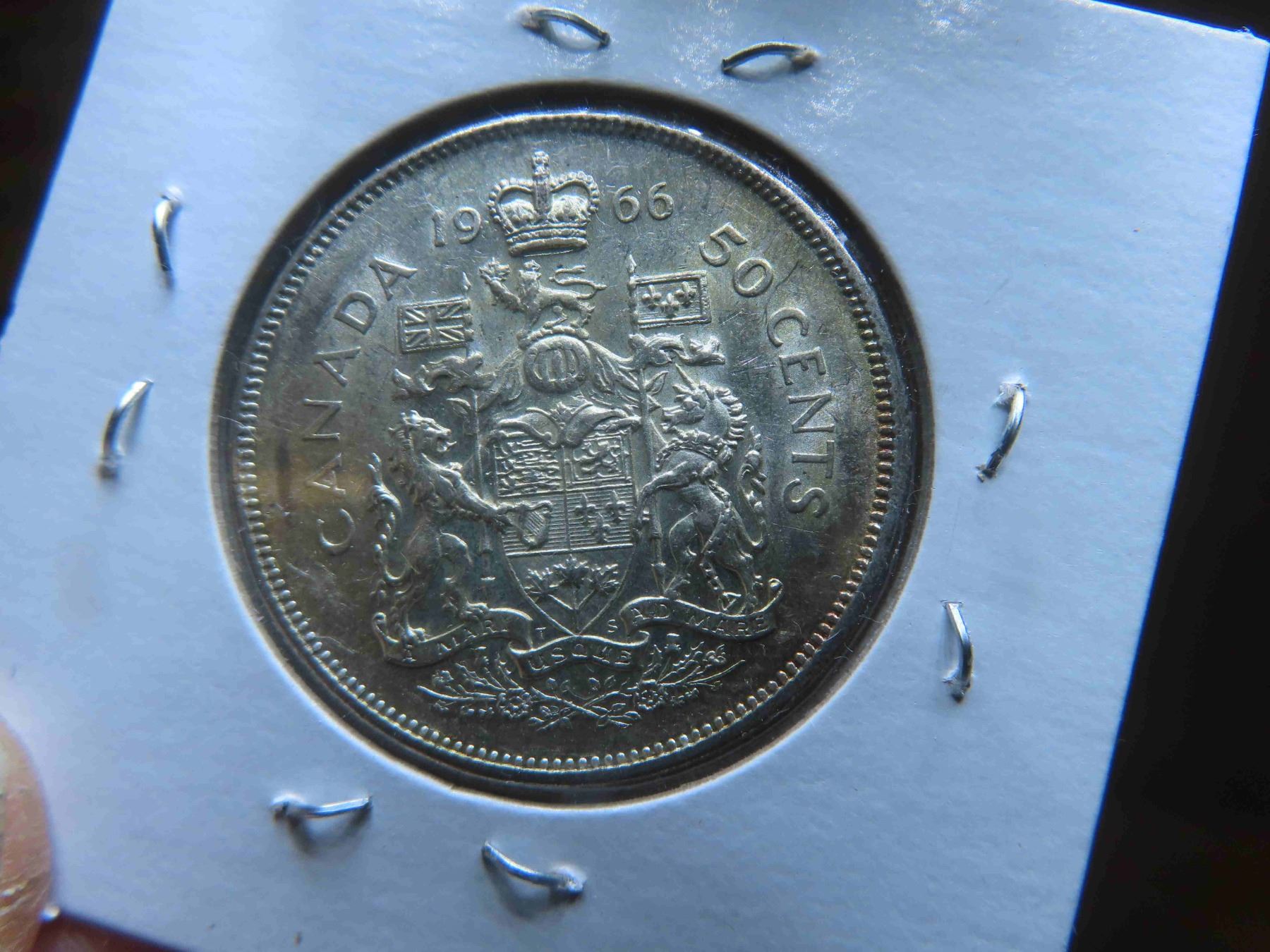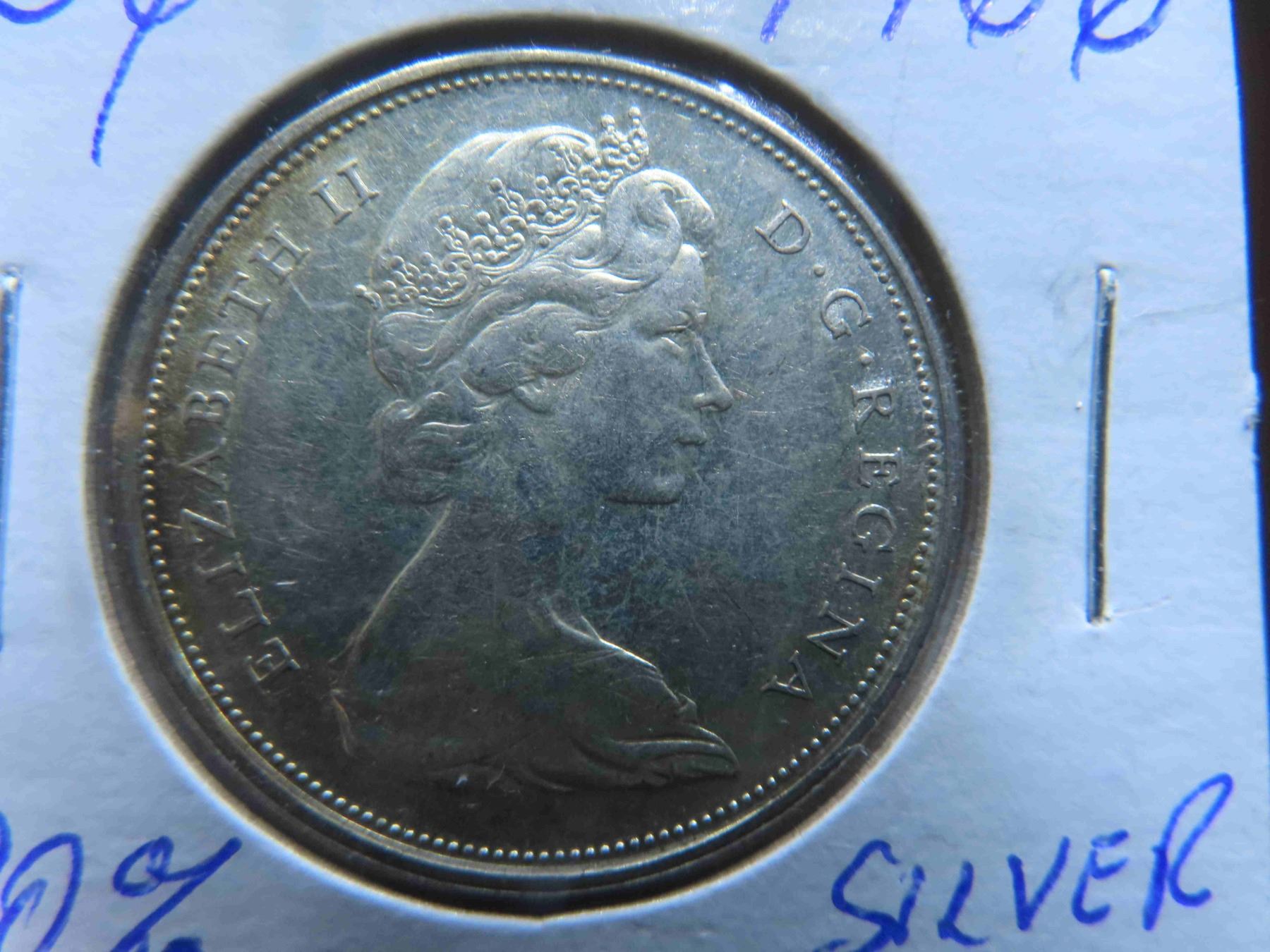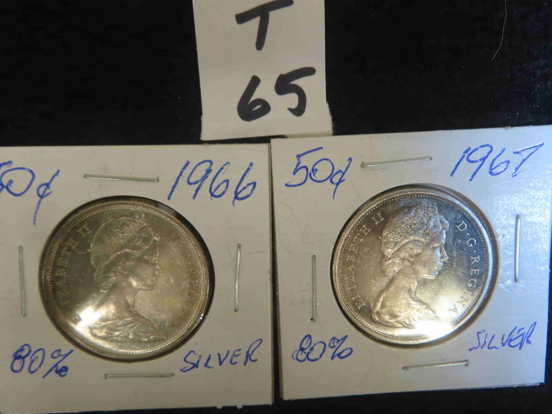 Two; Canadian 1966 and 1967 (both coins in nice shape) Canadian 50 cent pieces, 80% silver, circulated, ungraded.