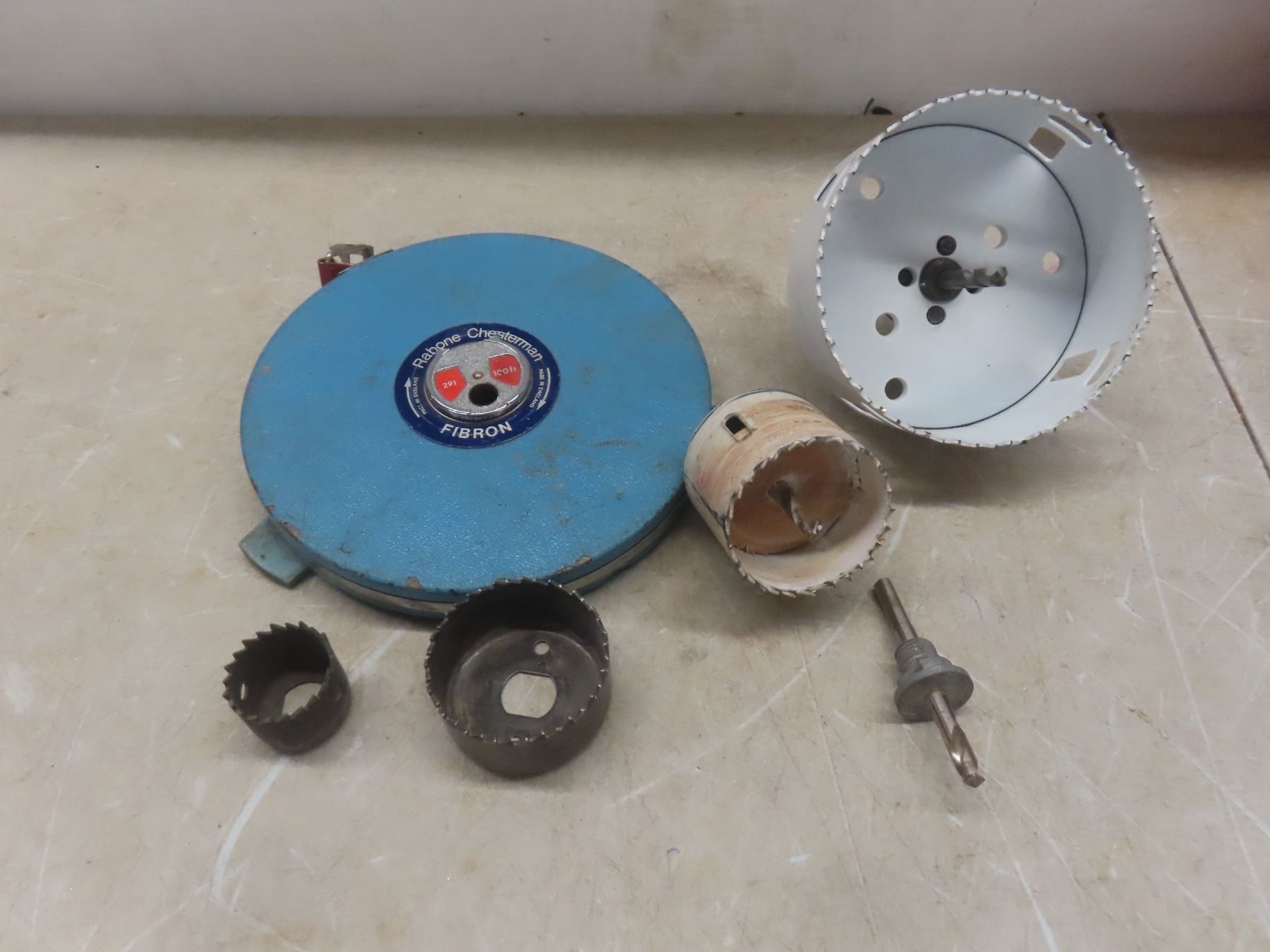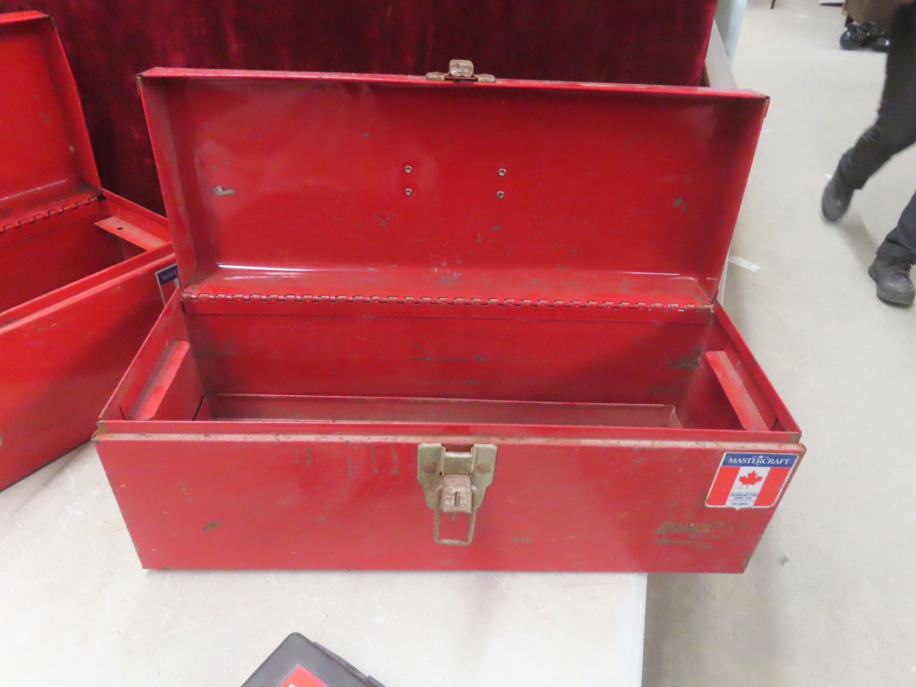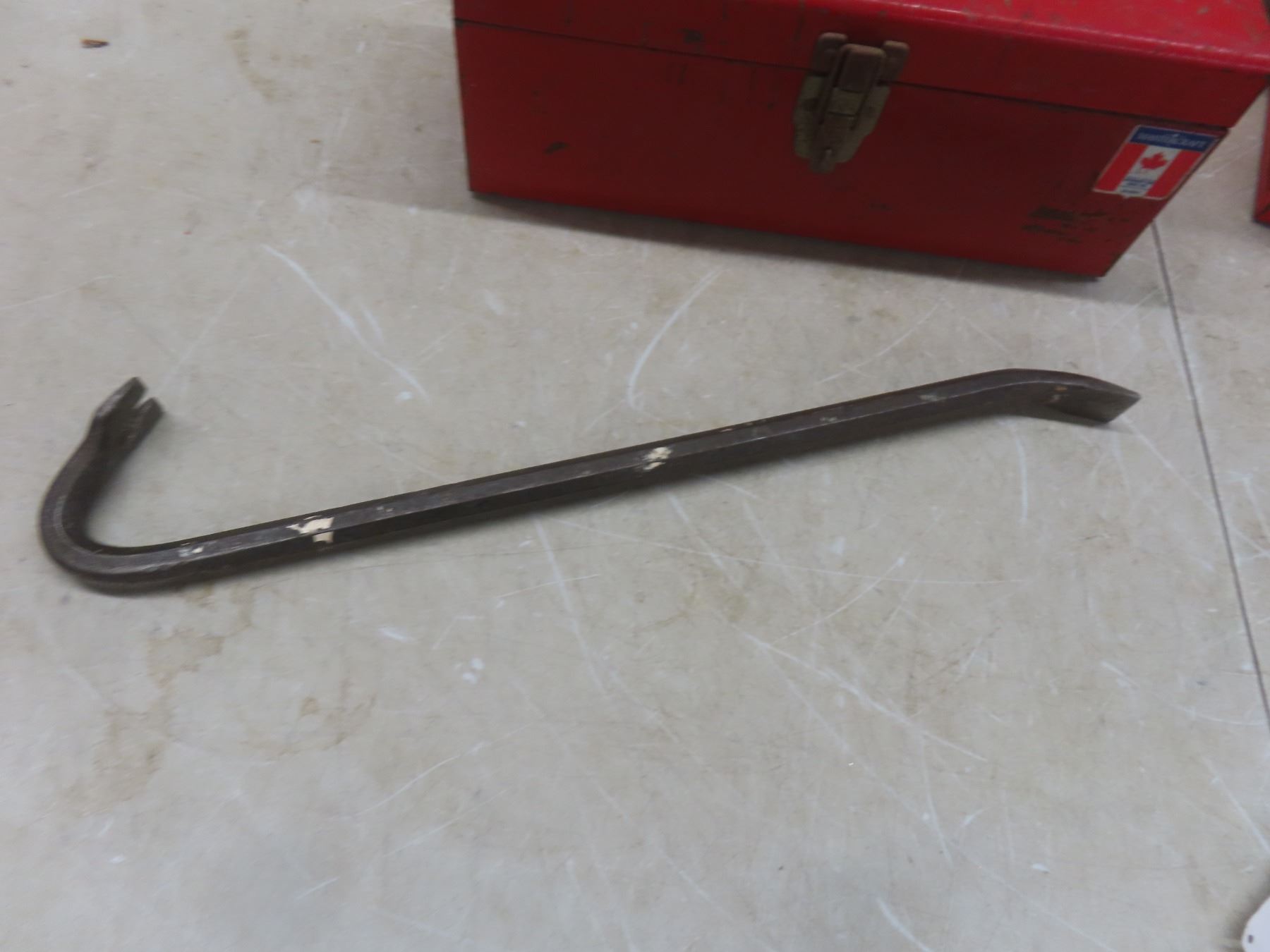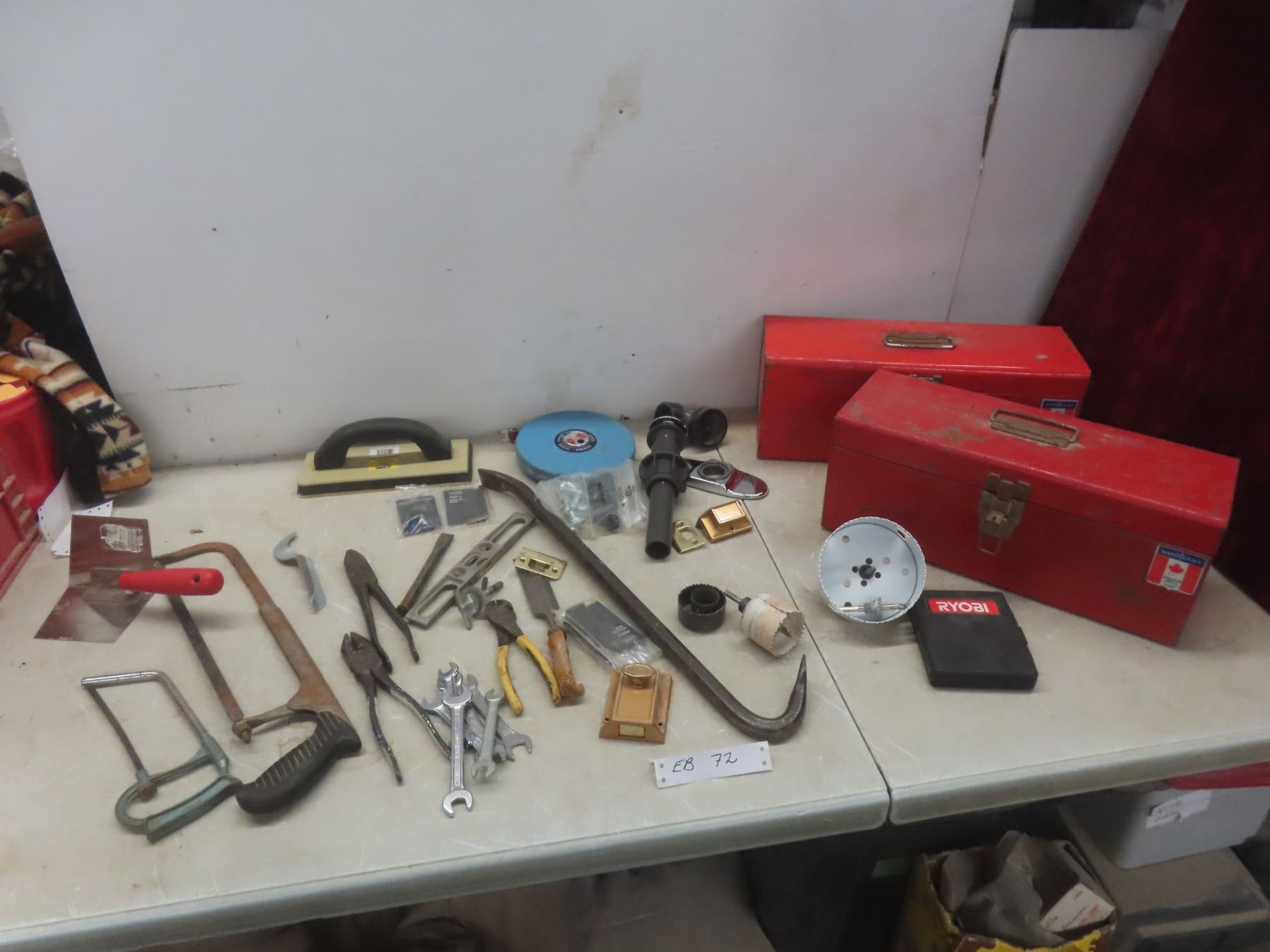 Two Metal Toolboxes with Tape Measure, Wrenches, Hole Saw, Crowbar, Chisel, and More