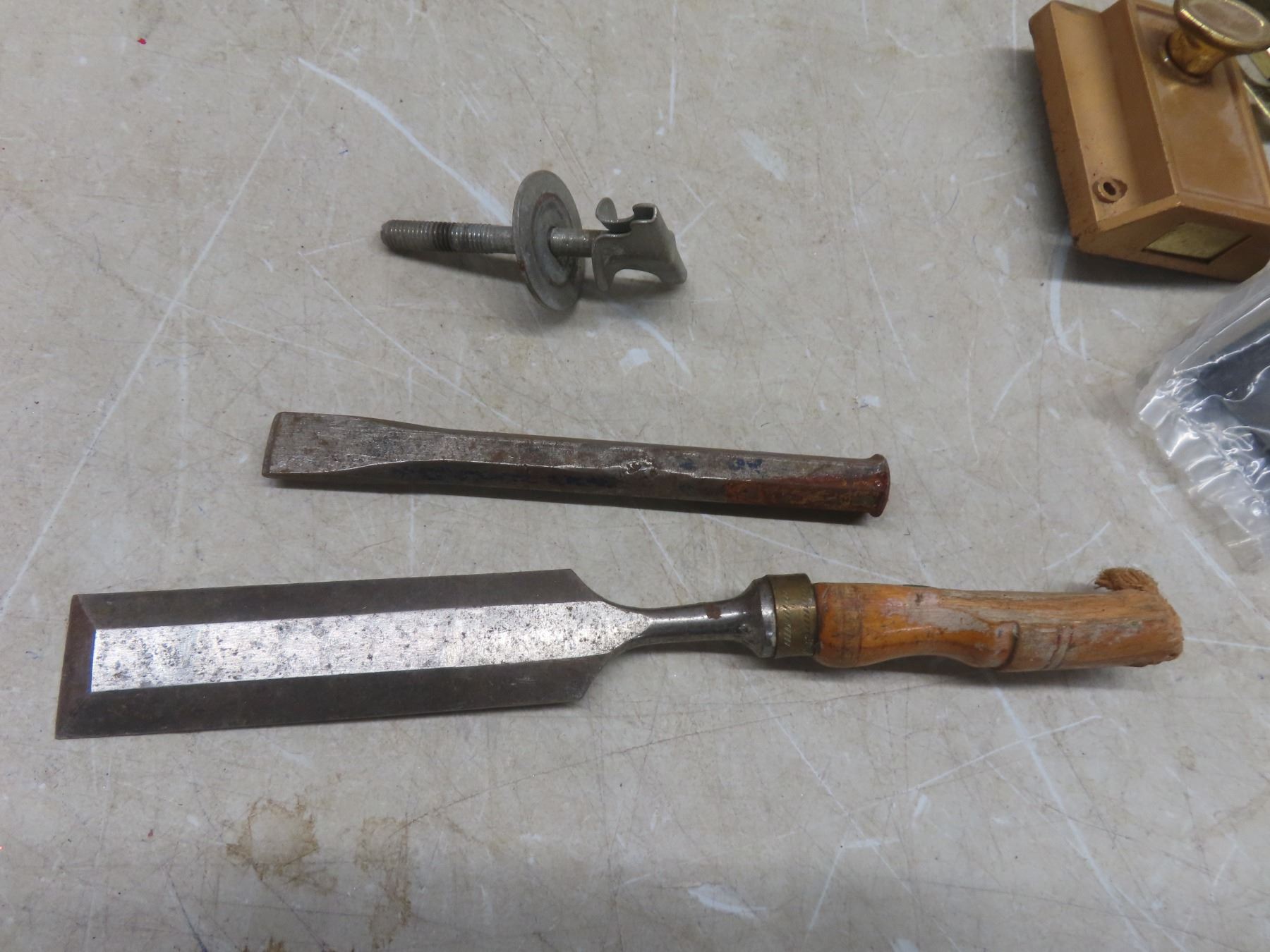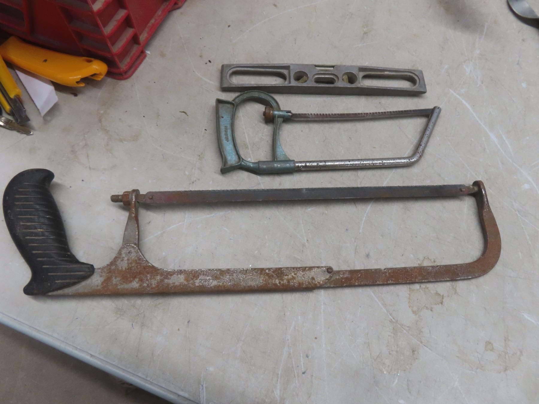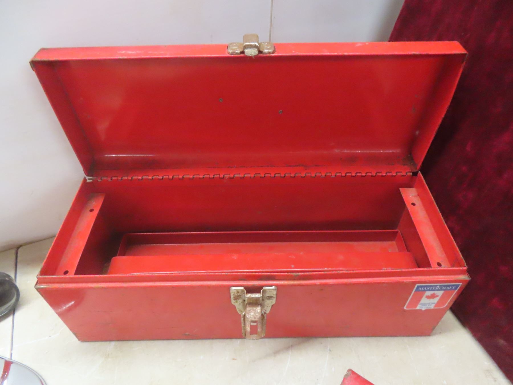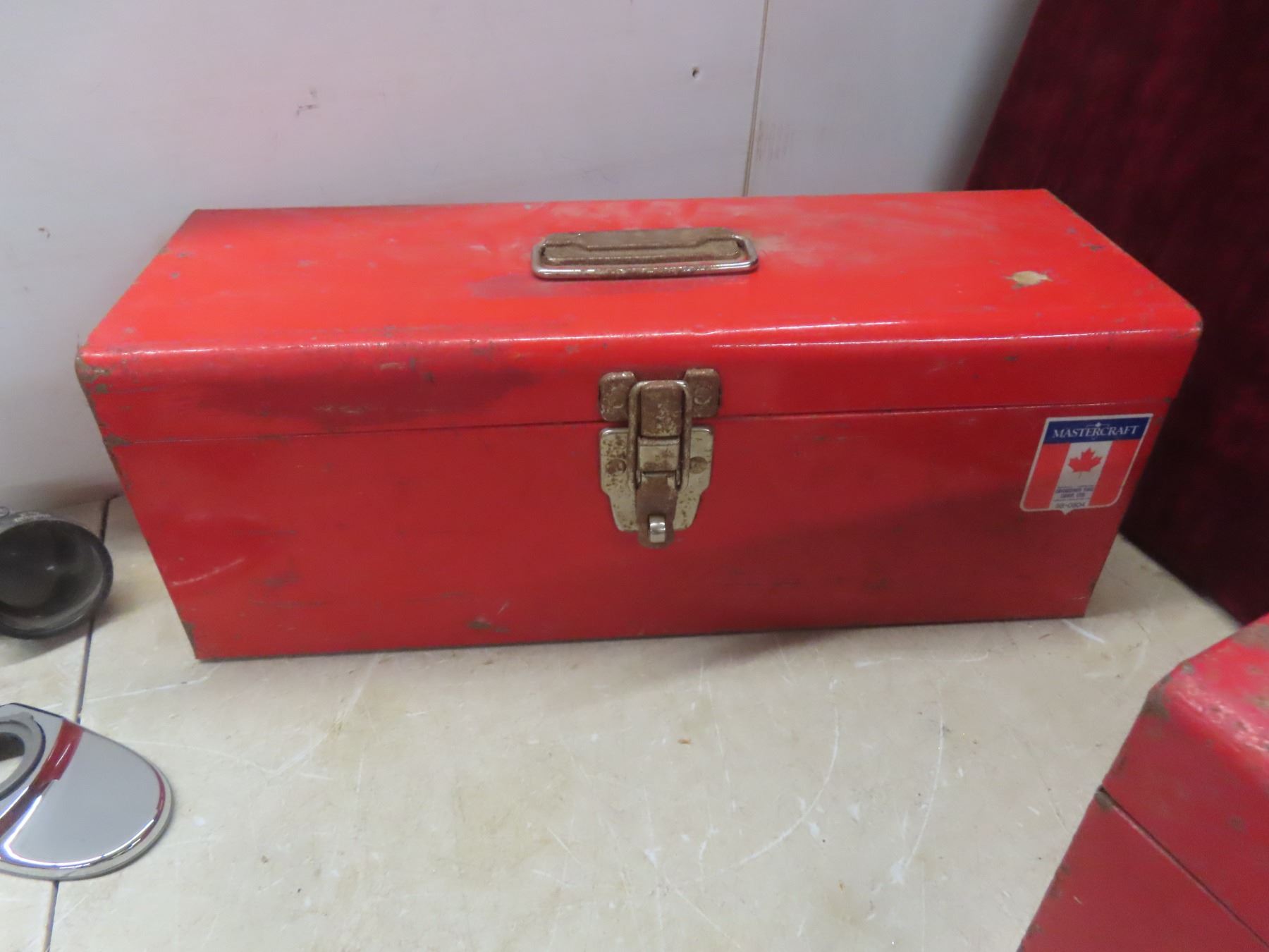 Two Metal Toolboxes with Tape Measure, Wrenches, Hole Saw, Crowbar, Chisel, and More