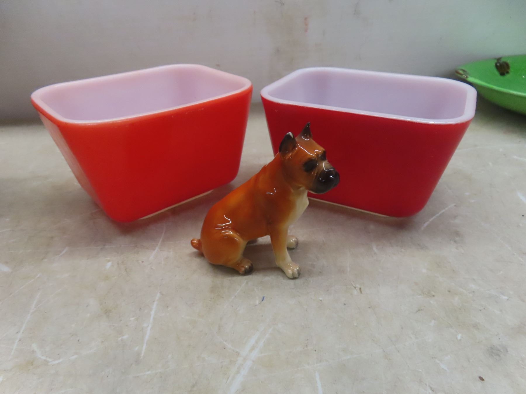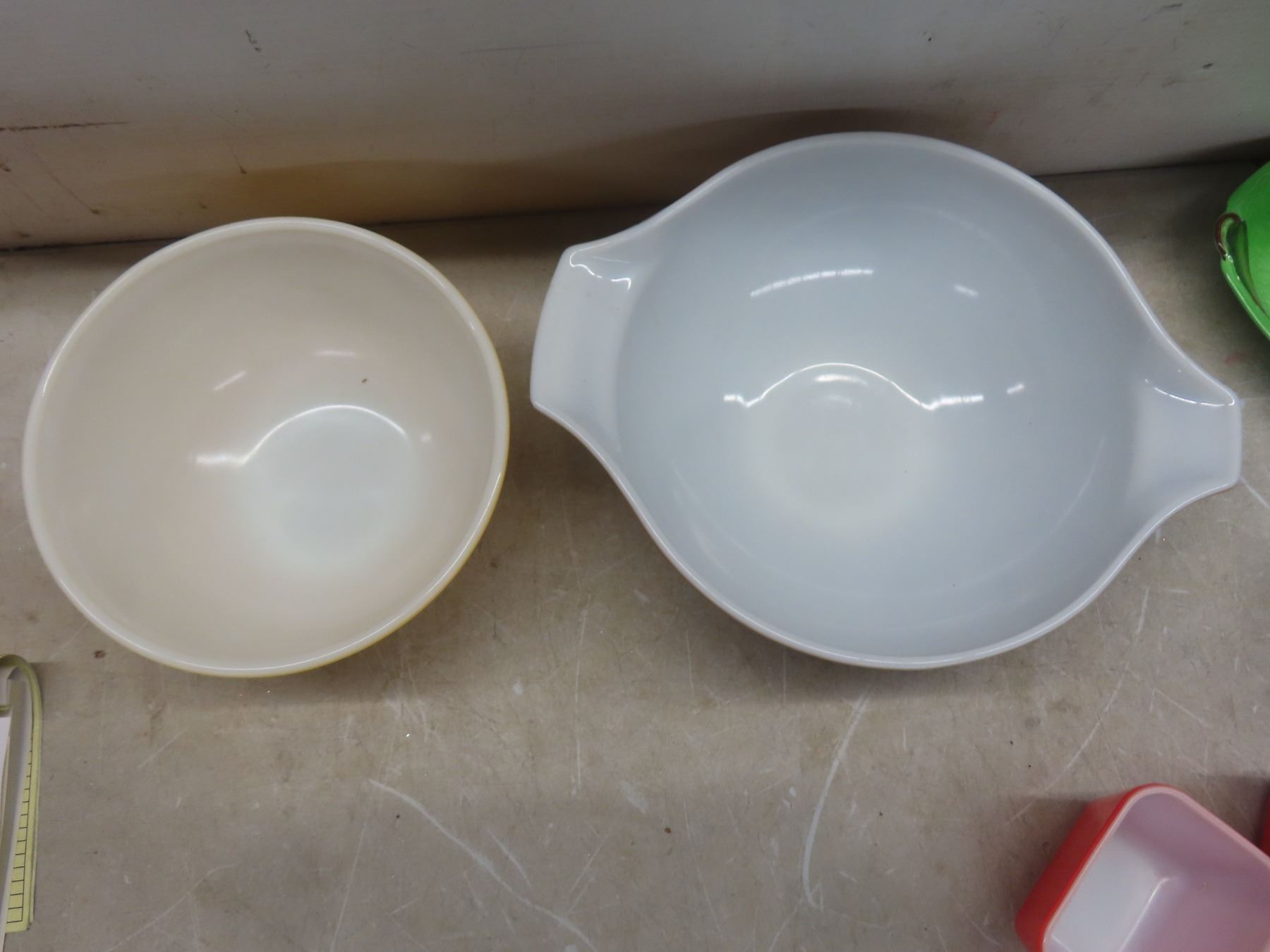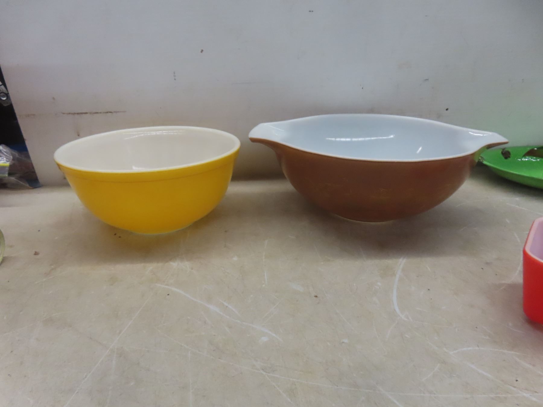 Two Pyrex Mixing Bowls, One Fire-King Mixing Bowl, and Two Pyrex Refrigerator Dishes