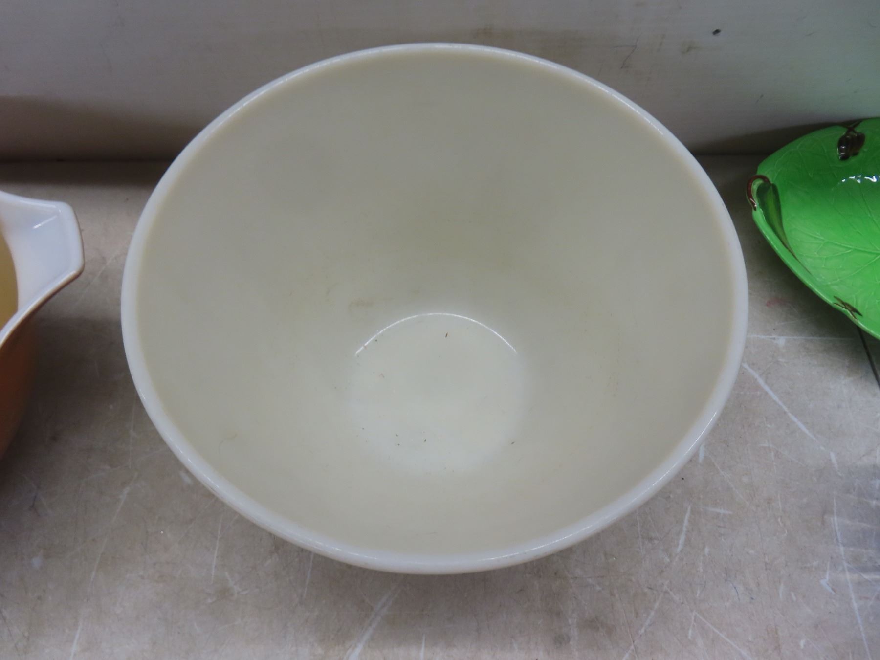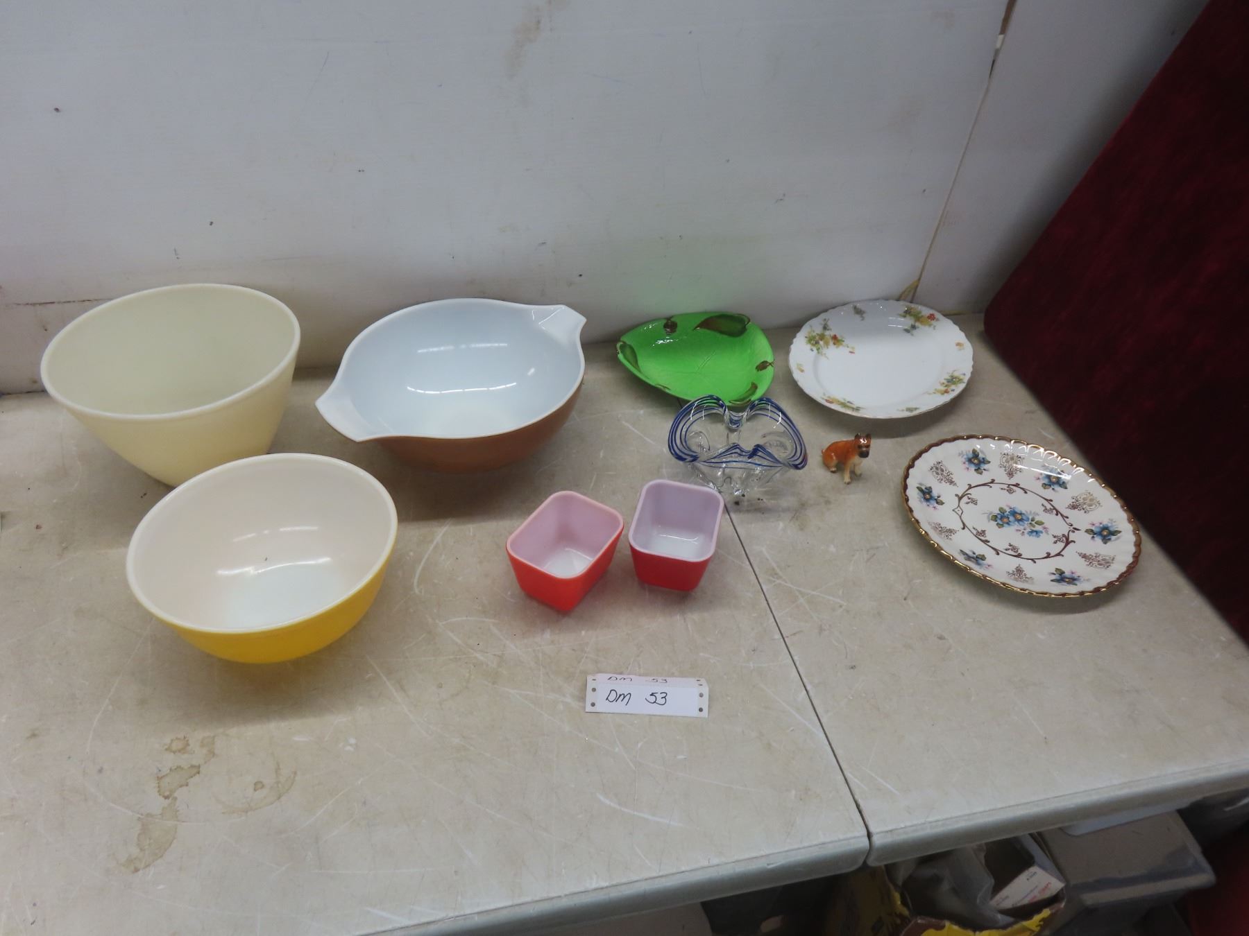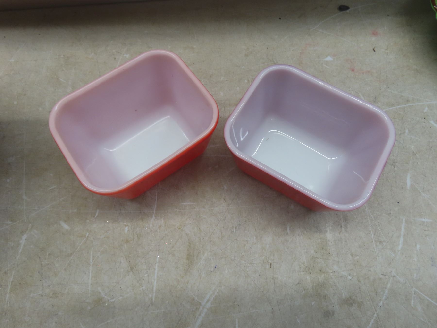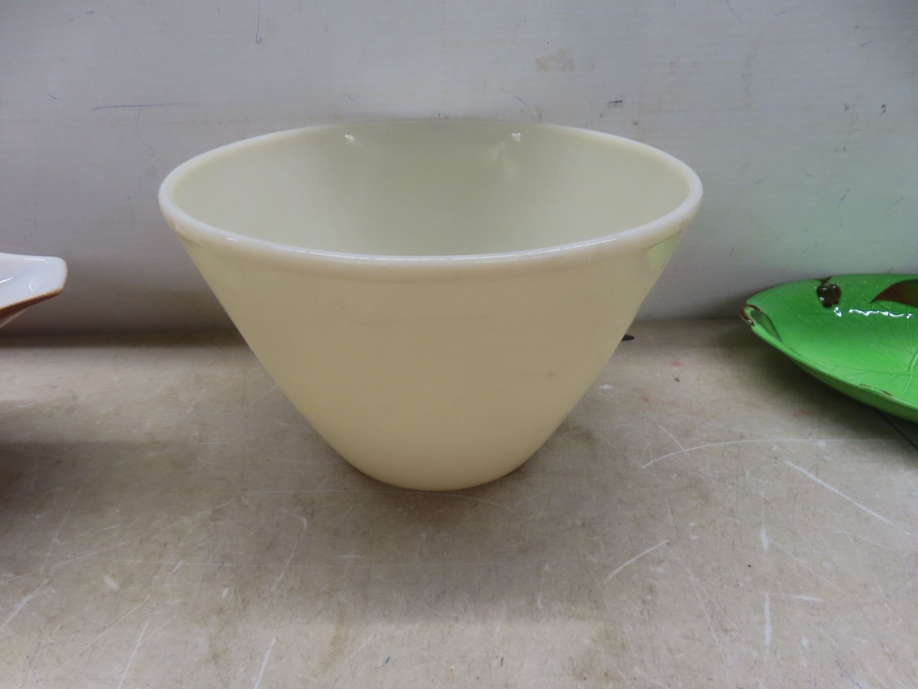 Two Pyrex Mixing Bowls, One Fire-King Mixing Bowl, and Two Pyrex Refrigerator Dishes