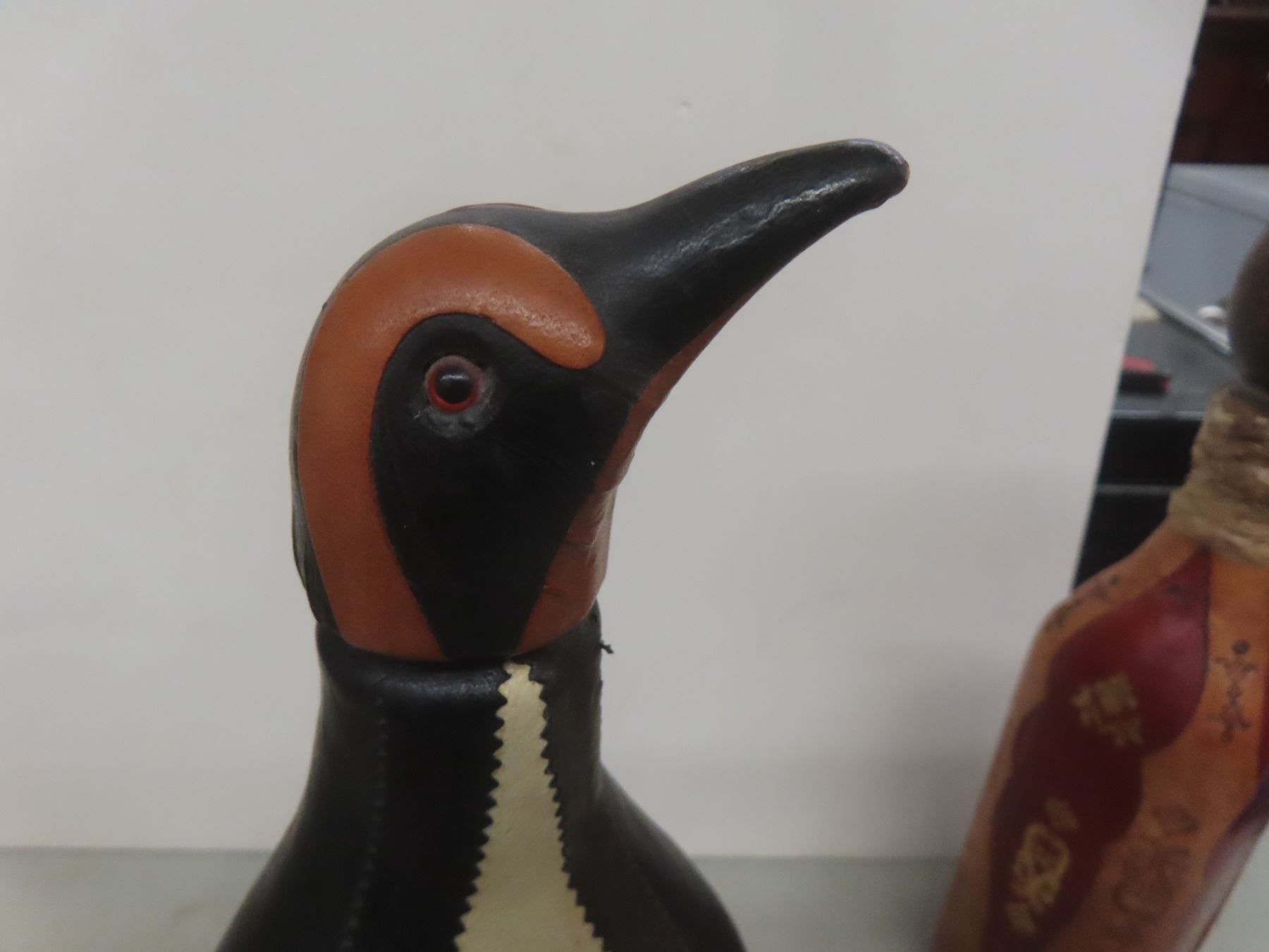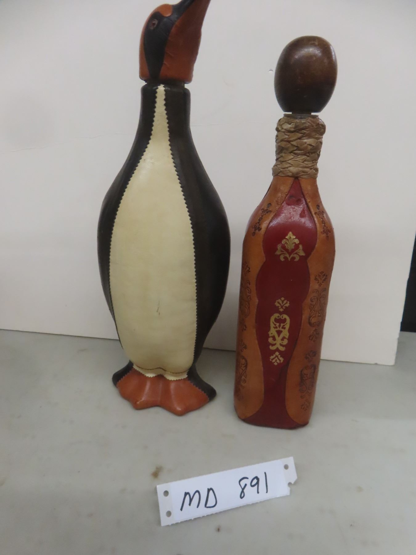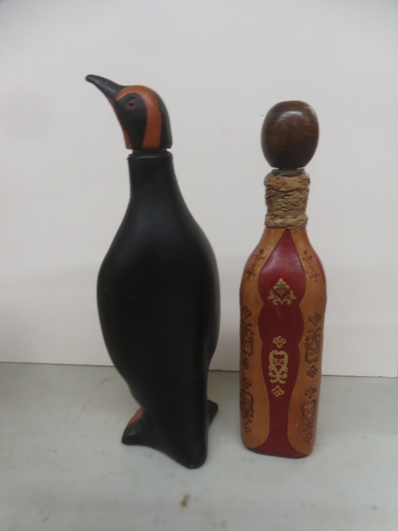 Two Vintage Italian Leather-Wrapped Decanters Including Penguin Wrapped