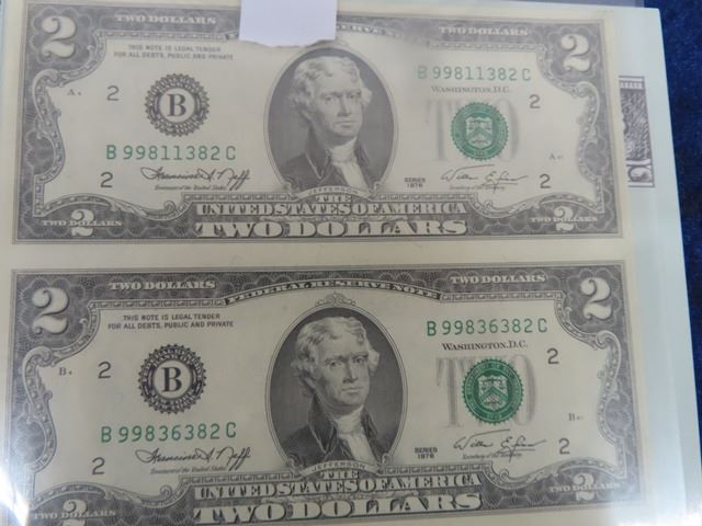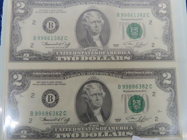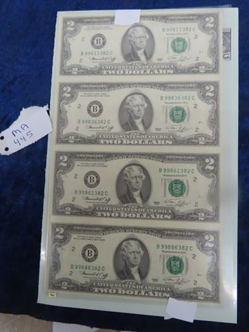 US 1976 $2 Un-Cut Sheet of 4 Bi-Centennial YR Mind Cond