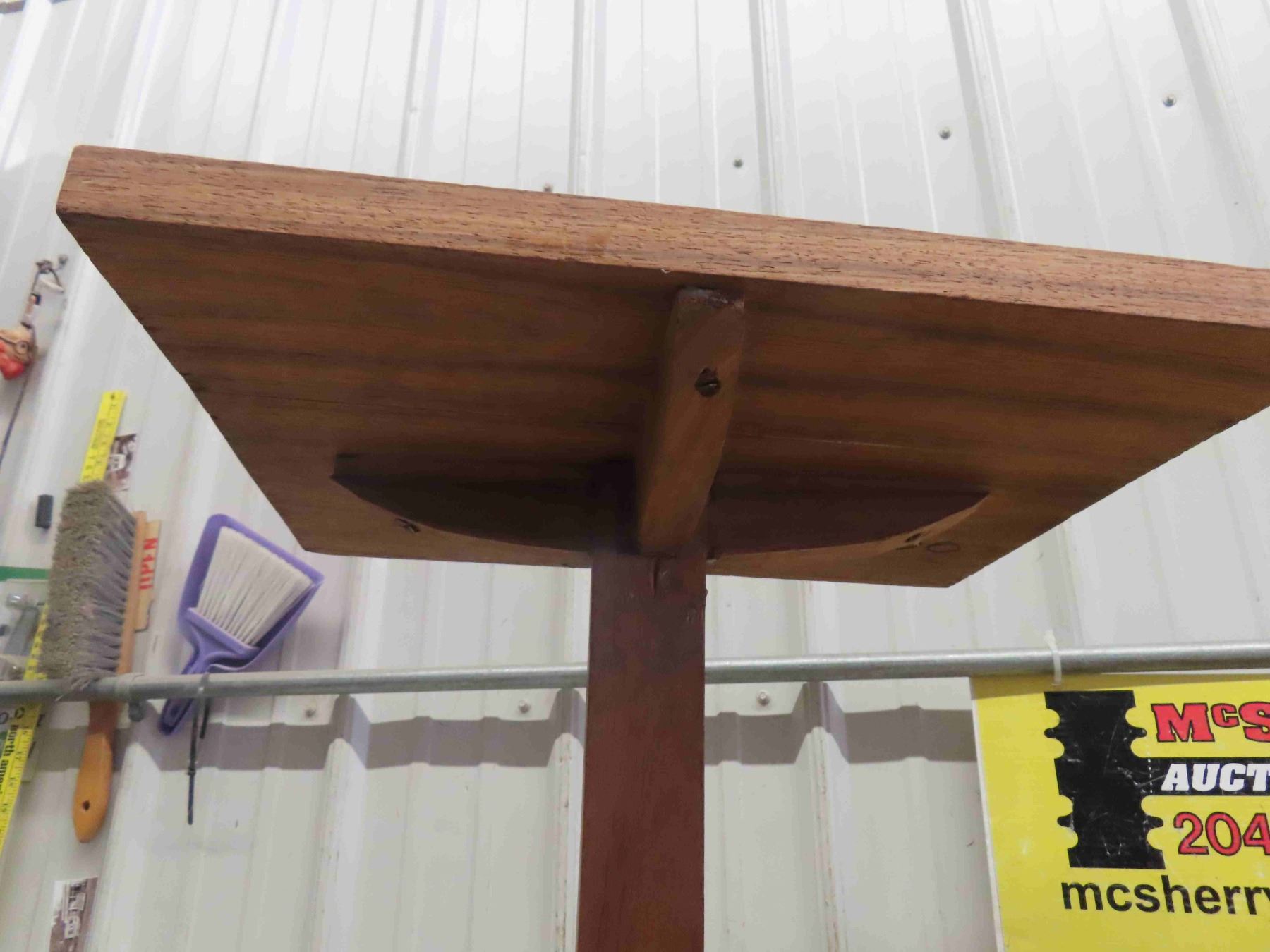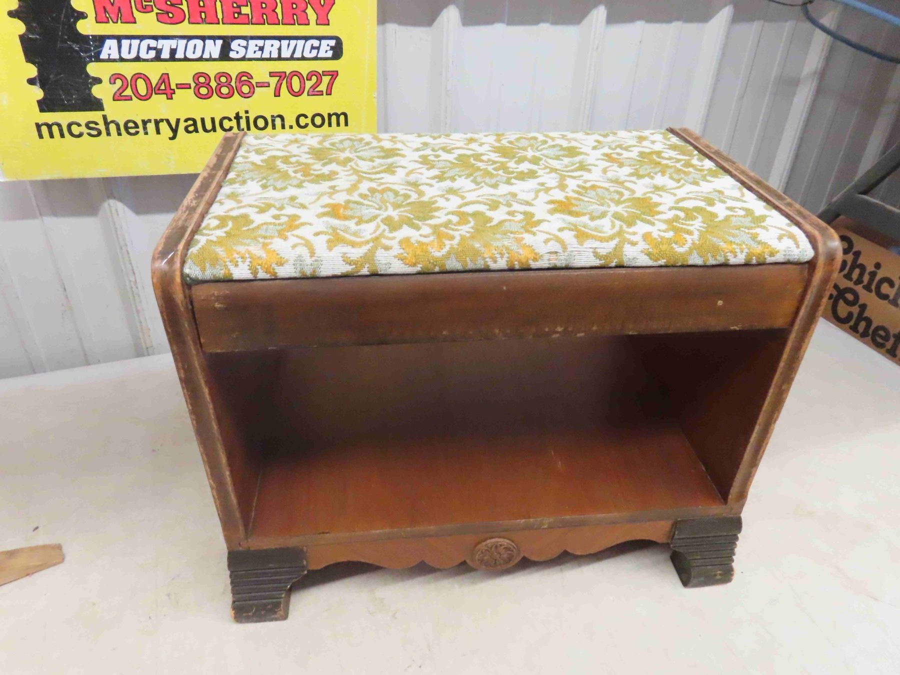 Upholstered Wood Bench 12" X 15" x 19" + Carved Top Table 14.5" x 18" x 23"