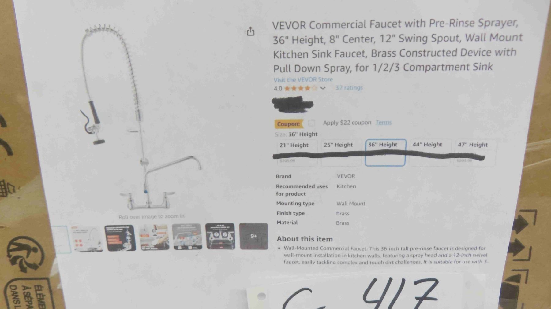 VEVOR Commercial Faucet with Pre-Rinse Sprayer, 36" Height, 8" Center, 12" Swing Spout, Wall Mount Kitchen Sink Faucet, Brass Constructed Device with Pull Down Spray, for 1/2/3 Compartment Sink - New or Store Return