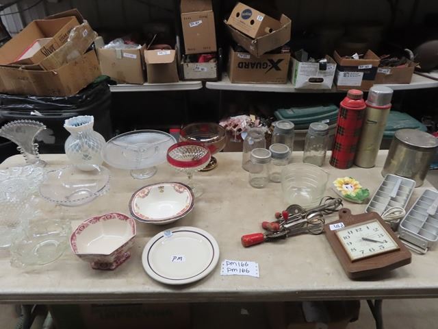 VIntage Thermos, Ice Trays, Egg Beaters, Jars, Improves Crown, Jewel , Clock, Clear Glass, Marlborough Inn Plate
