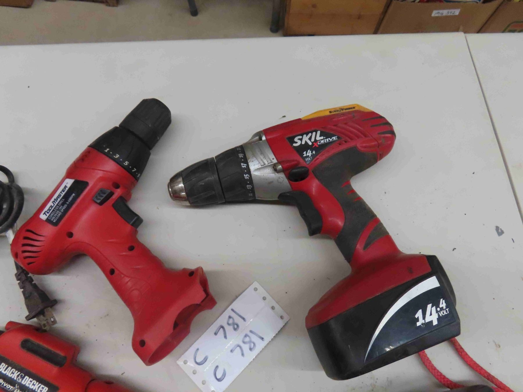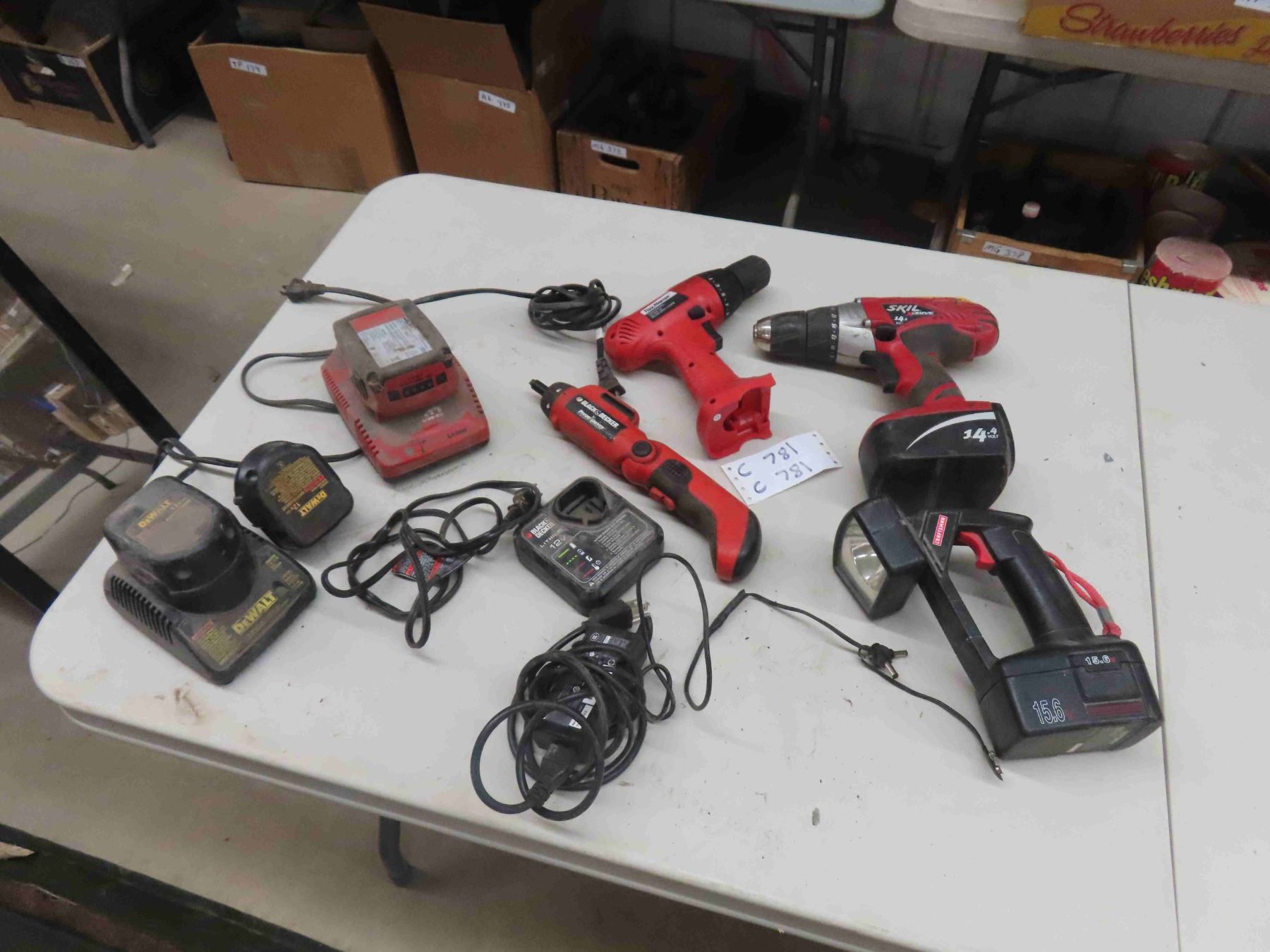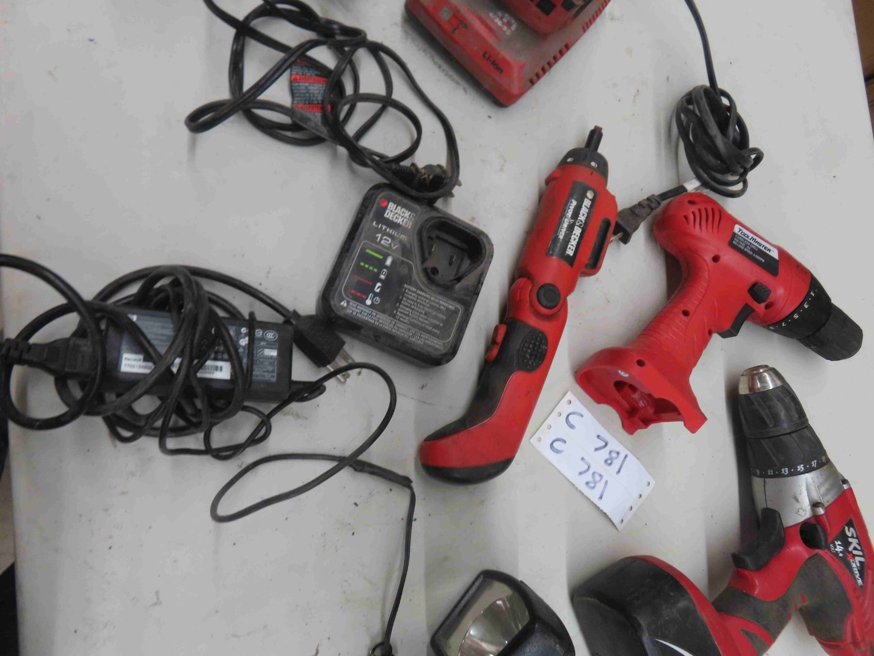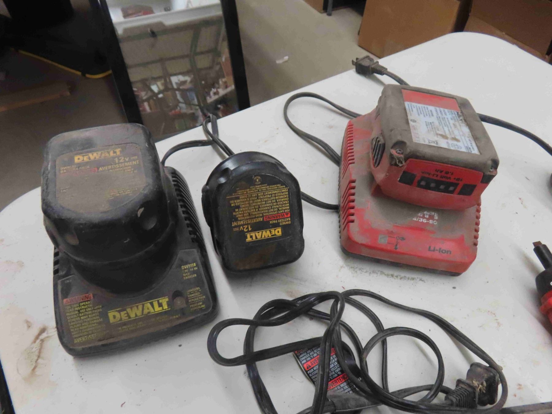 Various Cordless Tools: 2 Drills , Black and Decker 12V Screwdriver with Charger, Hilti 18V Battery and Charger, Dewalt Charger and (2) 12V Batteries , Flashlight No Charger