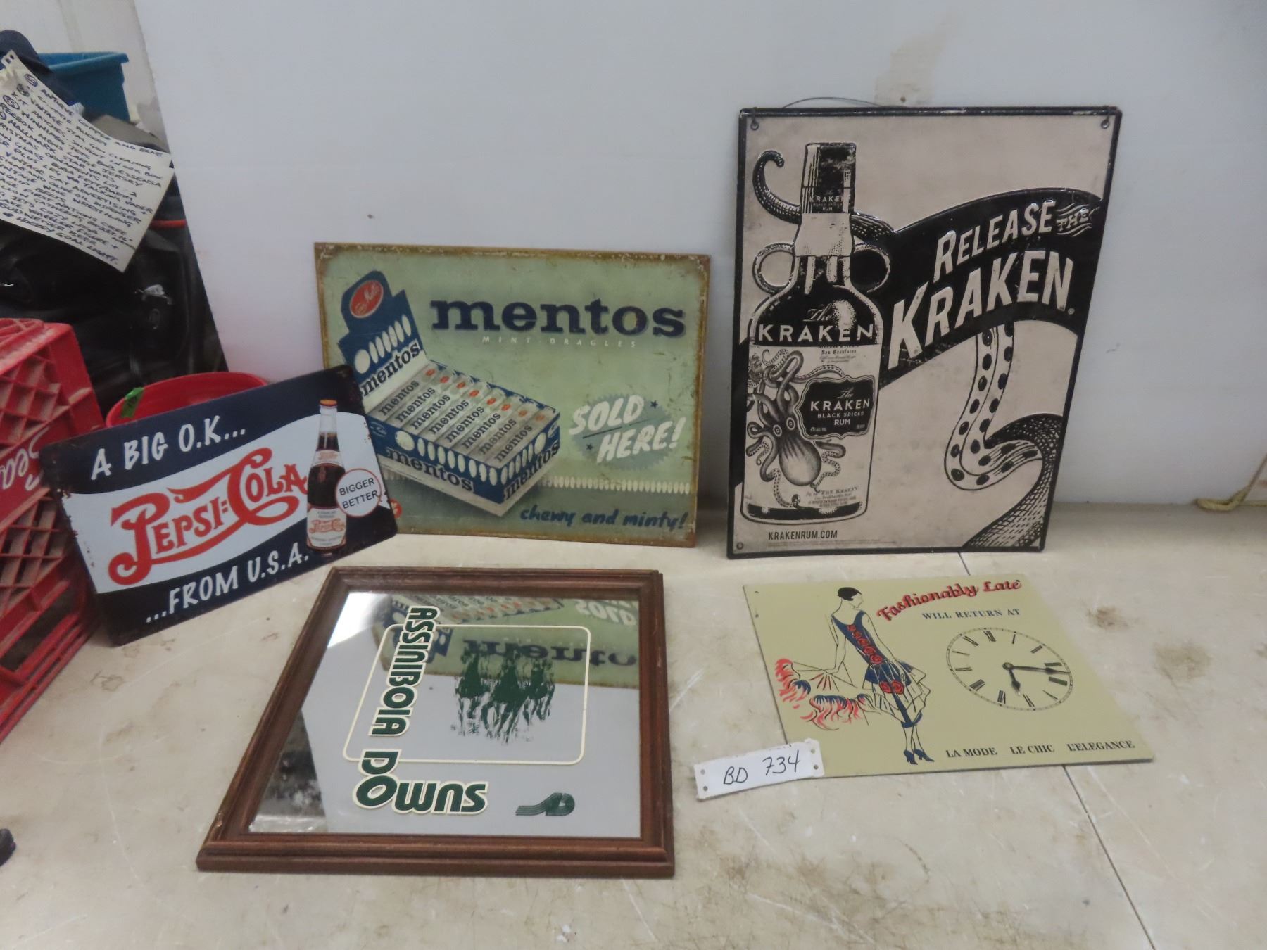 Assorted Advertising Signs (Mentos, Pepsi, Kraken, Assiniboia Downs, and More); Largest Approx. 18" x 14"