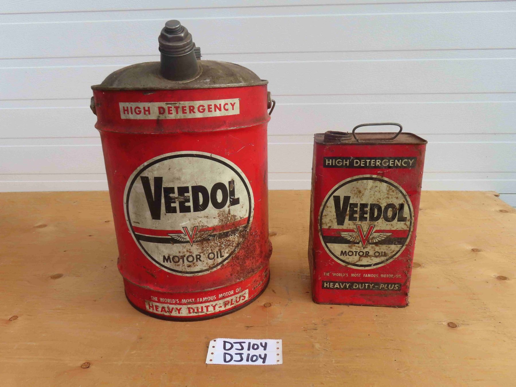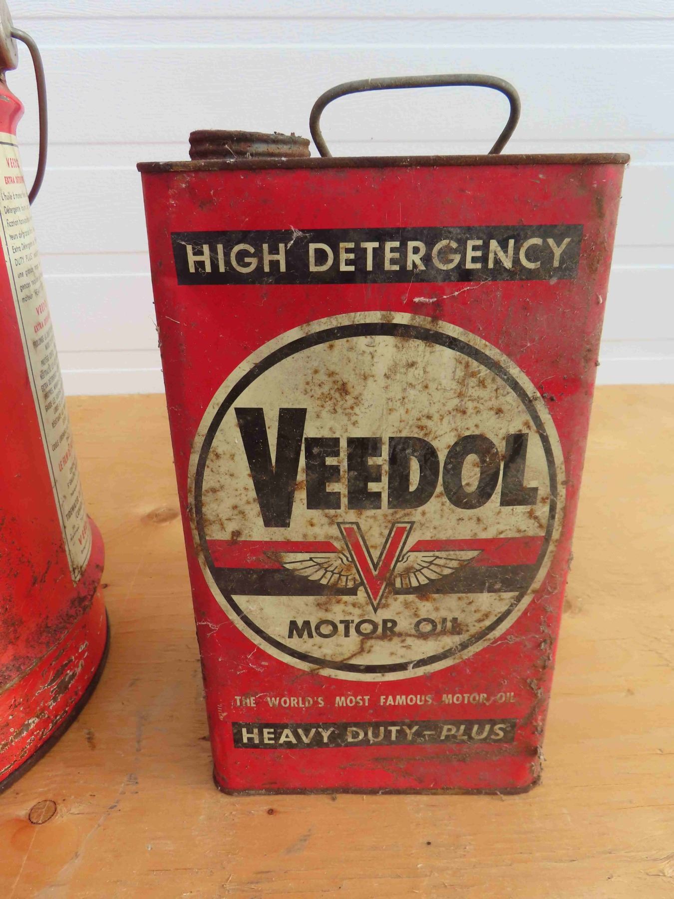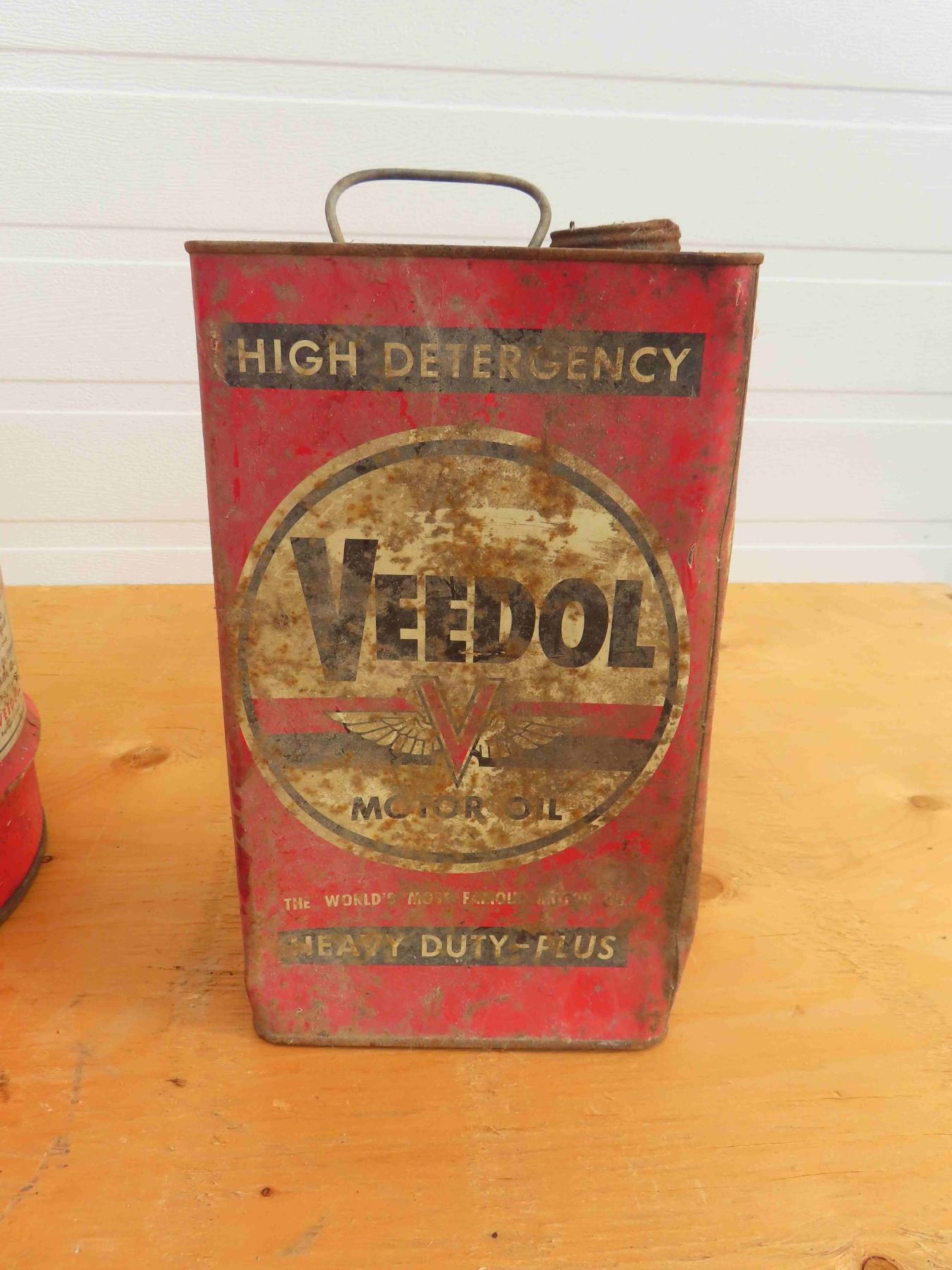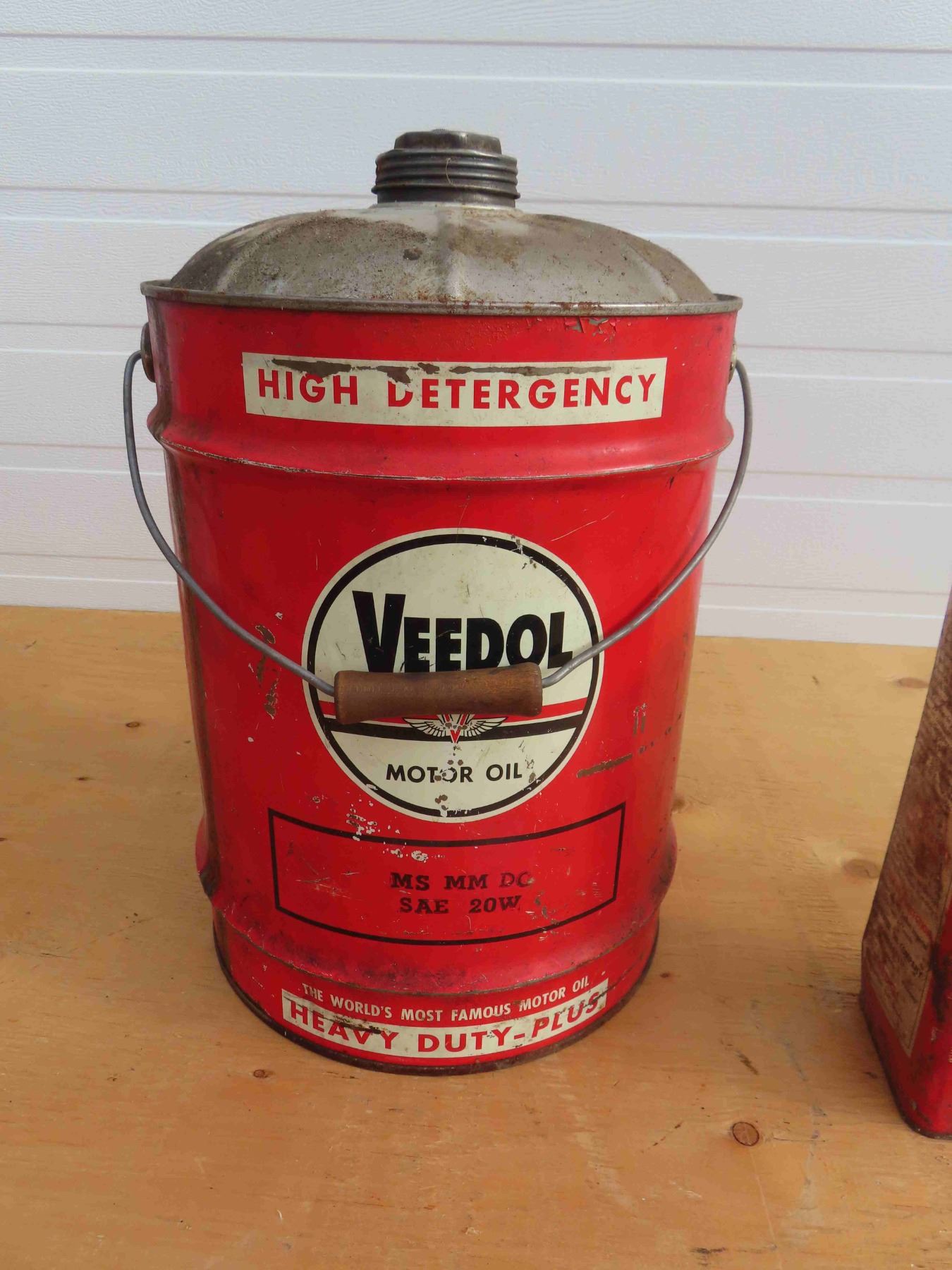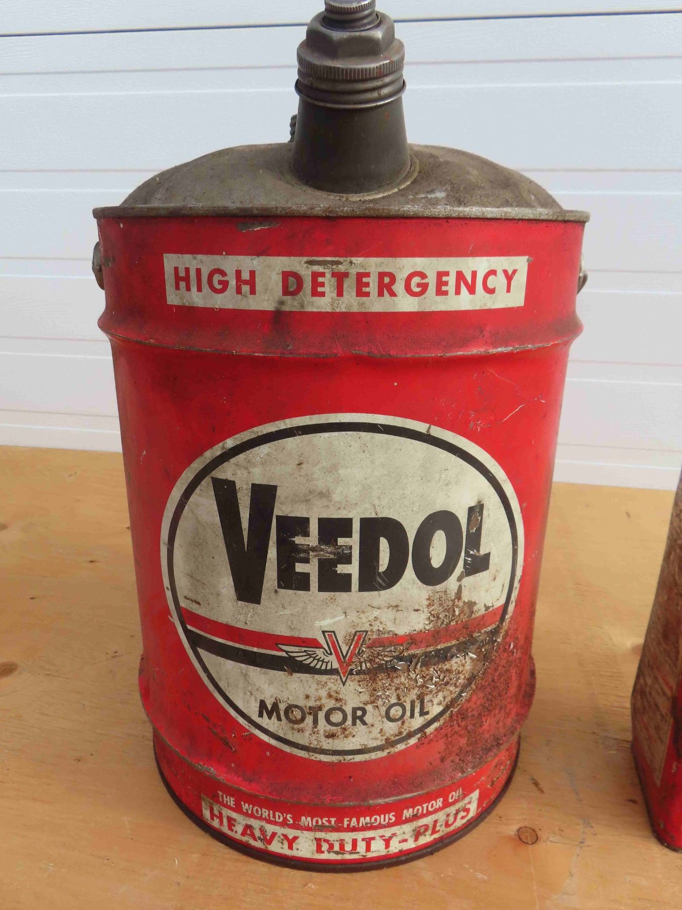 Veedol 5 Gal + 1 Gal Oil Tins - 5 Gal Has Wood Handle and Spout