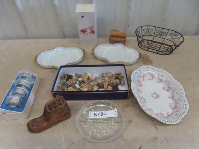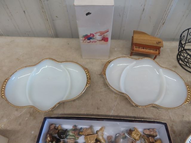 Vegetable Dicer, 50 Damaged Red Rose Tea Figurines, 2 Fire King Serving Dishes, Napkin Rings plus more