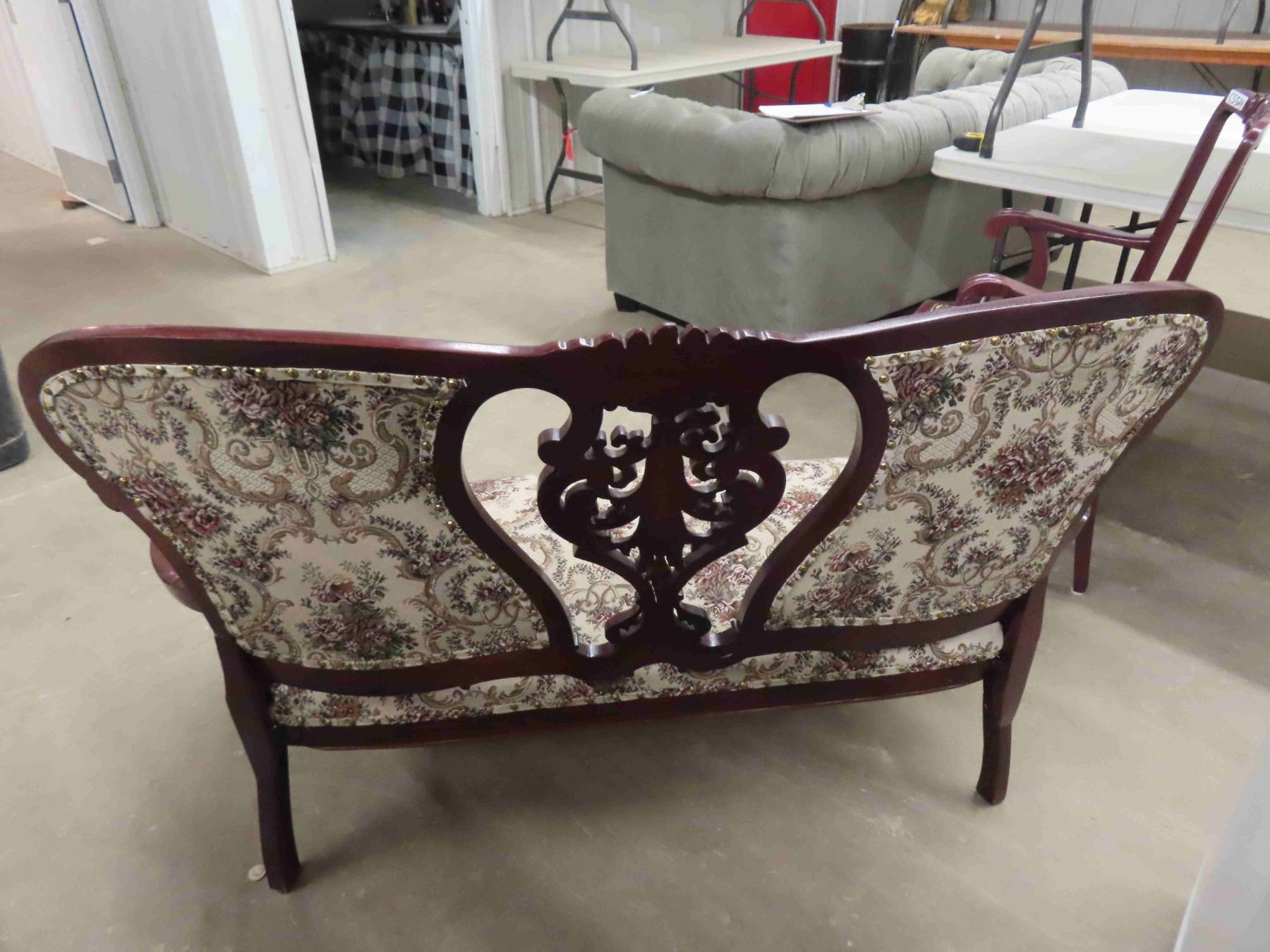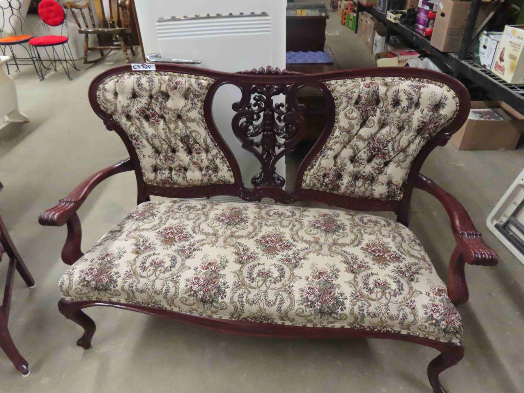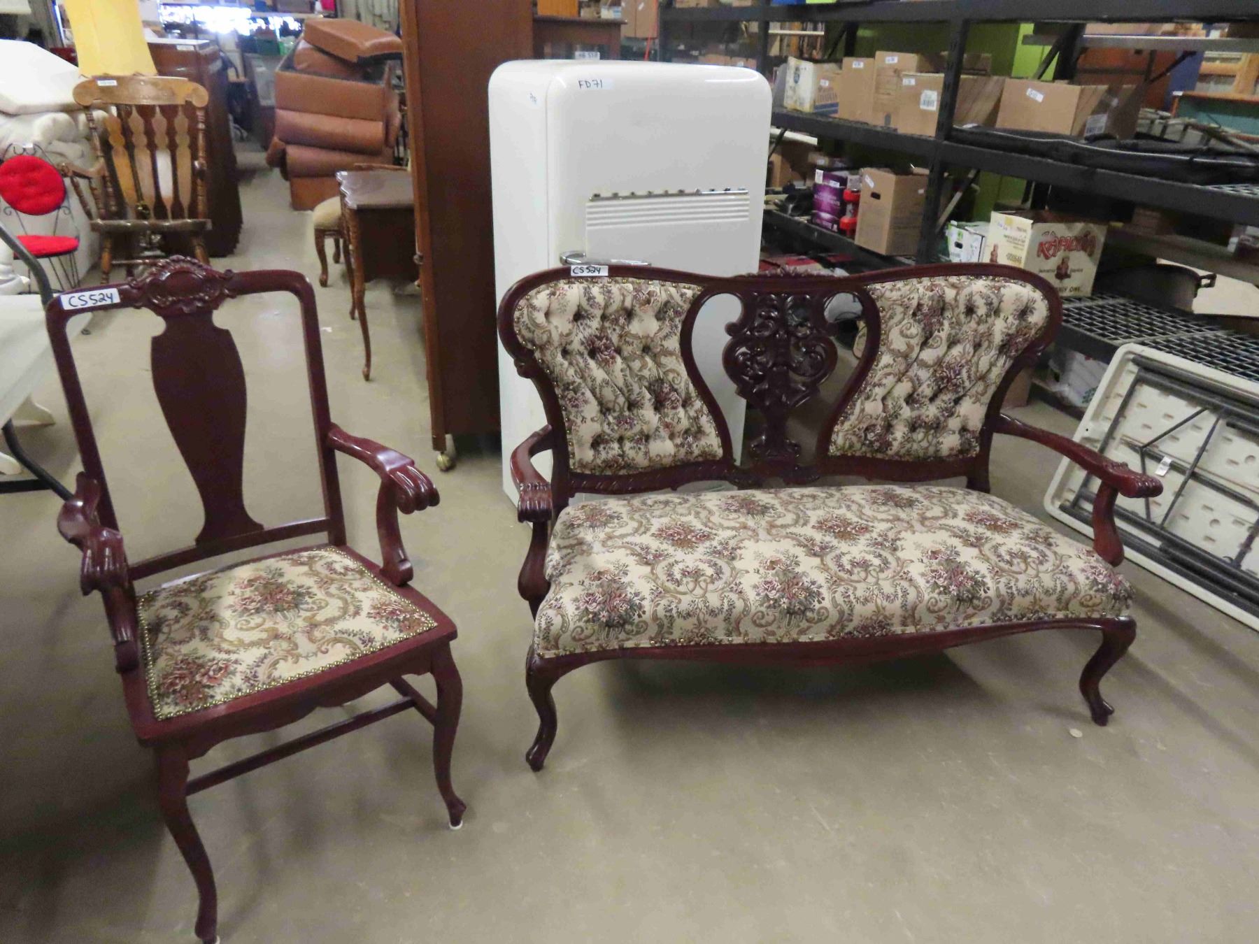 Very Detailed Carved Wood Cloth Covered Settee 54" Wide - Almost Matching Arm Chair