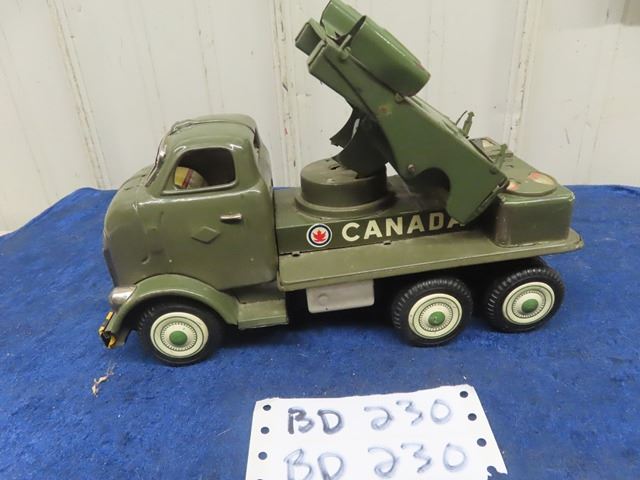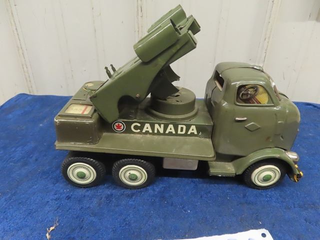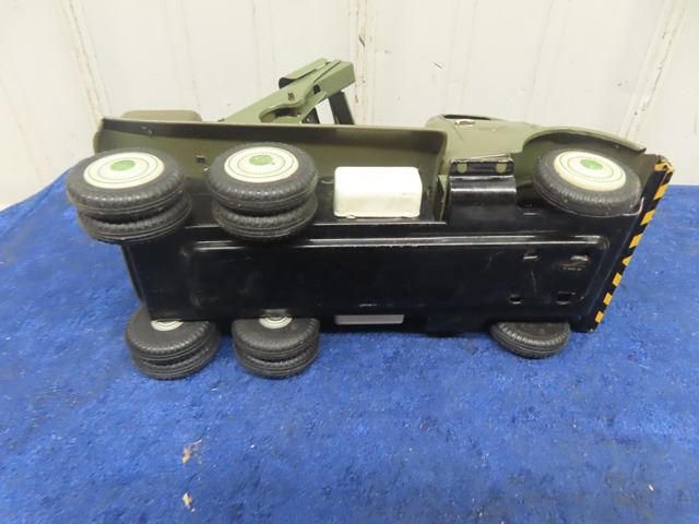 Very Rare 1960's Canada Military Rocket Launcher Tin GMC Friction Toy Truck 10" Long. Made in Japan by Yonezawa- Missing Rockets