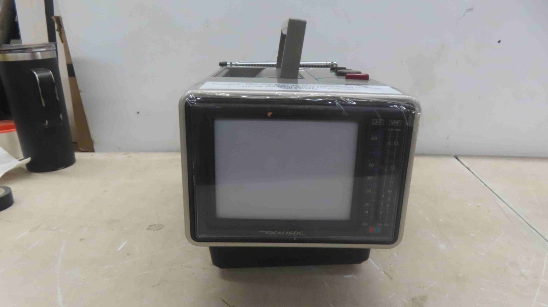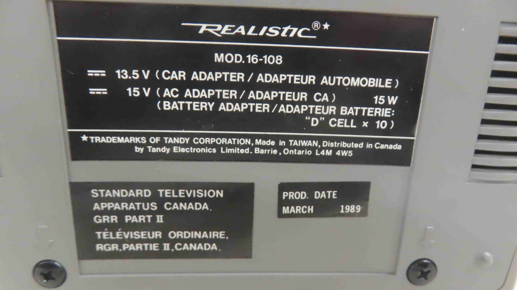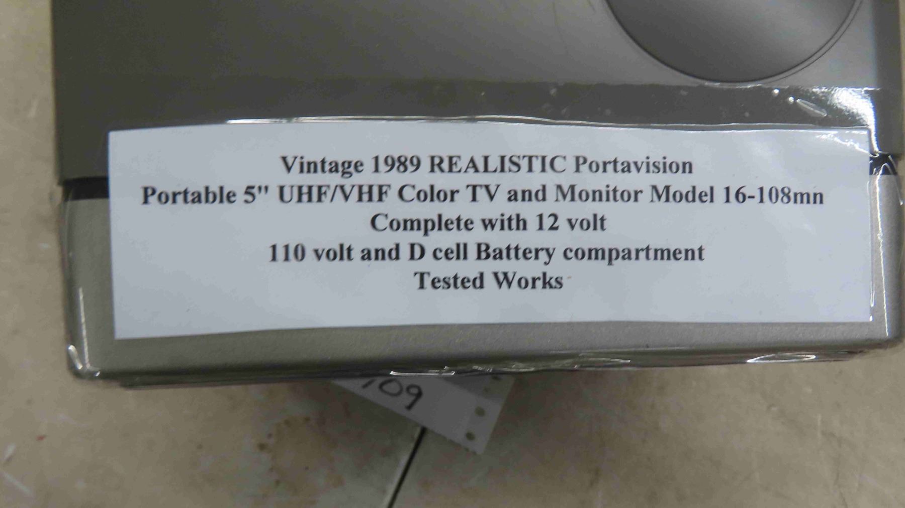 Vintage 1989 Realistic Portavision Portable 5'' UHF/VHF Colour TV + Monitor Model 16-108 MN Complete with 12V , 100V & D Cell Battery Compartment - Tested, Works