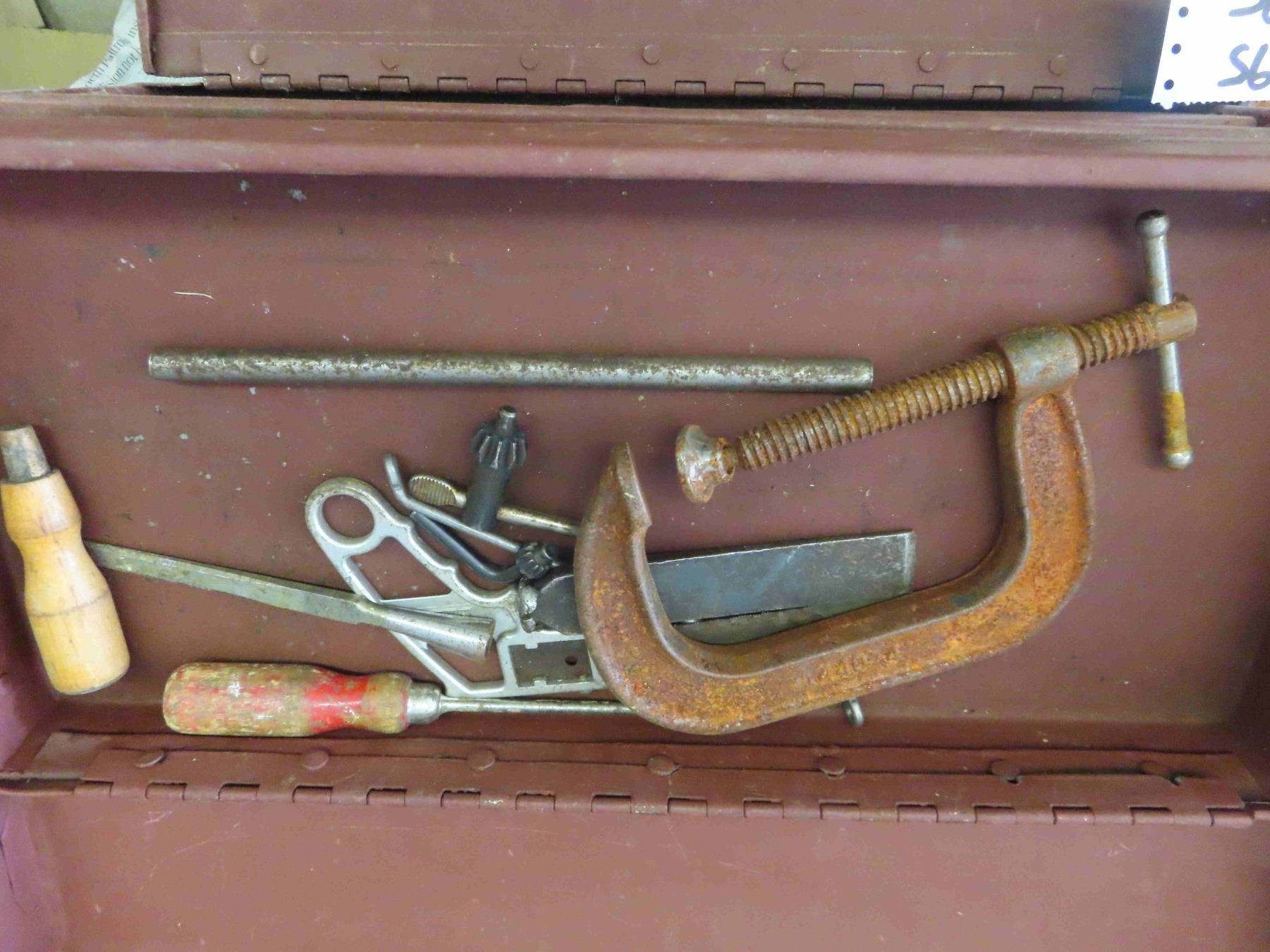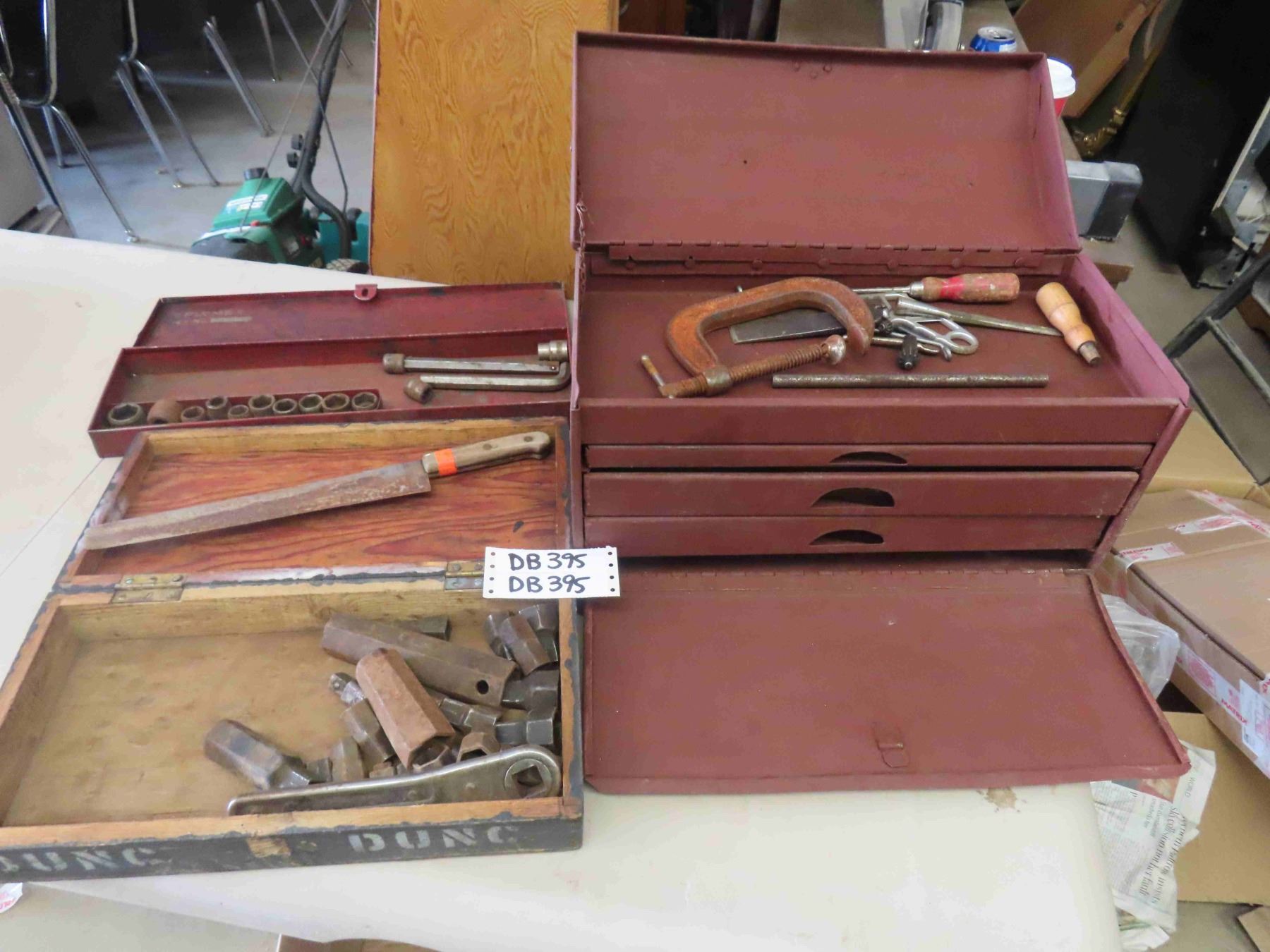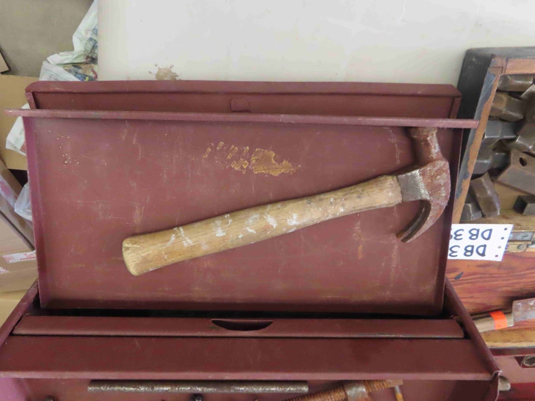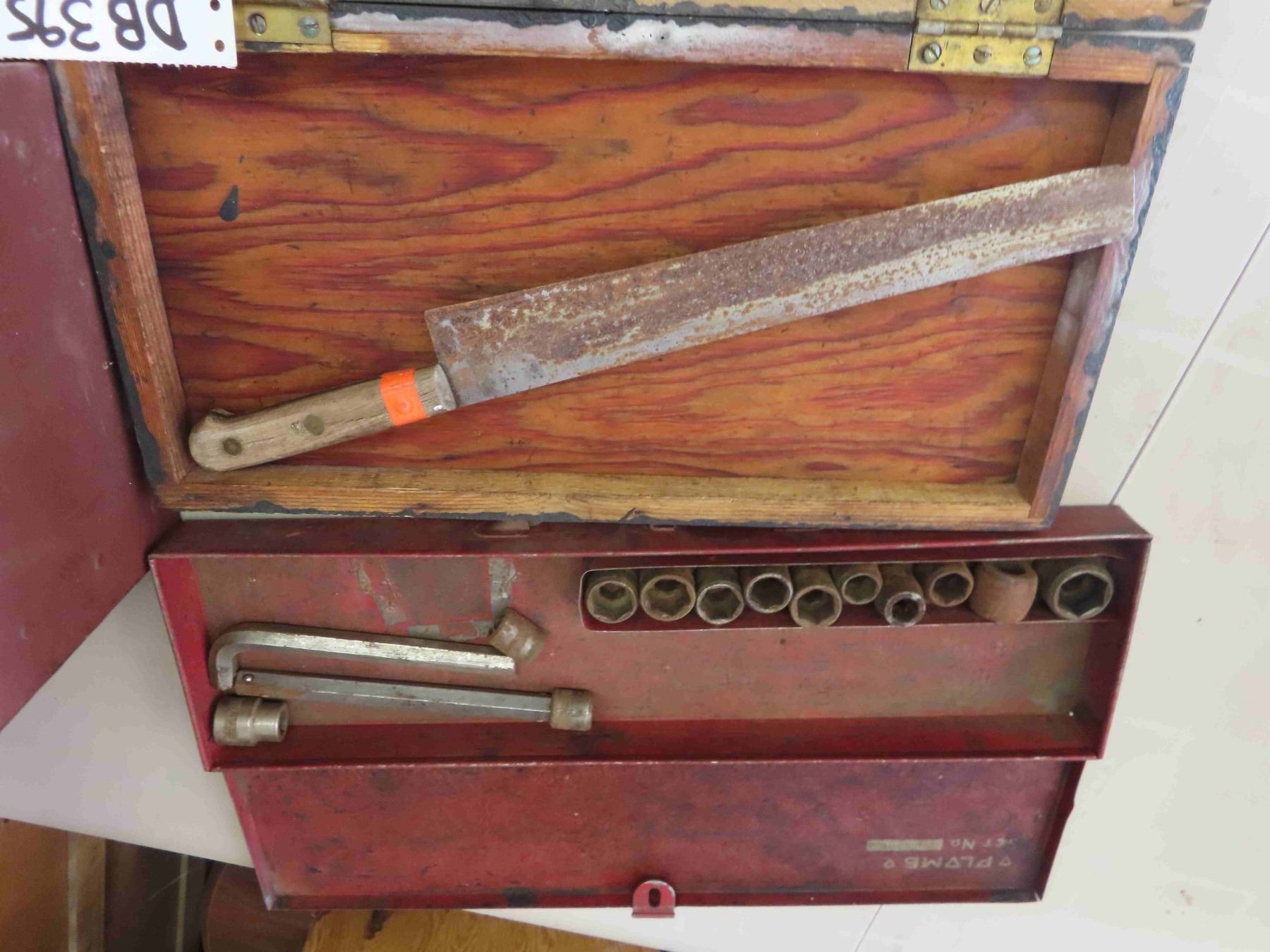 Vintage 3 Drawer Metal Tool Box, Wooden Box with Early Socket Set, Plumb Socket Set in Metal Case