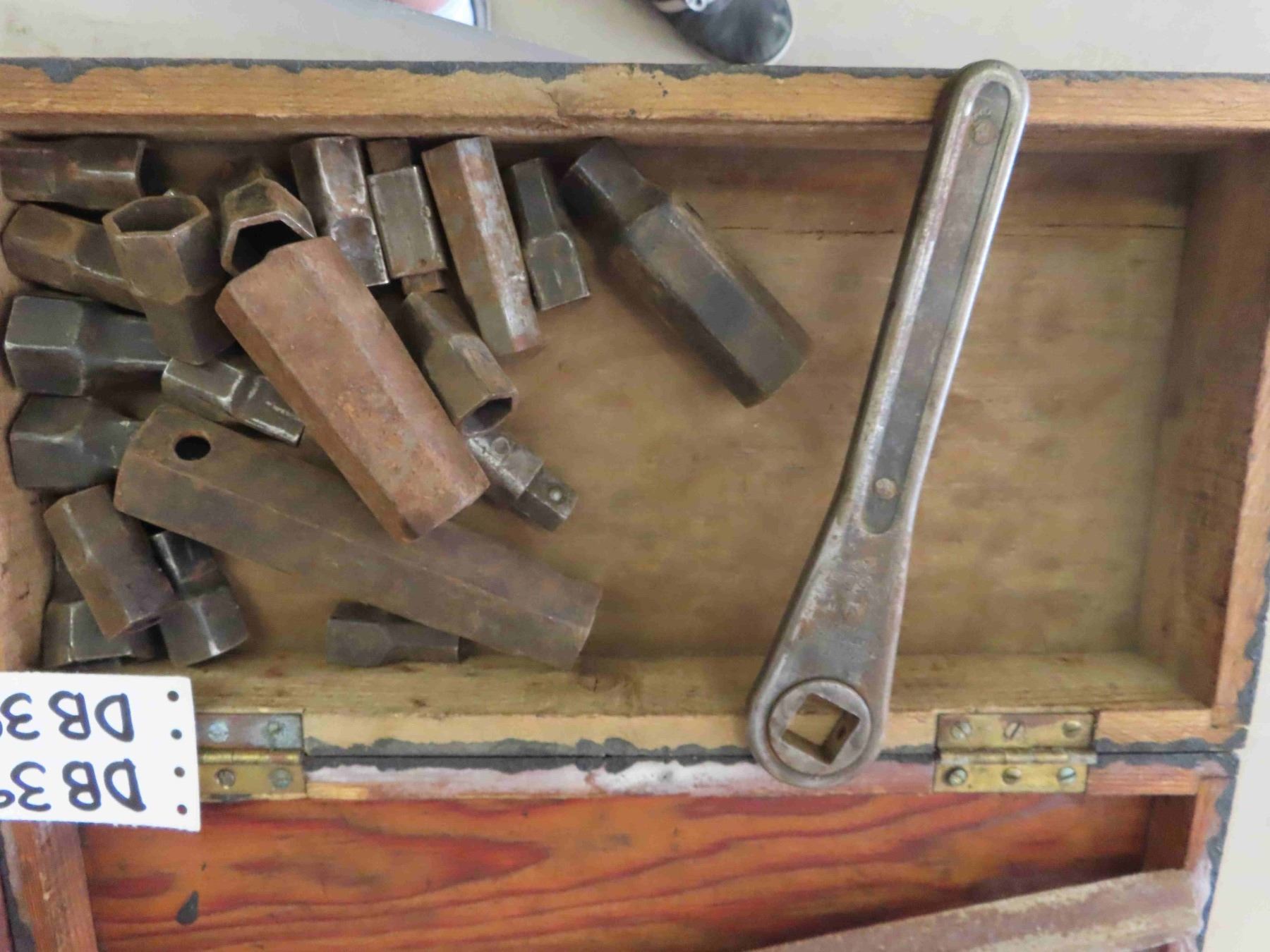 Vintage 3 Drawer Metal Tool Box, Wooden Box with Early Socket Set, Plumb Socket
