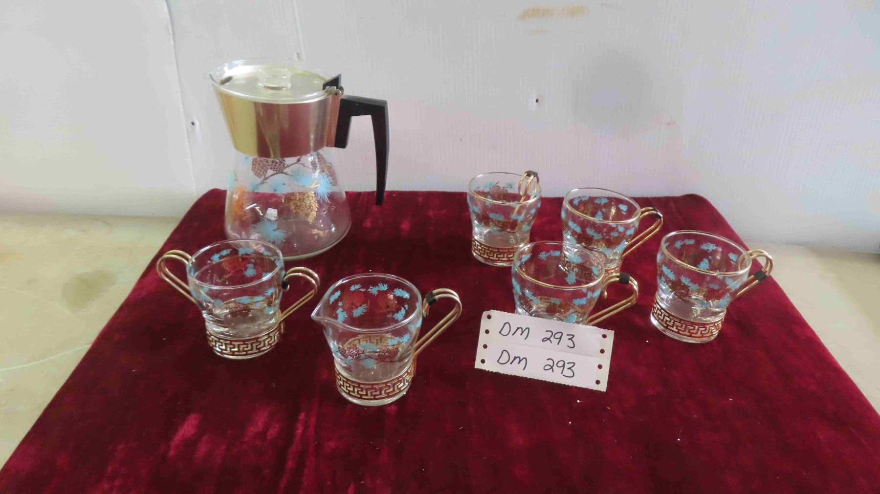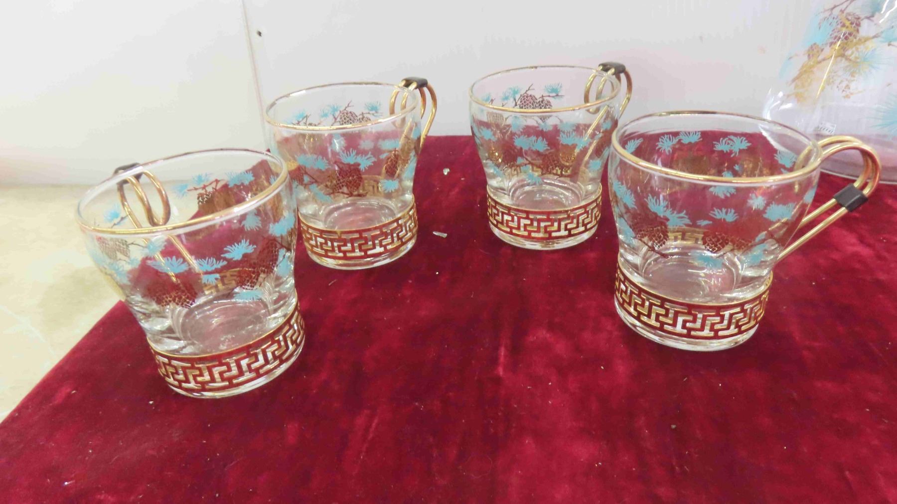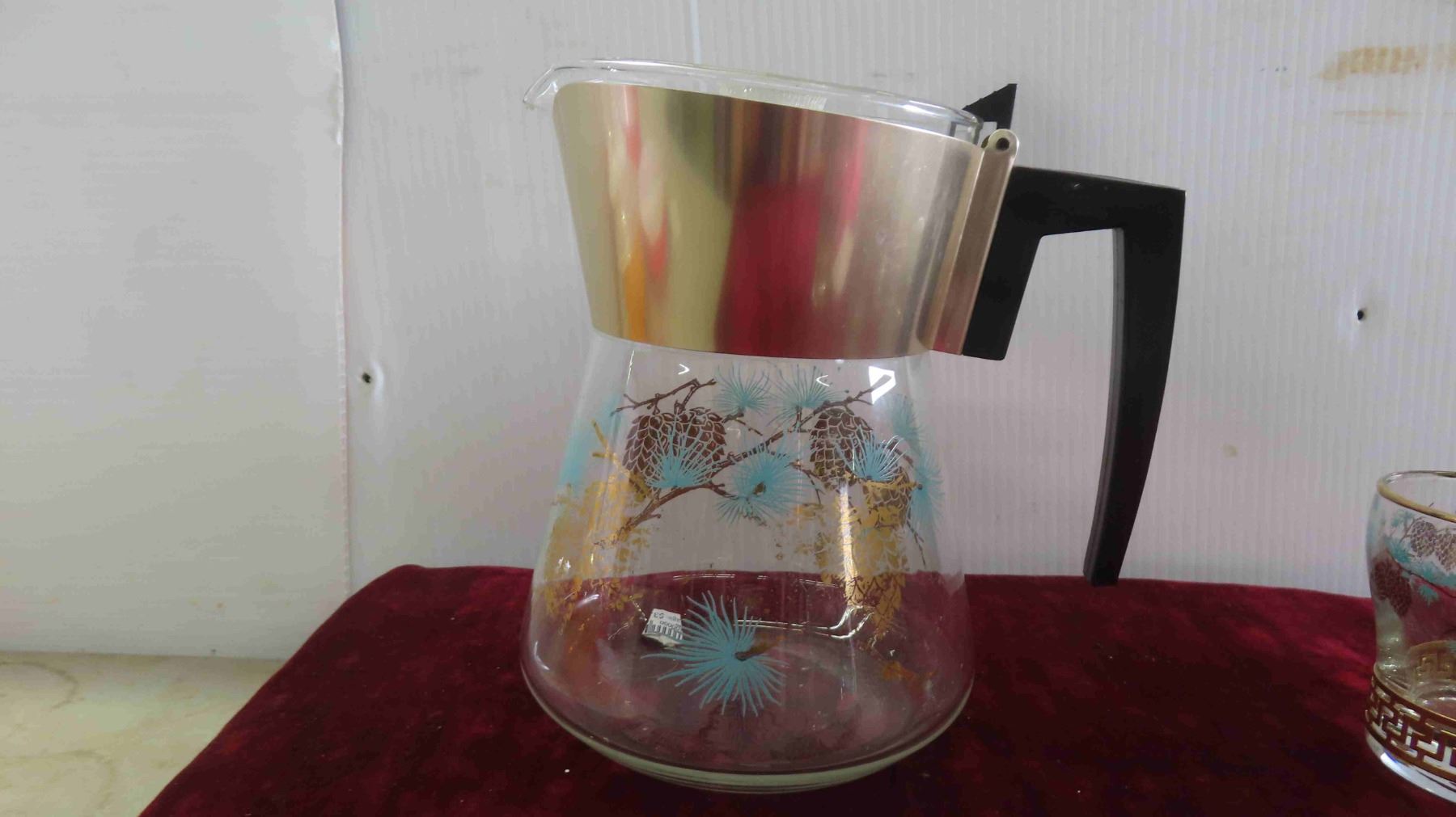 Vintage 7 Piece Gold Greek Key Turquoise Pine Cone Pattern Set : Coffee Pot, Cream and Sugar, 4 Cups