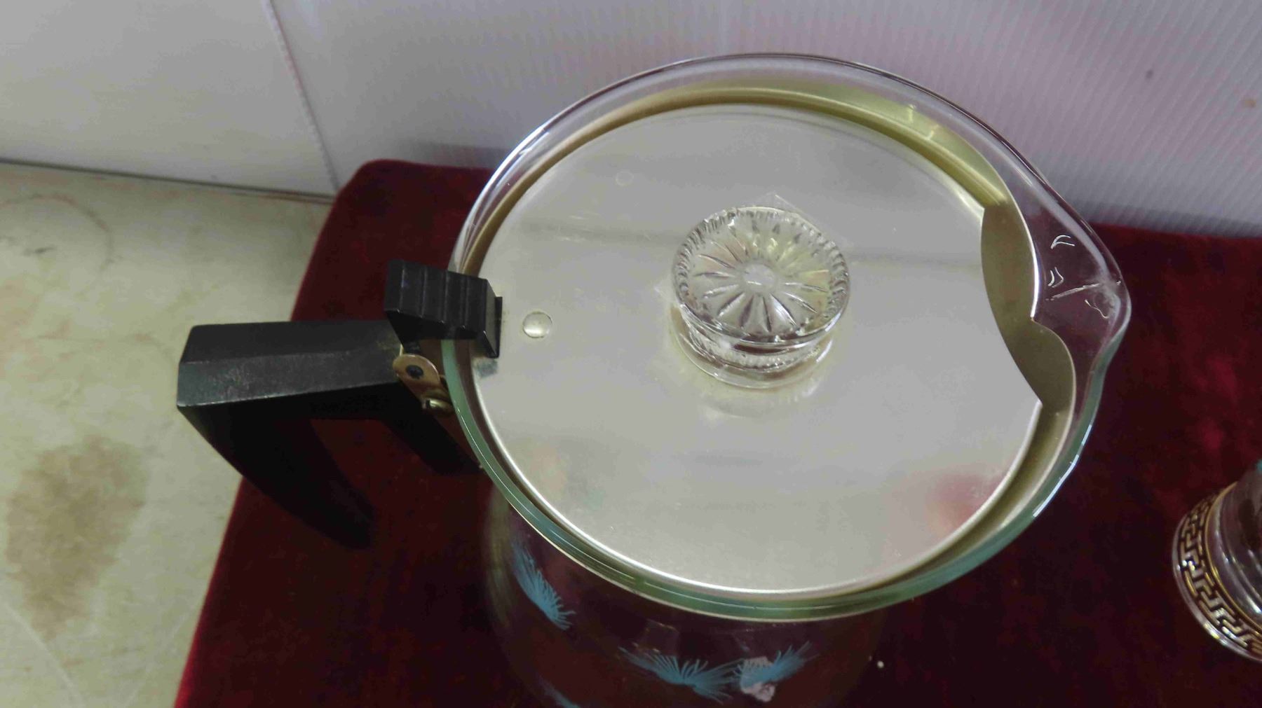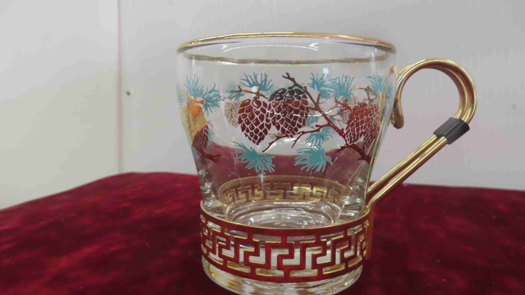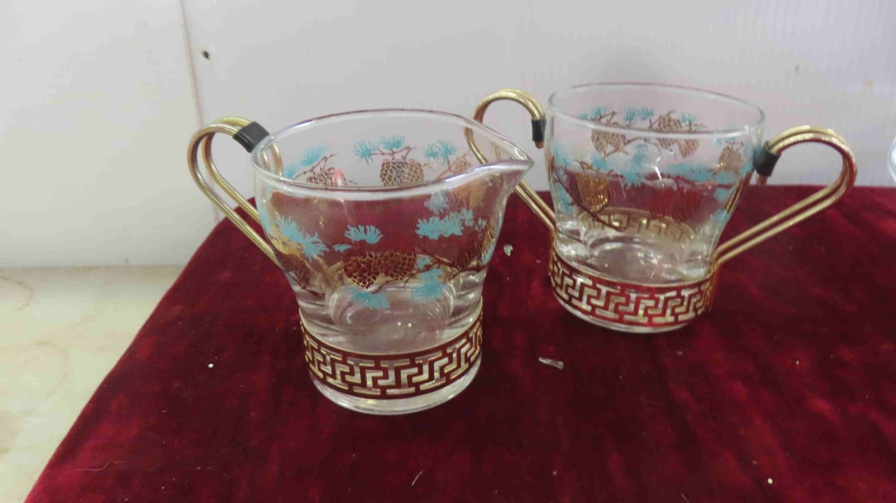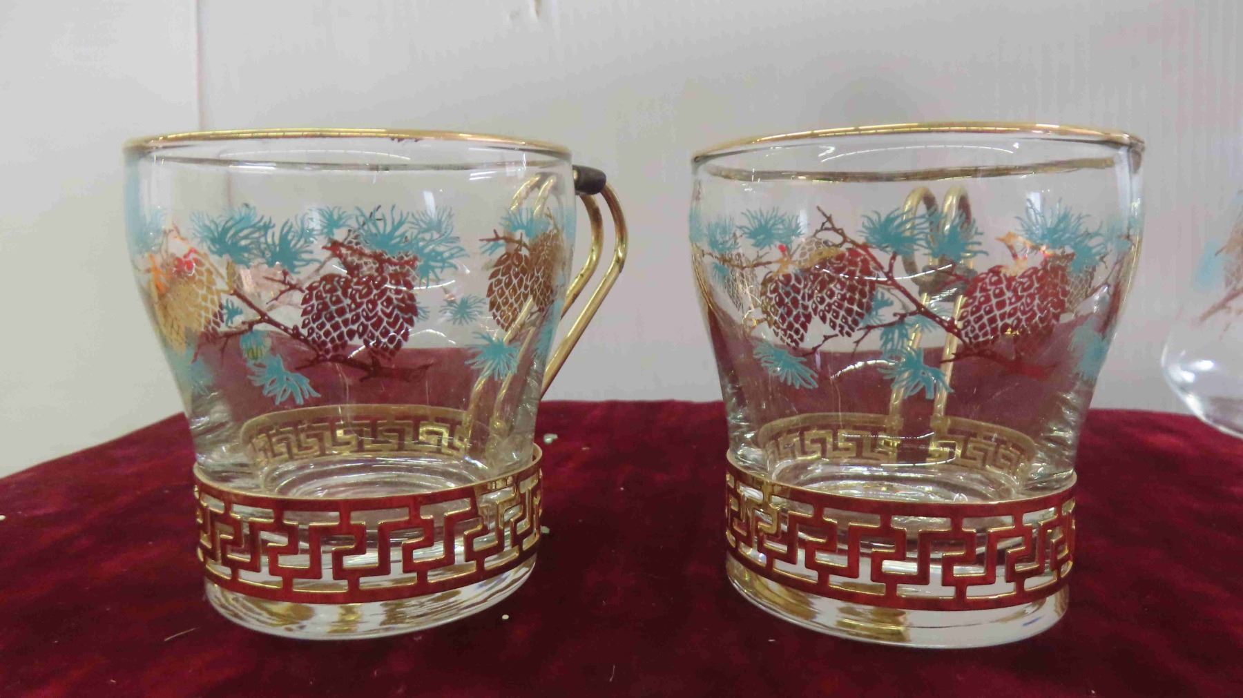 Vintage 7 Piece Gold Greek Key Turquoise Pine Cone Pattern Set : Coffee Pot, Cream and Sugar, 4 Cups